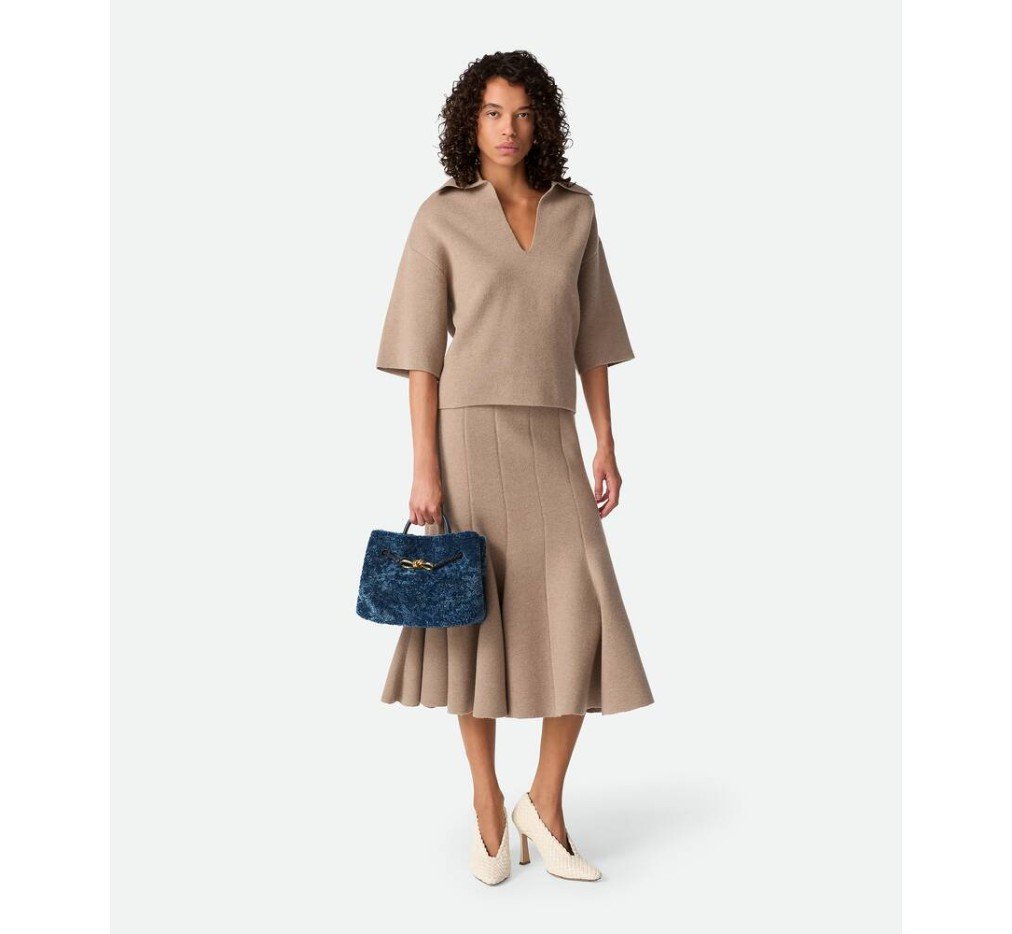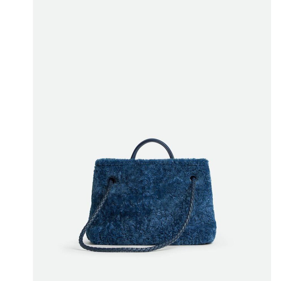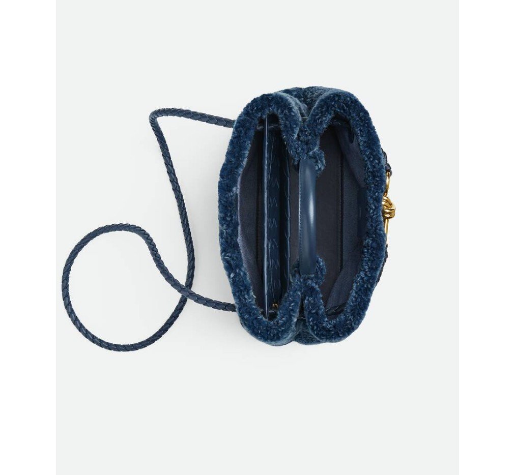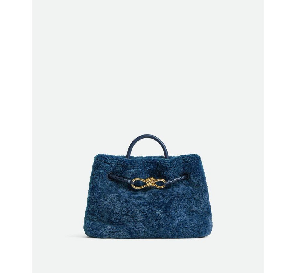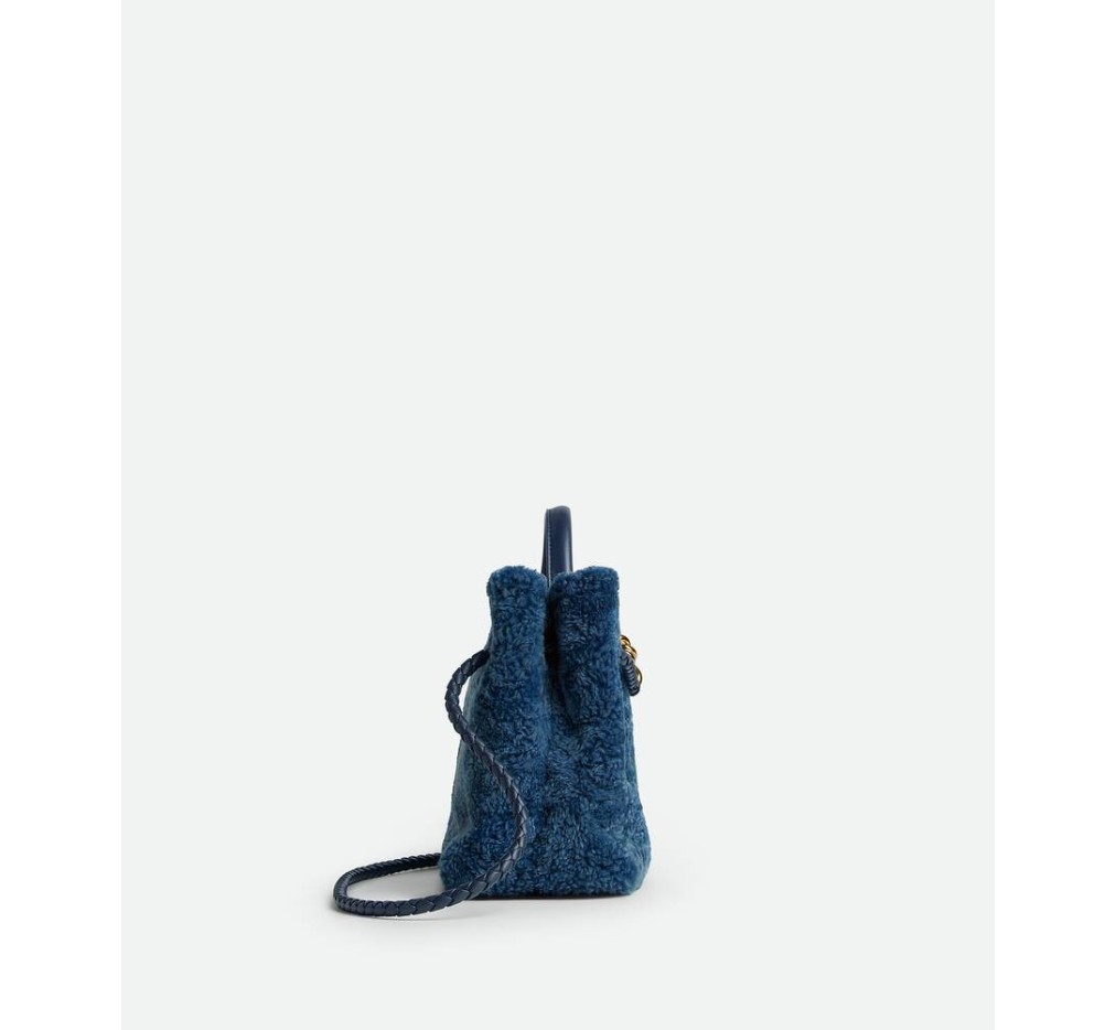 데님 효과가 가미된 메리노 시어링 탑 핸들 백. 시그니처 매듭 디테일과 슬라이딩 크로스바디 스트랩이 특징입니다.– 스몰 메리노 시어링 탑 핸들백 (슬라이딩 크로스바디 스트랩 포함)