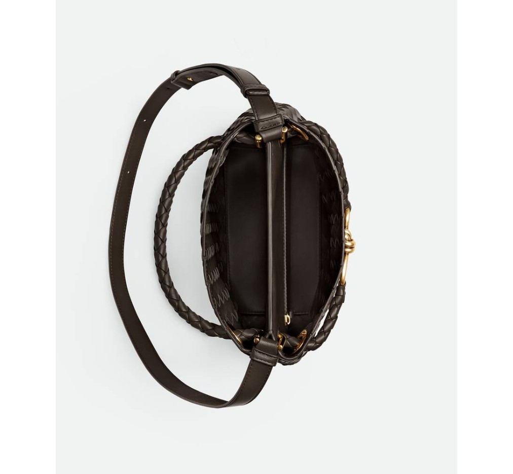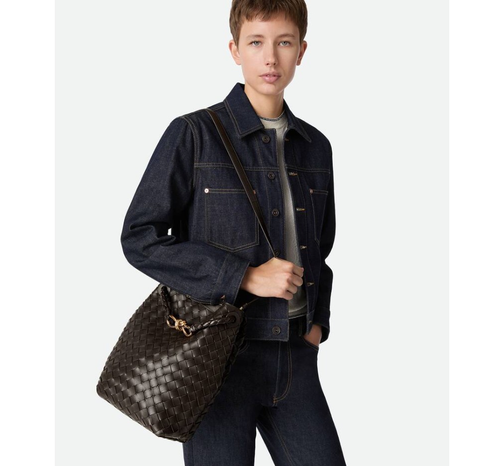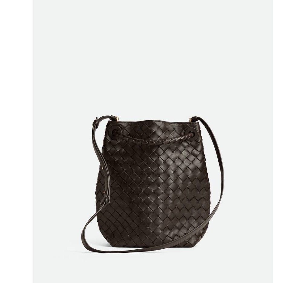 시그니처 매듭 디테일과 슬라이딩 숄더 스트랩이 있는 부드러운 인트레치아토 가죽 소재의 버킷 백입니다.– 스몰 인트레치아토 가죽 버킷백 (슬라이딩 숄더 스트랩 포함)