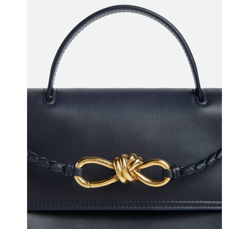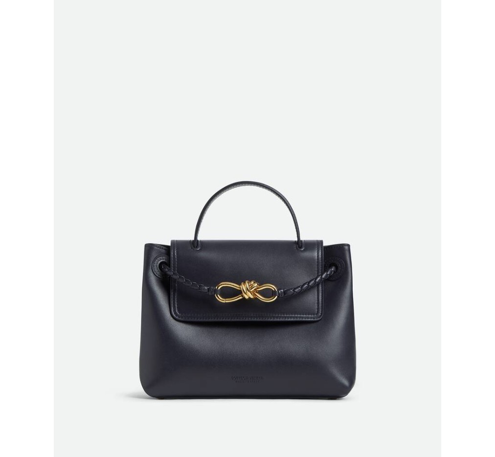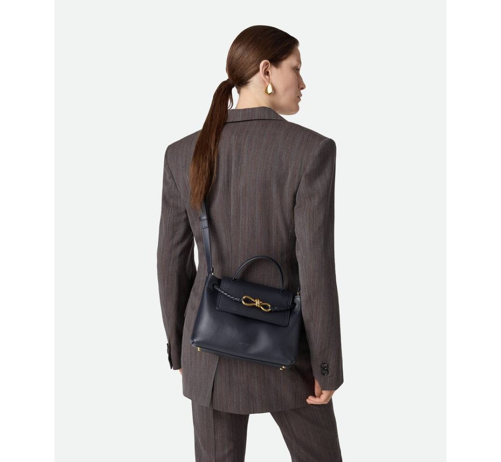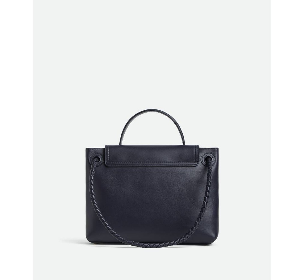 부드러운 송아지 가죽 소재의 탑 핸들 백으로, 양방향 플랩과 시그니처 매듭 디테일이 특징입니다. 숨겨진 후크 잠금 장치가 있어 플랩을 앞쪽에서 닫거나 내부 인트레치아토 포켓에 연결할 수 있습니다.– 스몰 실키 송아지 가죽 탑 핸들 백 (투웨이 플랩)