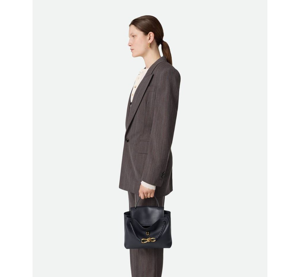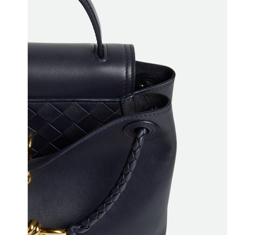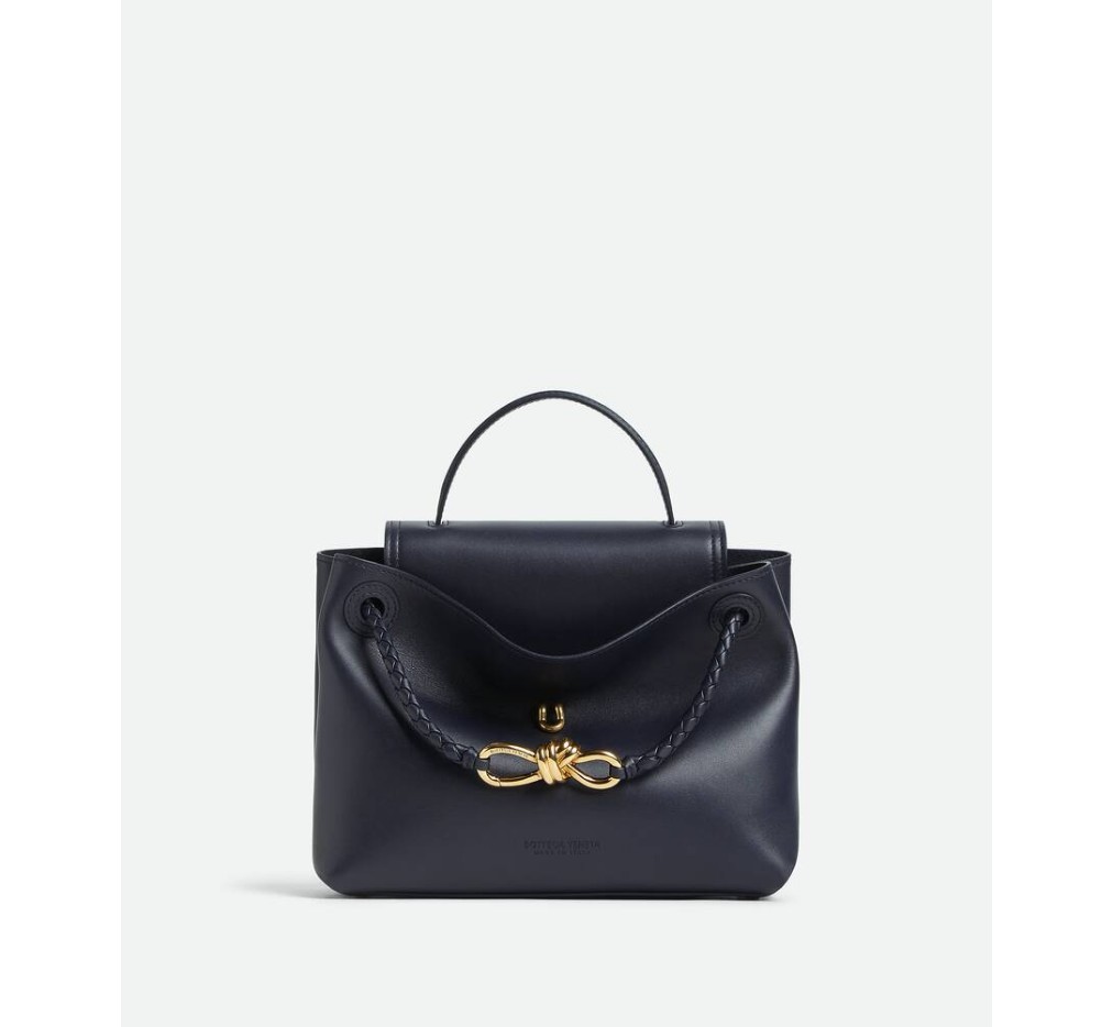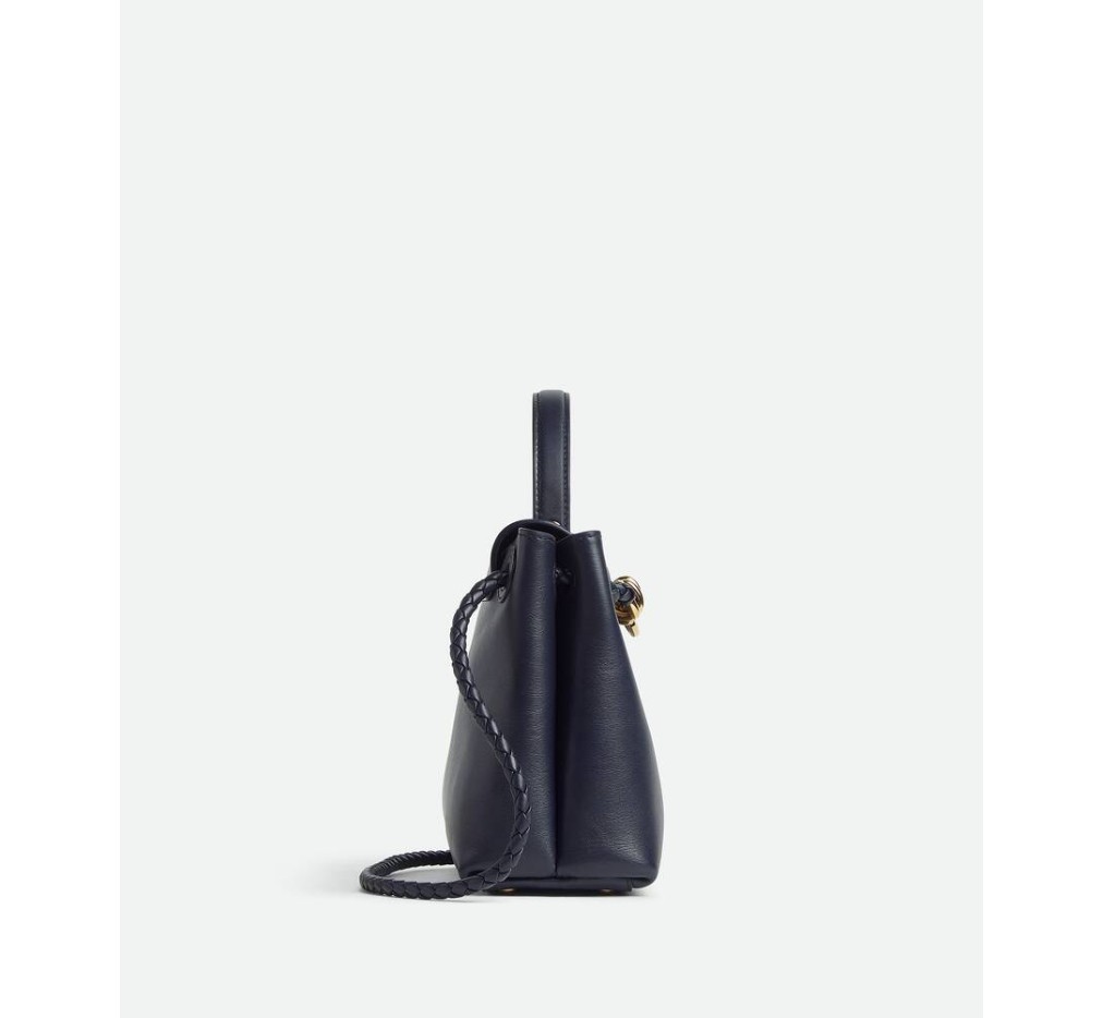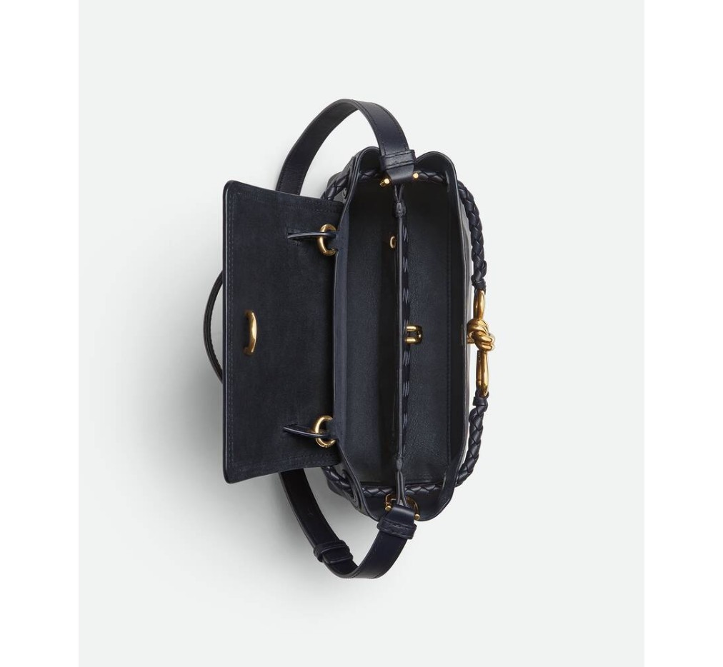 부드러운 송아지 가죽 소재의 탑 핸들 백으로, 양방향 플랩과 시그니처 매듭 디테일이 특징입니다. 숨겨진 후크 잠금 장치가 있어 플랩을 앞쪽에서 닫거나 내부 인트레치아토 포켓에 연결할 수 있습니다.– 스몰 실키 송아지 가죽 탑 핸들 백 (투웨이 플랩)