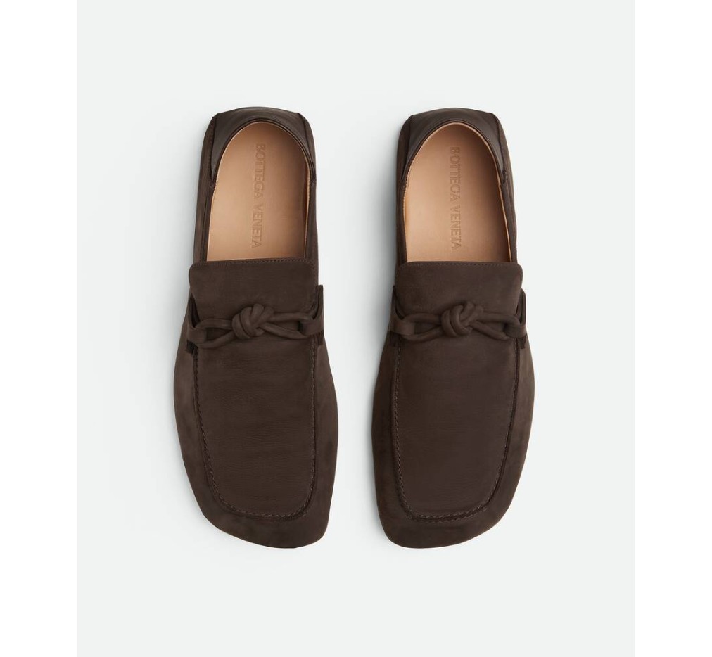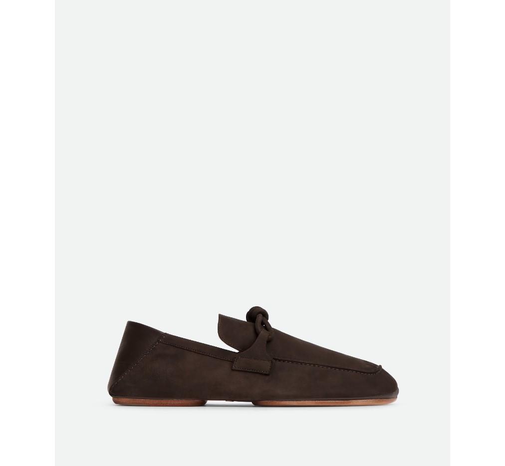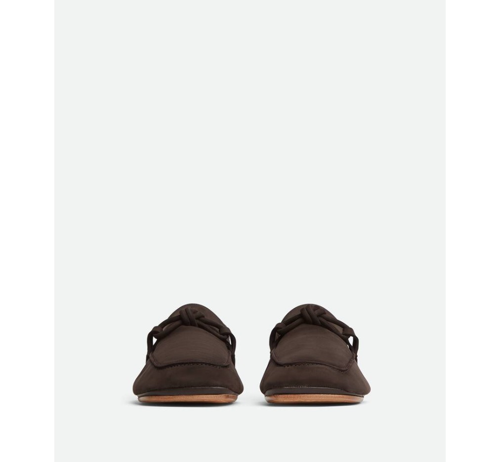 누벅 가죽 소재의 로퍼. 접이식 뒷꿈치와 시그니처 가죽 매듭 디테일이 특징입니다. 두 부분으로 스티치된 가죽 밑창이 특징입니다.– 접이식 백이 달린 누벅 가죽 로퍼
