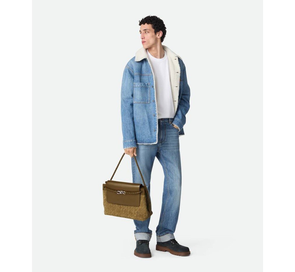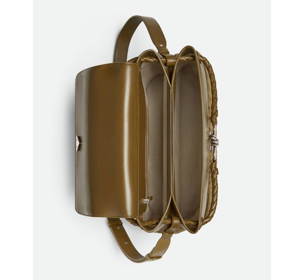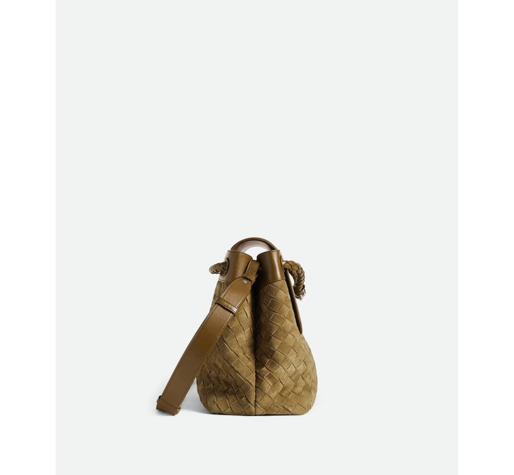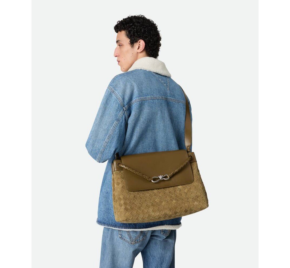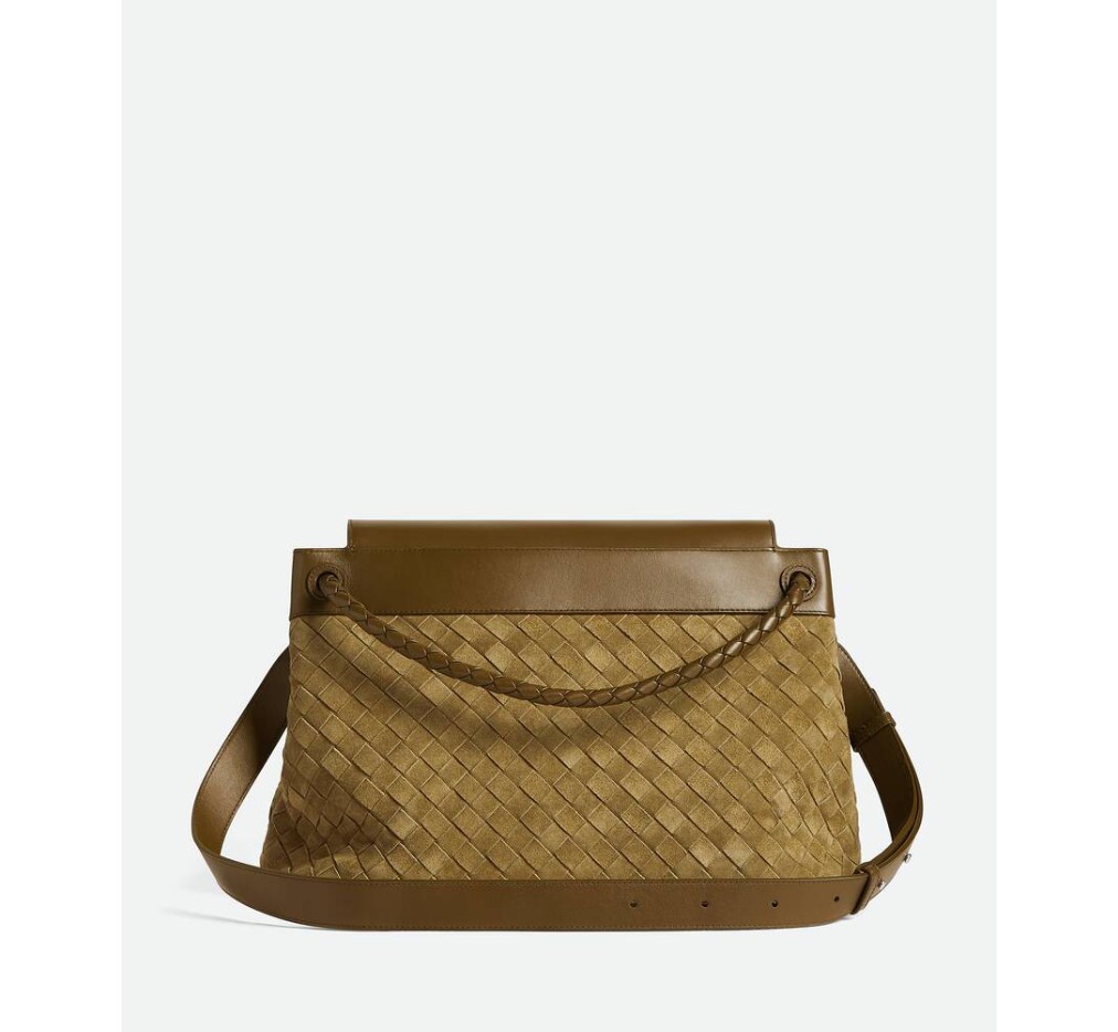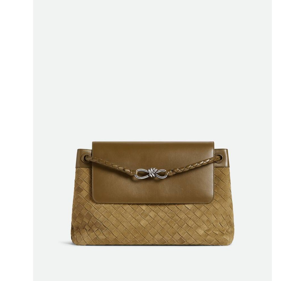 인트레치아토 스웨이드와 가죽으로 만든 메신저 백으로, 시그니처 매듭 디테일이 특징이며, 조절 및 분리가 가능한 크로스바디 스트랩이 특징입니다.