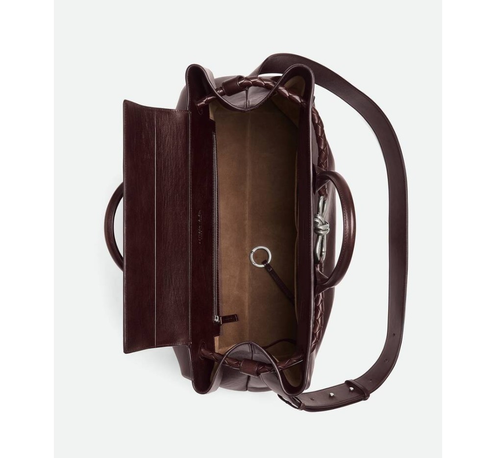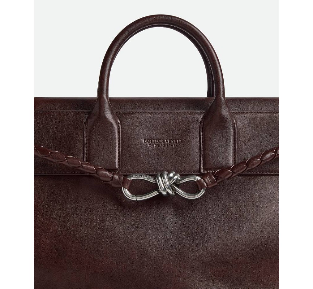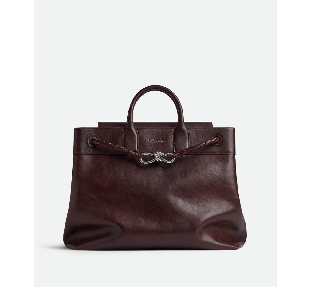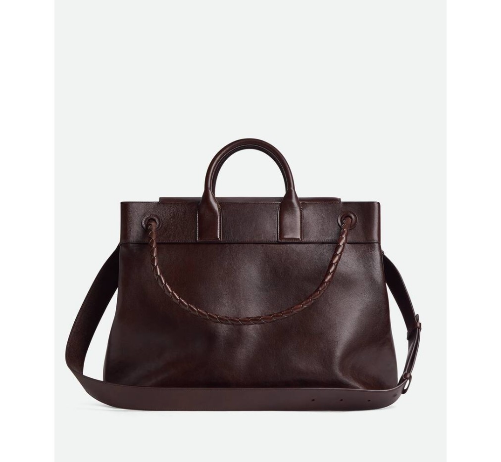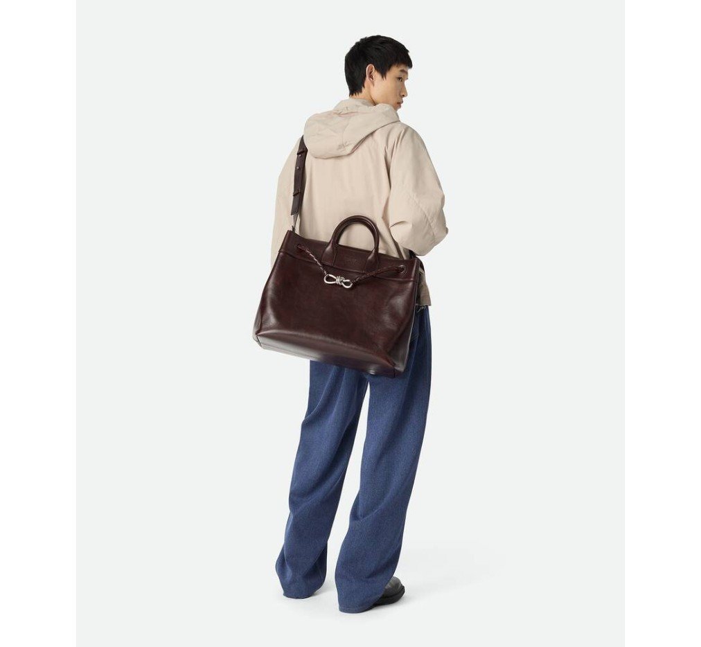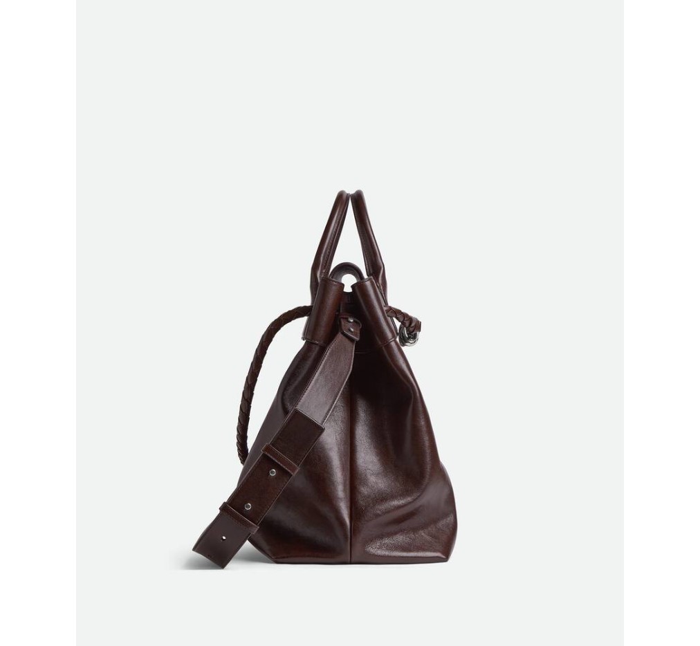 풍화된 가죽으로 만든 주말 가방으로, 독특한 매듭 디테일이 특징이며, 조절 및 분리가 가능한 크로스바디 스트랩이 특징입니다.