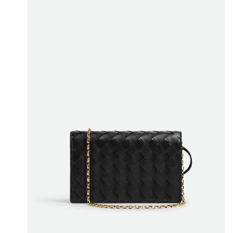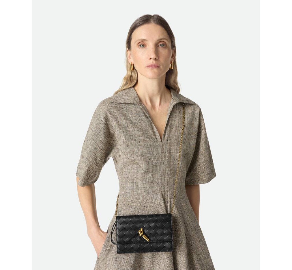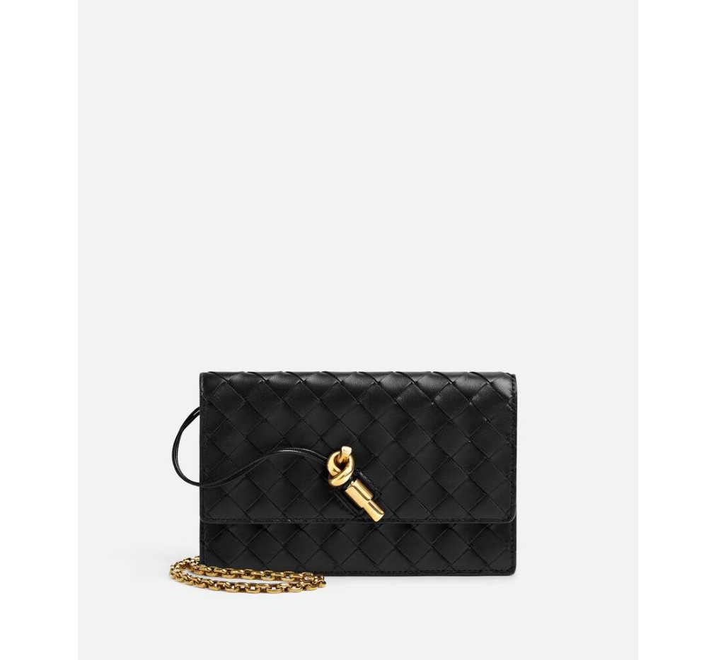 인트레치아토 나파 가죽 파우치, 시그니처 매듭 잠금 장치와 금속 체인 포함.