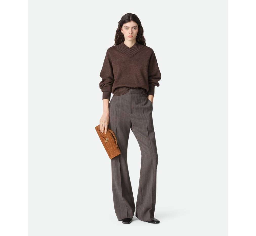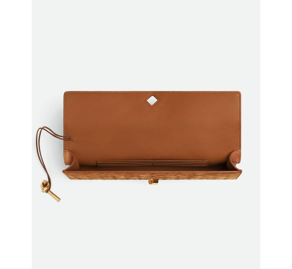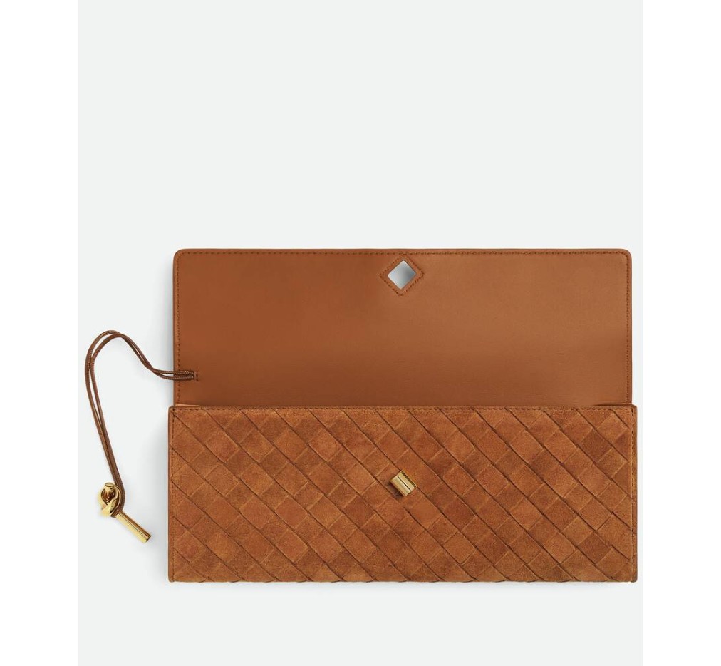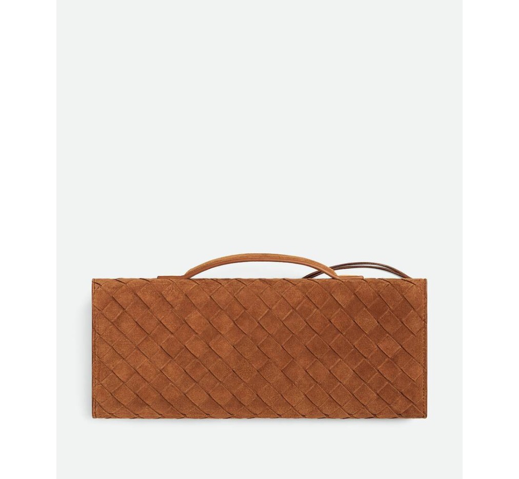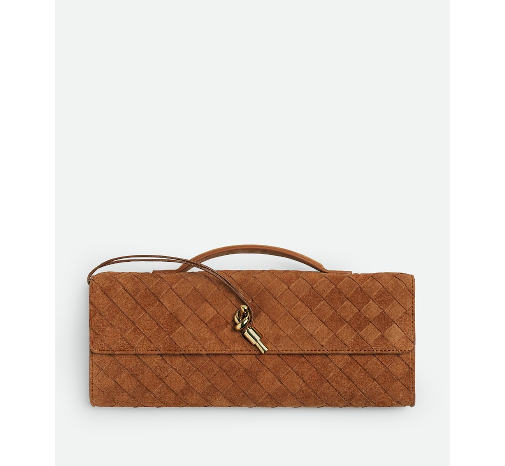 인트레치아토 스웨이드 소재의 탑 핸들 클러치로, 시그니처 매듭 잠금 장치가 특징입니다.