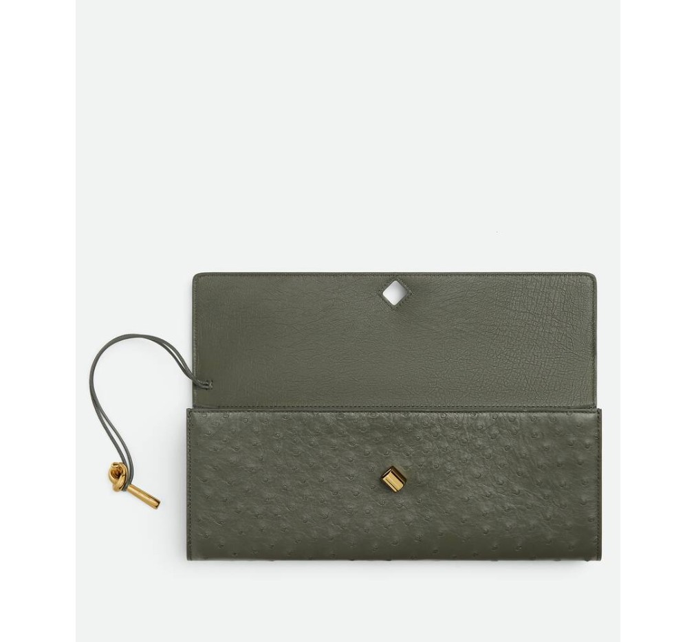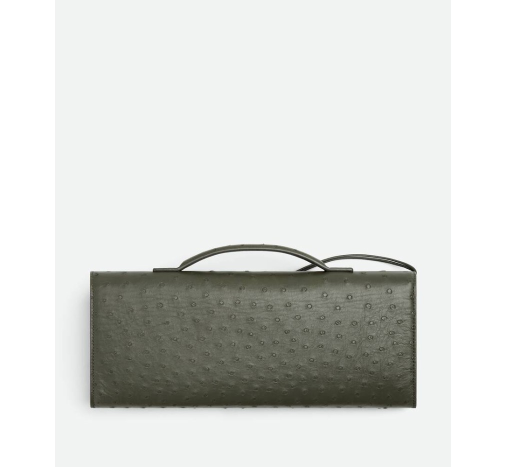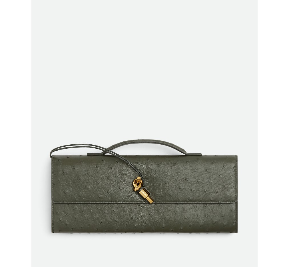 시그니처 매듭 잠금 장치가 있는 오스트리치 가죽 탑 핸들 클러치.– 오스트리치 메탈릭 매듭 잠금 장치가 있는 가죽 탑 핸들 클러치