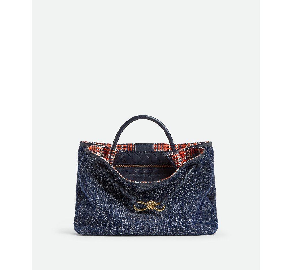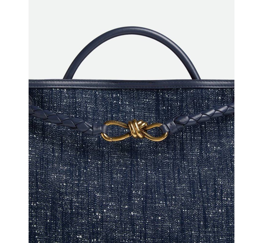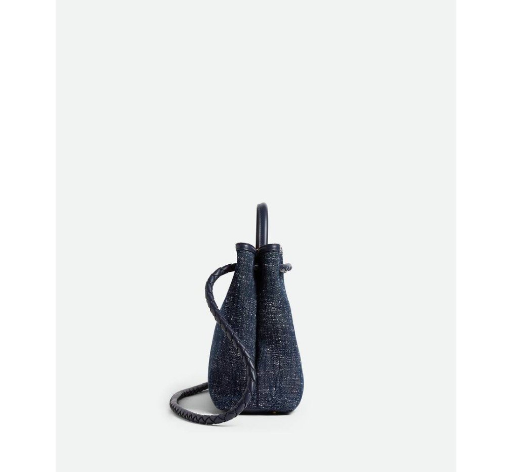 데님 부클레 탑 핸들 백으로, 시그니처 매듭 디테일과 슬라이딩 크로스바디 스트랩이 특징이며, 미니 인트레치아토 비시 양가죽 안감이 특징입니다.