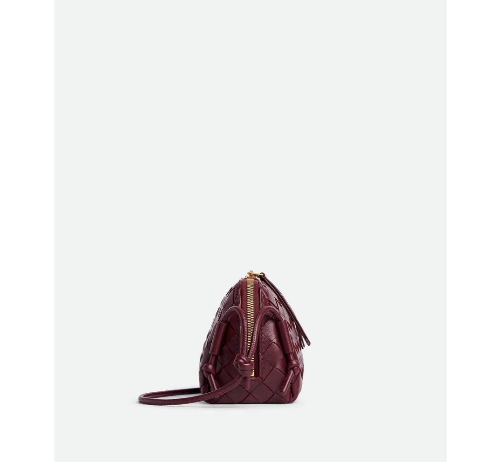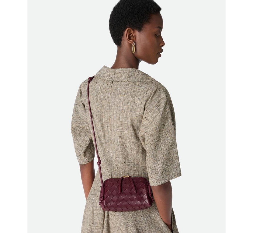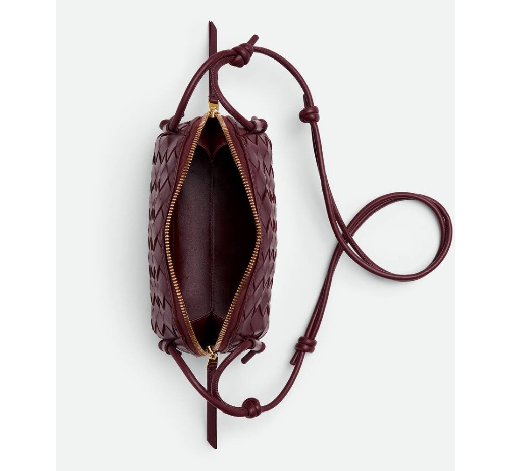 인트레치아토 나파 가죽 파우치, 슬라이딩 매듭 디테일이 특징인 조절 가능한 튜브형 스트랩.