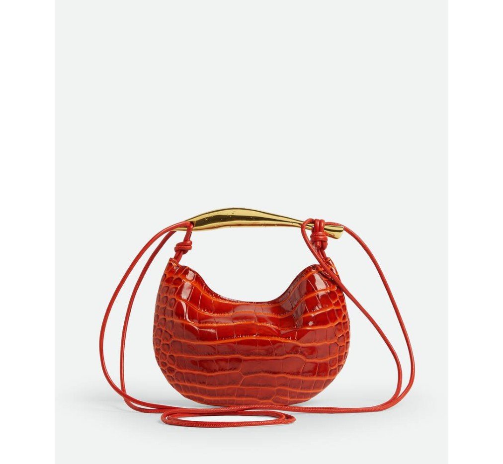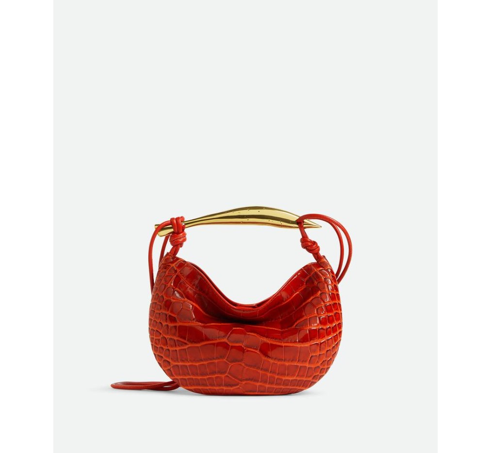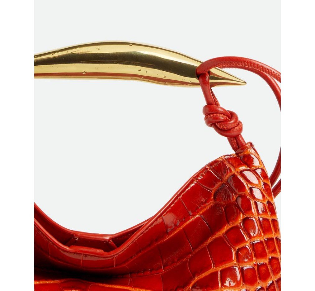 광택 마감과 조각품 같은 금속 상단 핸들이 달린 악어 가죽 소재의 크로스바디 백입니다.