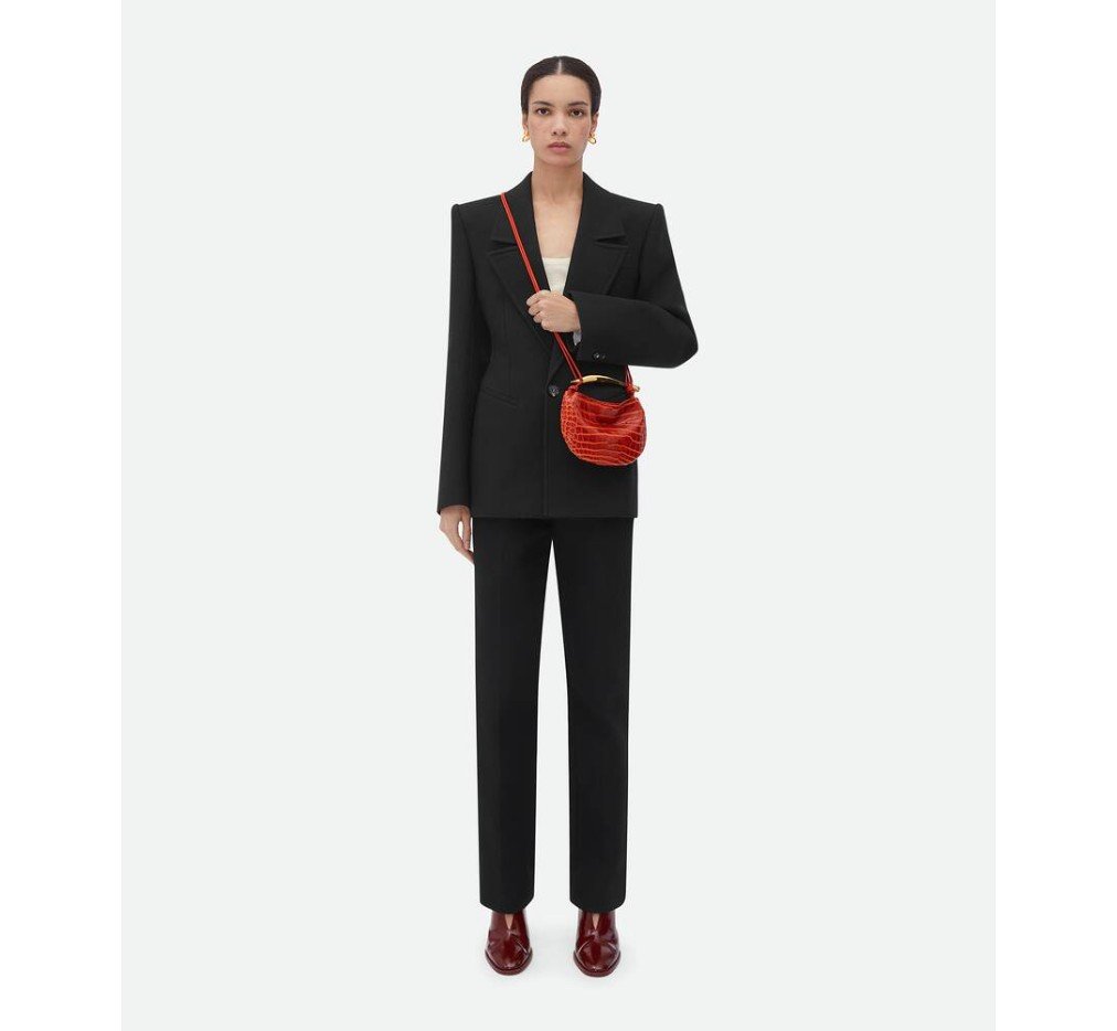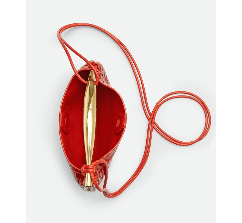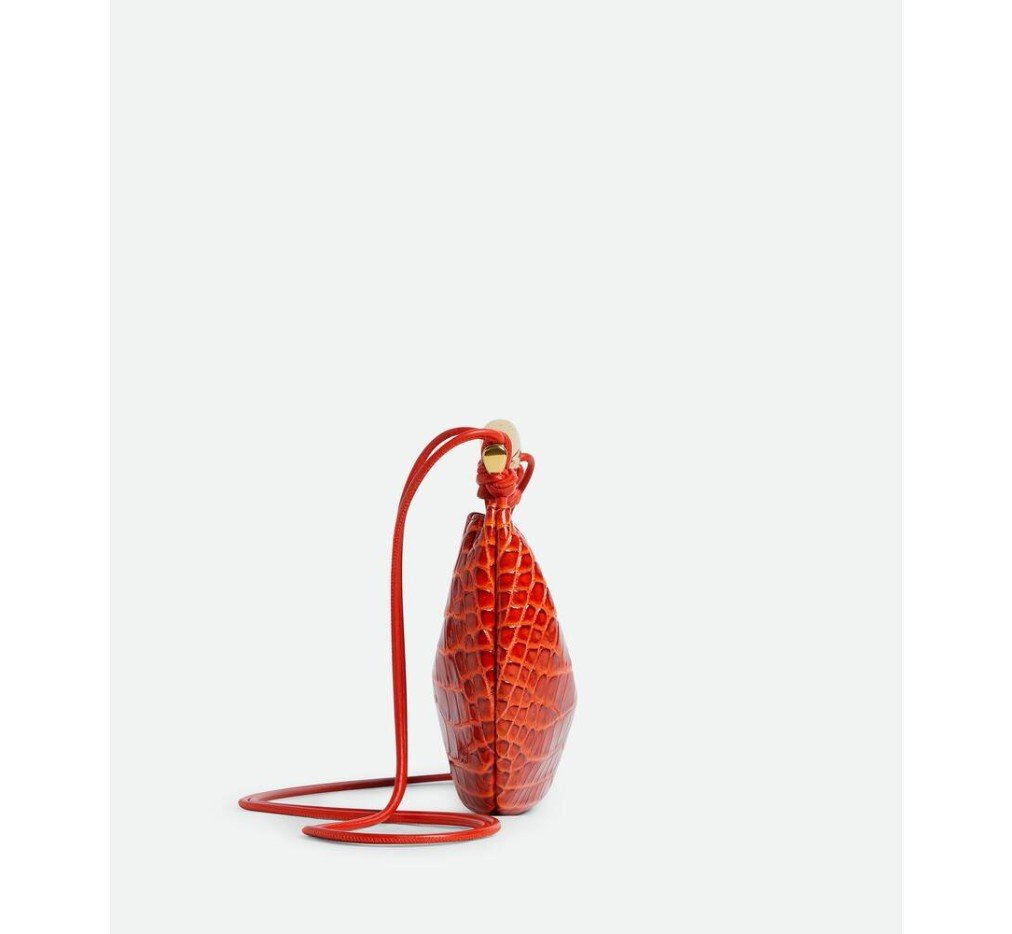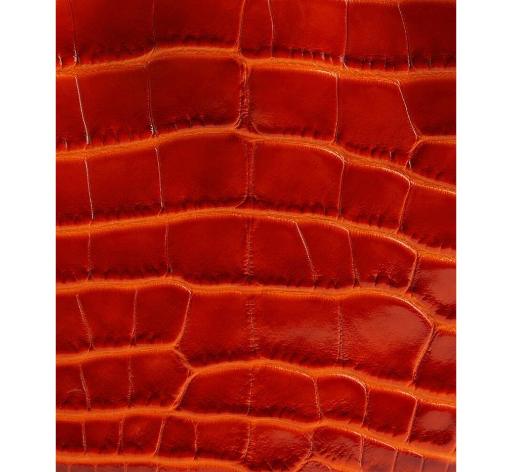 광택 마감과 조각품 같은 금속 상단 핸들이 달린 악어 가죽 소재의 크로스바디 백입니다.