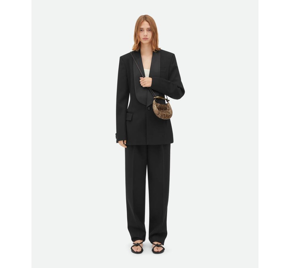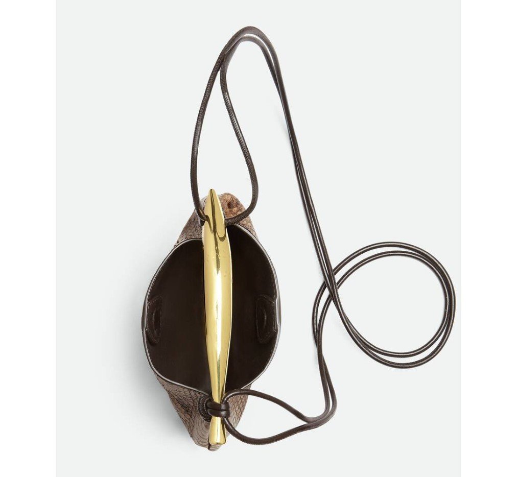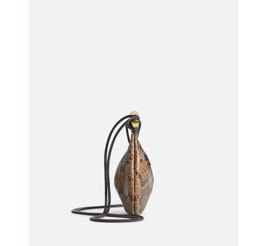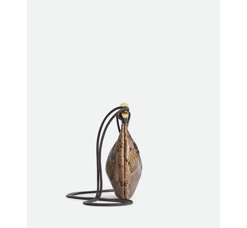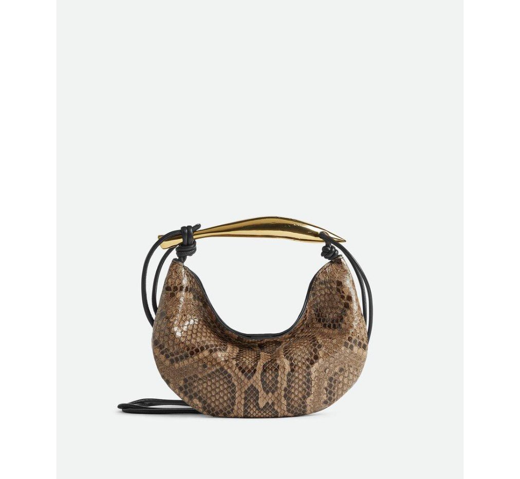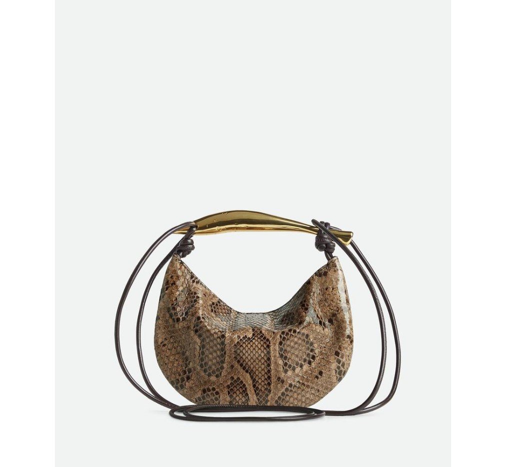 조각품 같은 메탈릭 탑 핸들이 달린 파이썬 가죽 소재의 크로스바디 백.– 메탈릭 탑 핸들이 달린 베이비 파이썬 크로스백