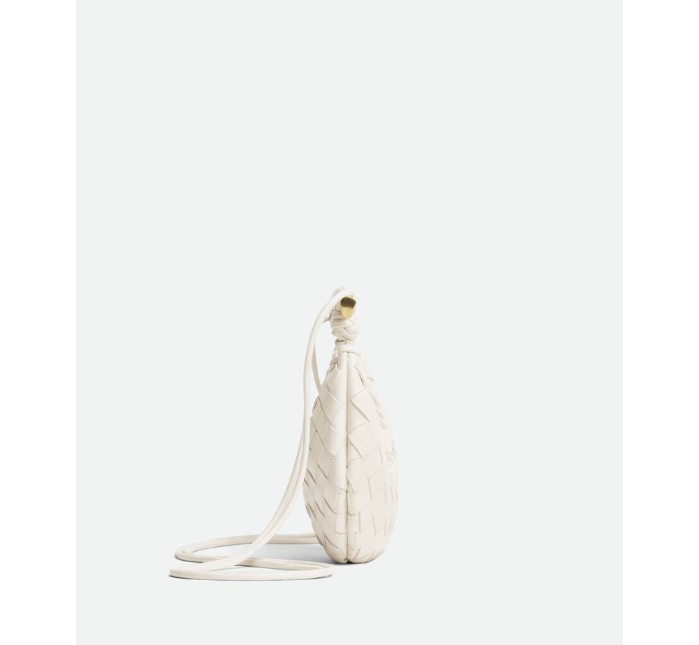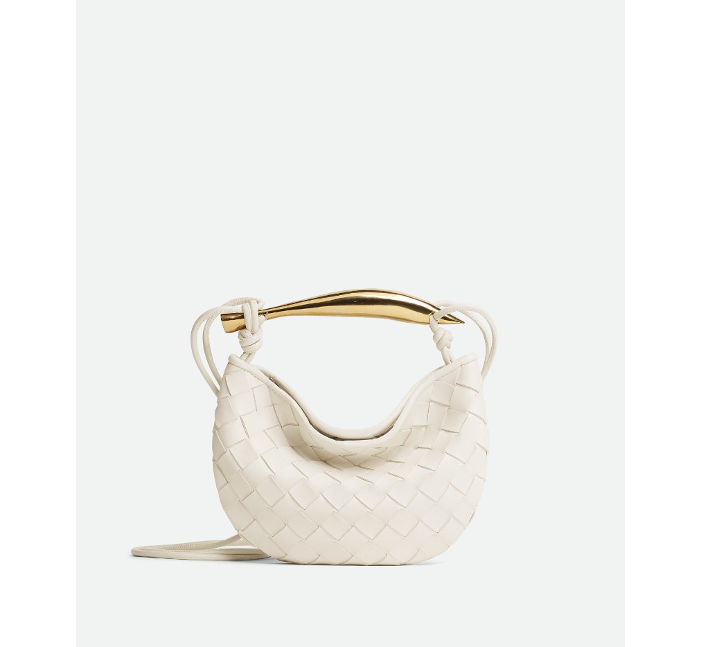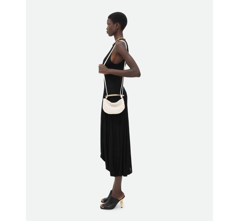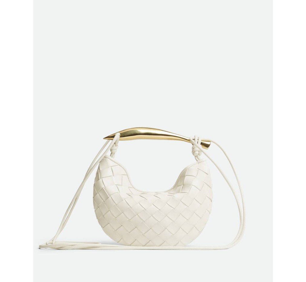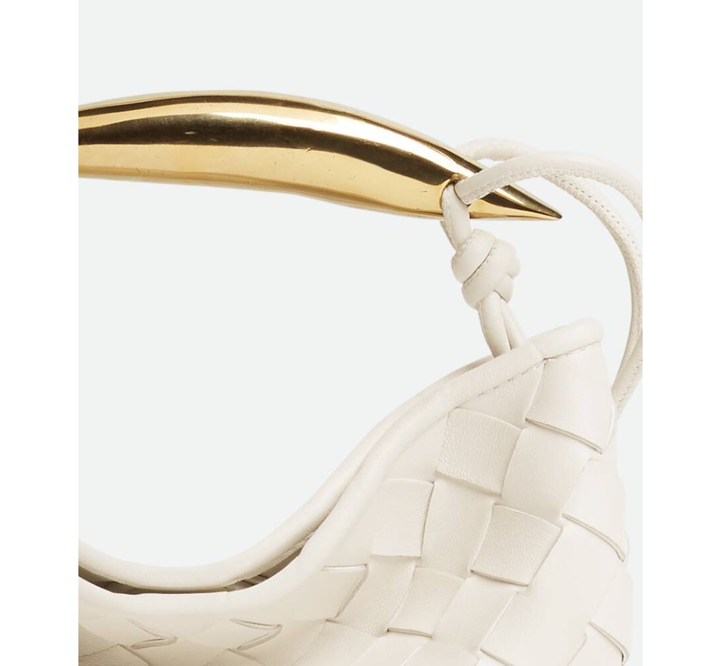 조각품 같은 금속 상단 핸들이 달린 인트레치아토 가죽 소재의 크로스백입니다.
