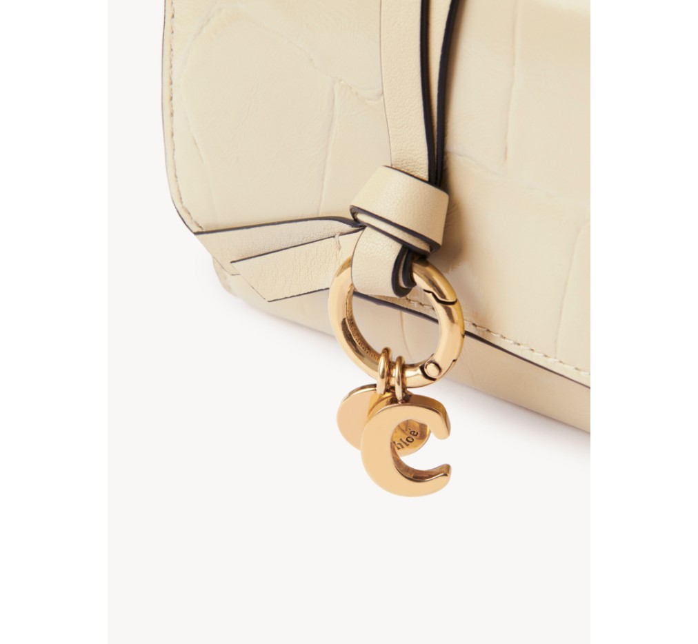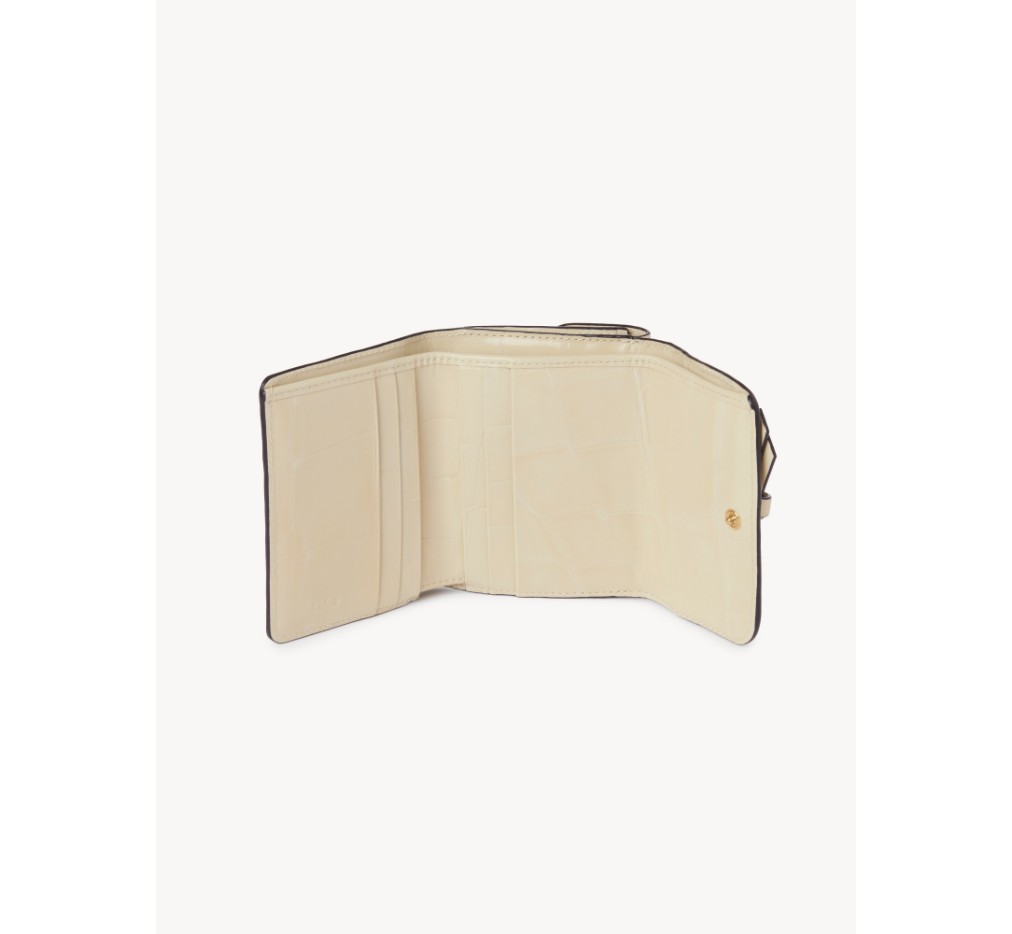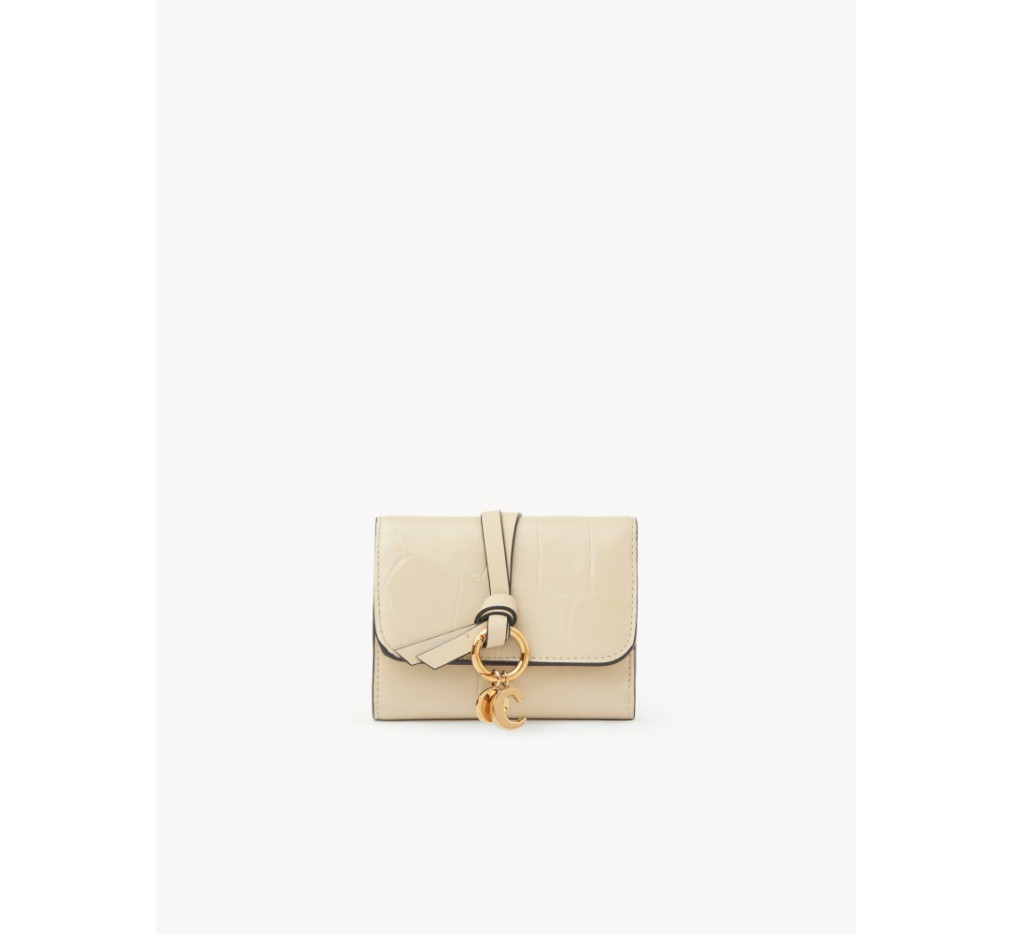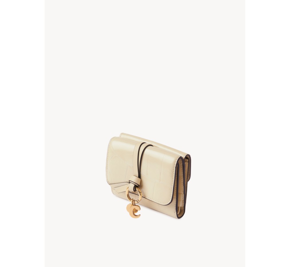 이 작은 3단 알파벳 지갑은 악어 무늬 송아지 가죽으로 제작되었습니다. 부드러운 가죽 스트랩에 골드 링이 장식되어 있으며, 라인의 참 장식으로 개인 맞춤 제작이 가능합니다.이 지갑은 스냅 잠금장치로 열립니다.