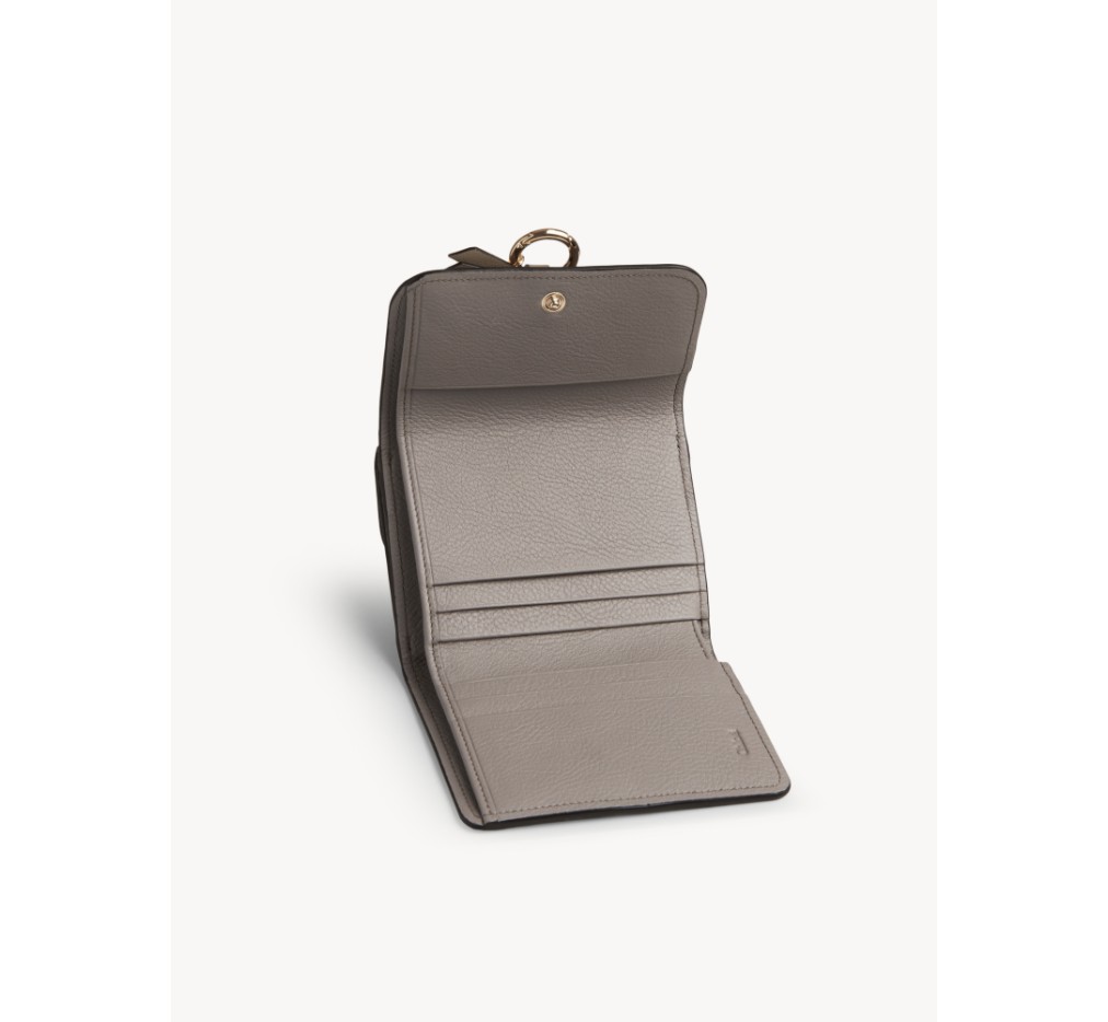 이 작은 3단 알파벳 지갑은 그레인드 송아지 가죽으로 제작되었습니다. 부드러운 가죽 스트랩에 매달린 옅은 골드 링으로 장식되어 있으며, 라인의 레터 참 장식으로 개성을 더할 수 있습니다.이 지갑은 스냅 잠금장치로 열립니다.