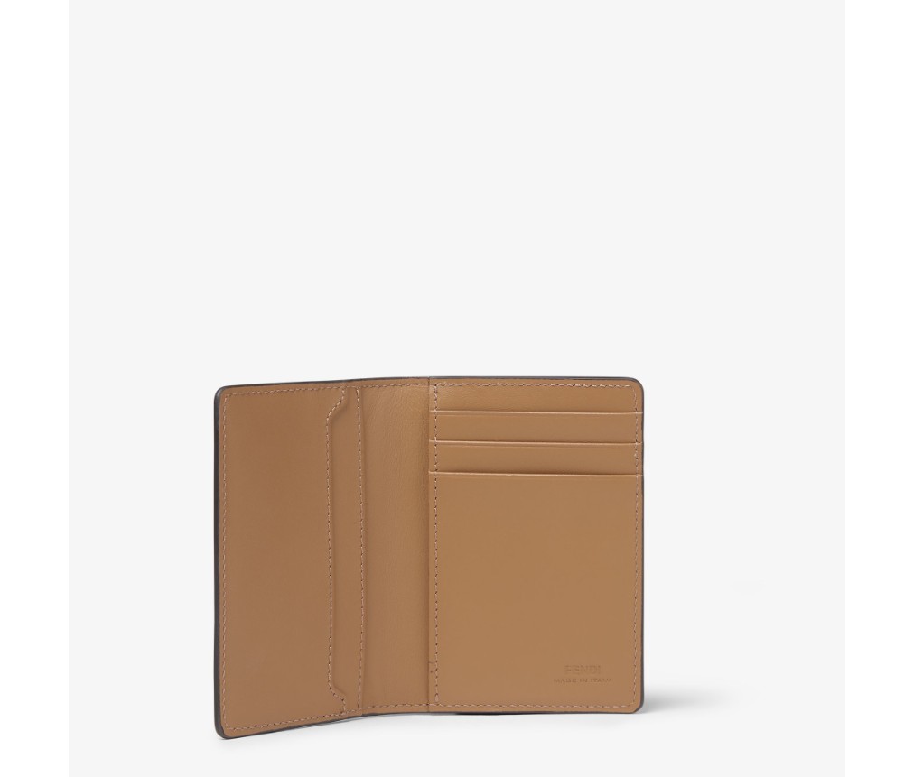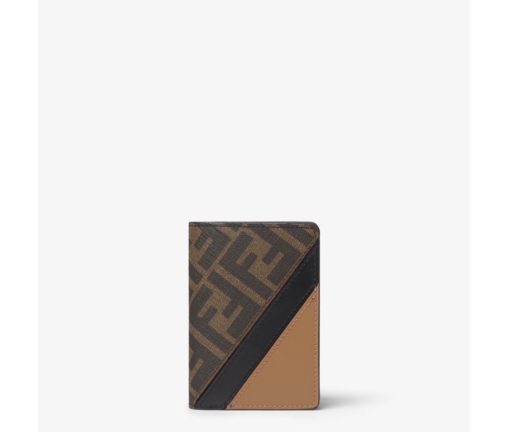 안쪽 카드 슬롯 3개와 안쪽 및 뒷면에 플랫 포켓 1개가 있는 접이식 카드 홀더입니다. 브라운과 토바코 색상의 FF 모티프가 있는 질감 있는 패브릭 소재로 제작되었습니다. 베이지색 가죽 인서트와 블랙 색상의 인레이 디테일이 특징입니다.