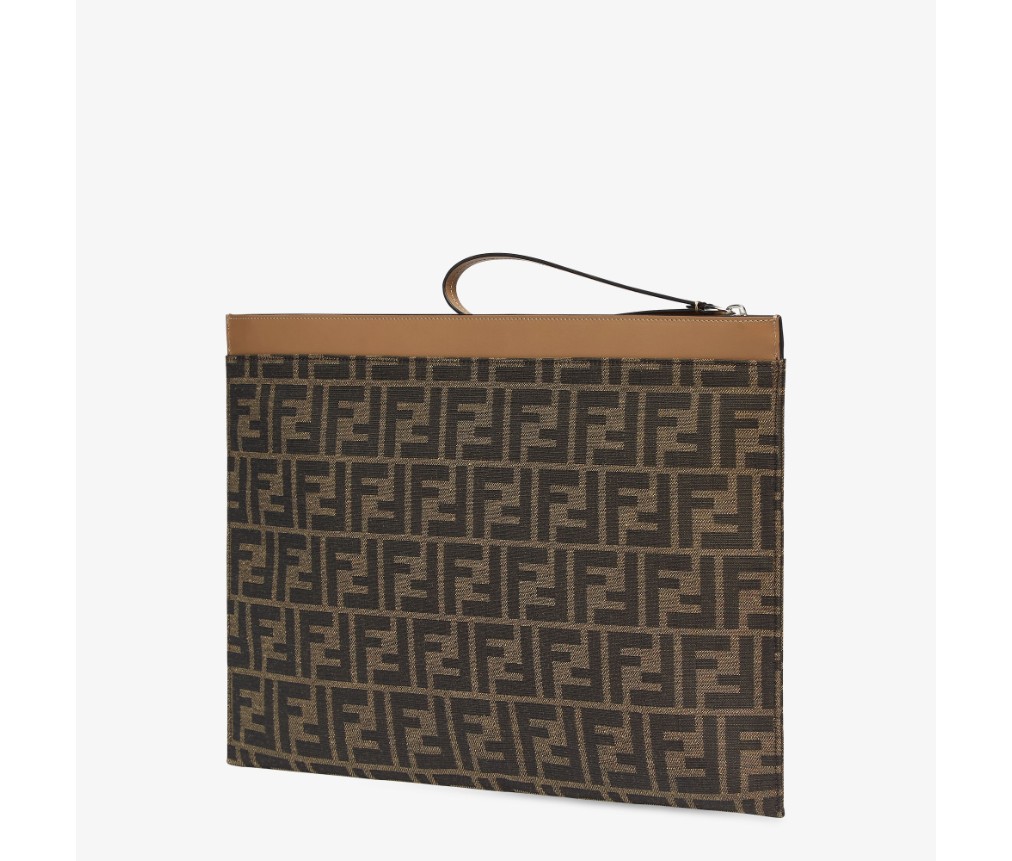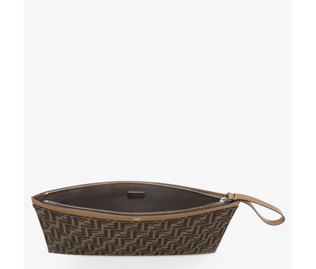 라지 플랫 지퍼 파우치. 브라운 및 토바코 자카드 FF 모티프 패브릭 소재. 베이지색 가죽에 실버 컬러 펜디 로마 레터링, 팔찌 손잡이 장식. 팔라듐 마감 메탈웨어.