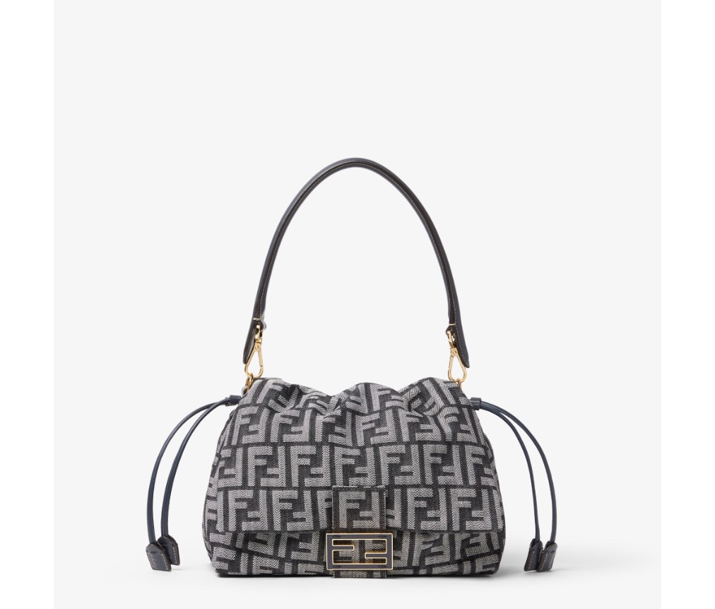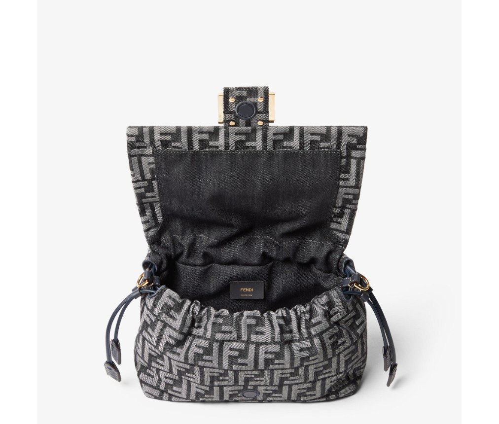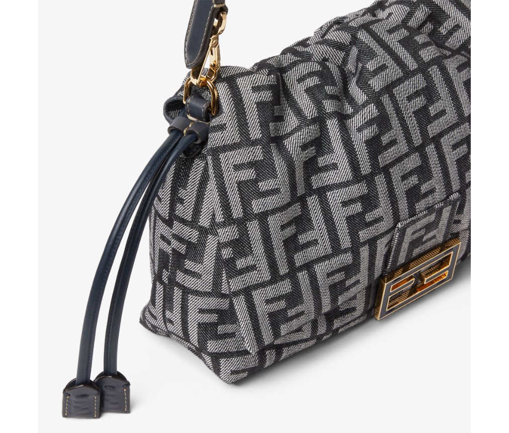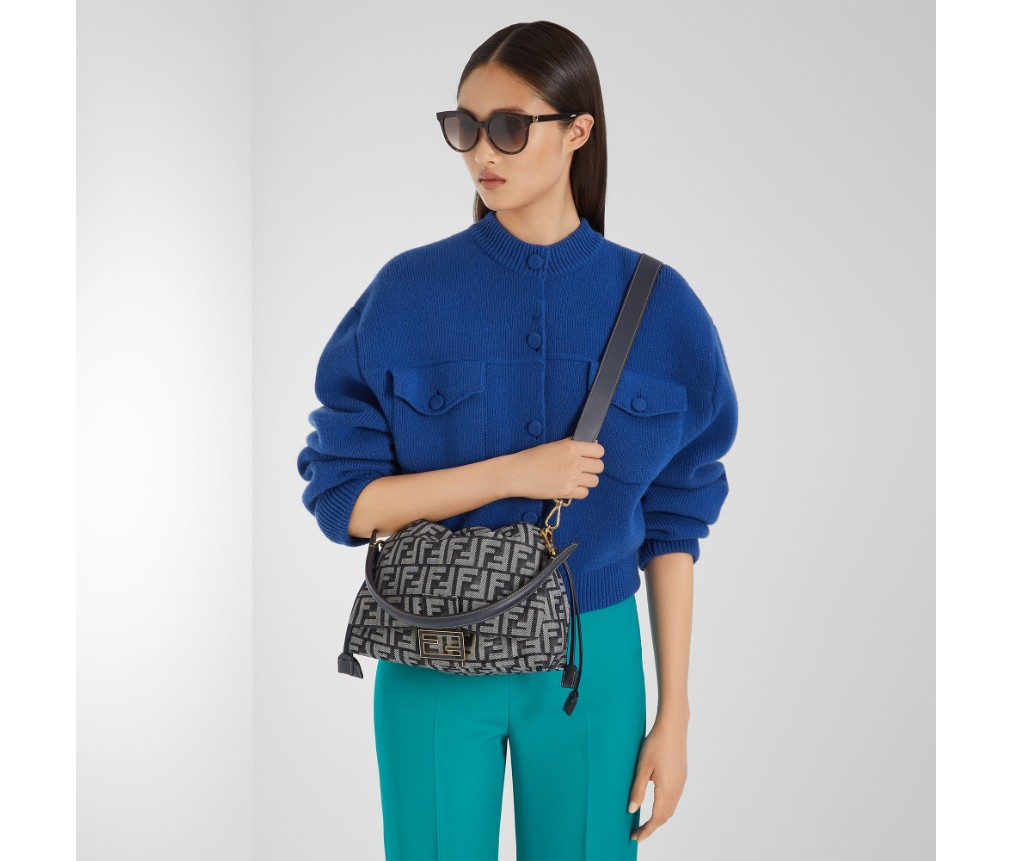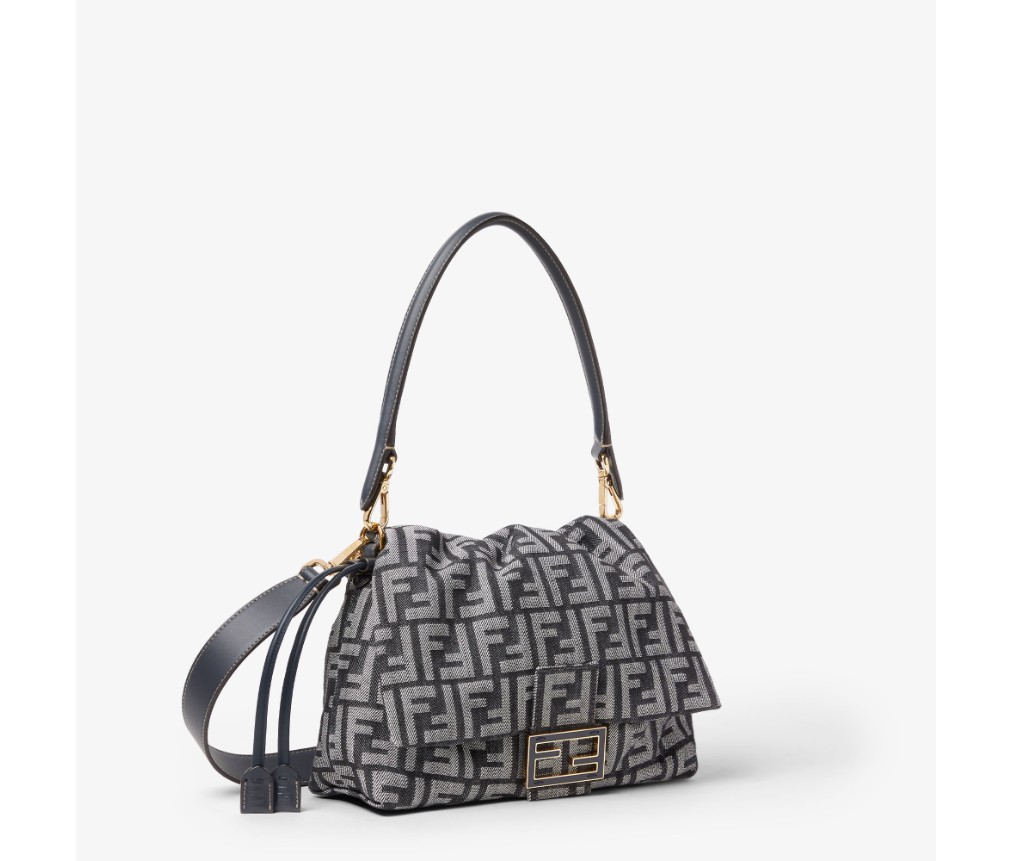 진한 파란색 데님 효과의 FF 자카드 소재로 제작되었으며, 진한 파란색 가죽 인서트가 있는 FF 클래스프로 장식되었습니다.