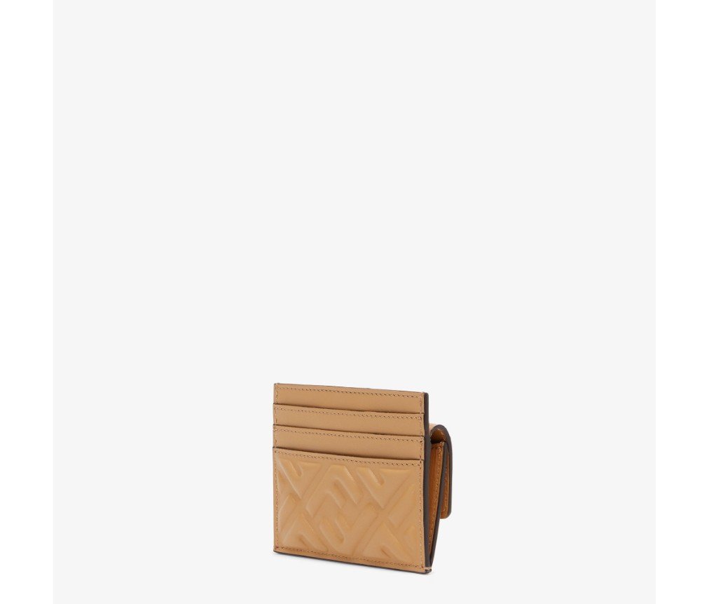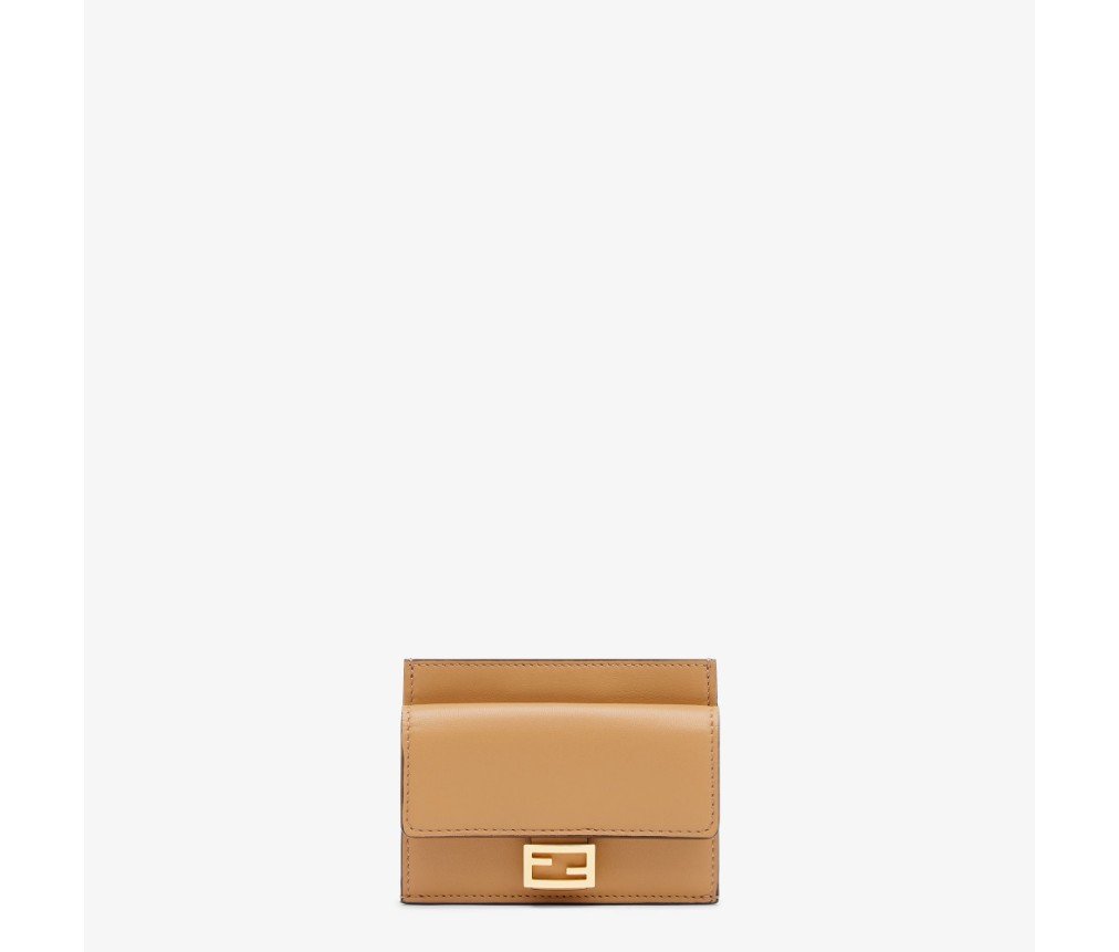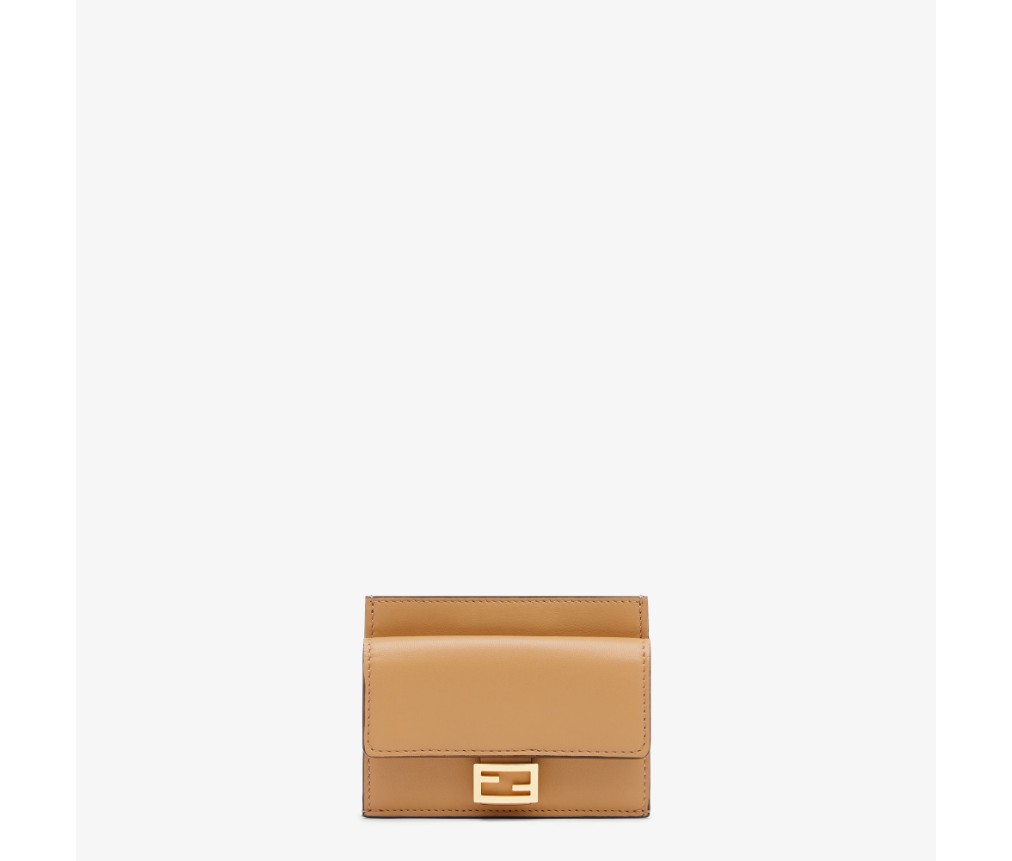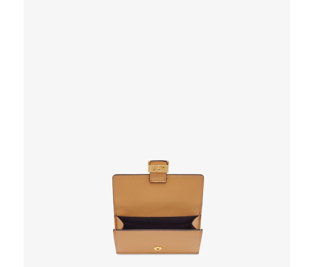 카드 슬롯 3개와 스냅 버튼이 달린 동전 포켓이 있는 바게트 카드홀더. 베이지색 나파 가죽 소재. 뒷면에는 FF 모티프가 양각으로 새겨져 있습니다. 골드 마감 메탈 장식.
