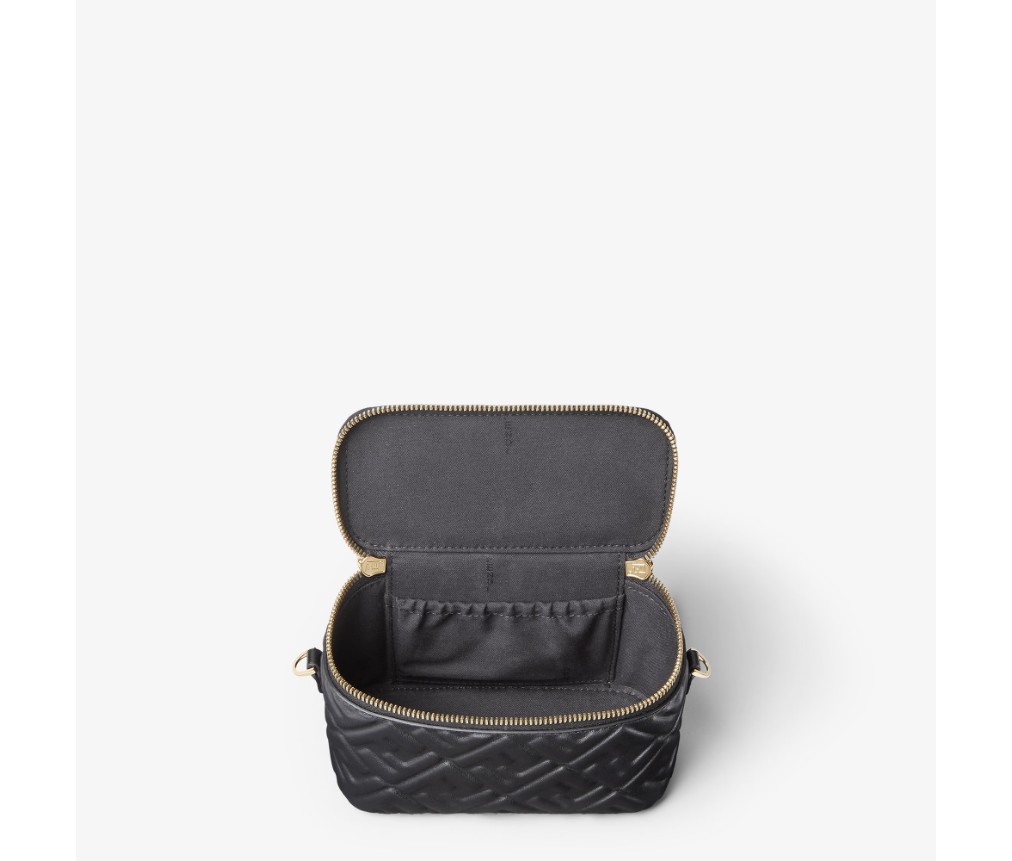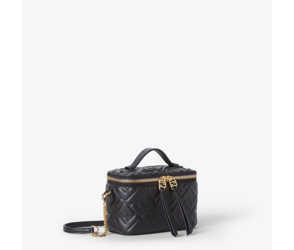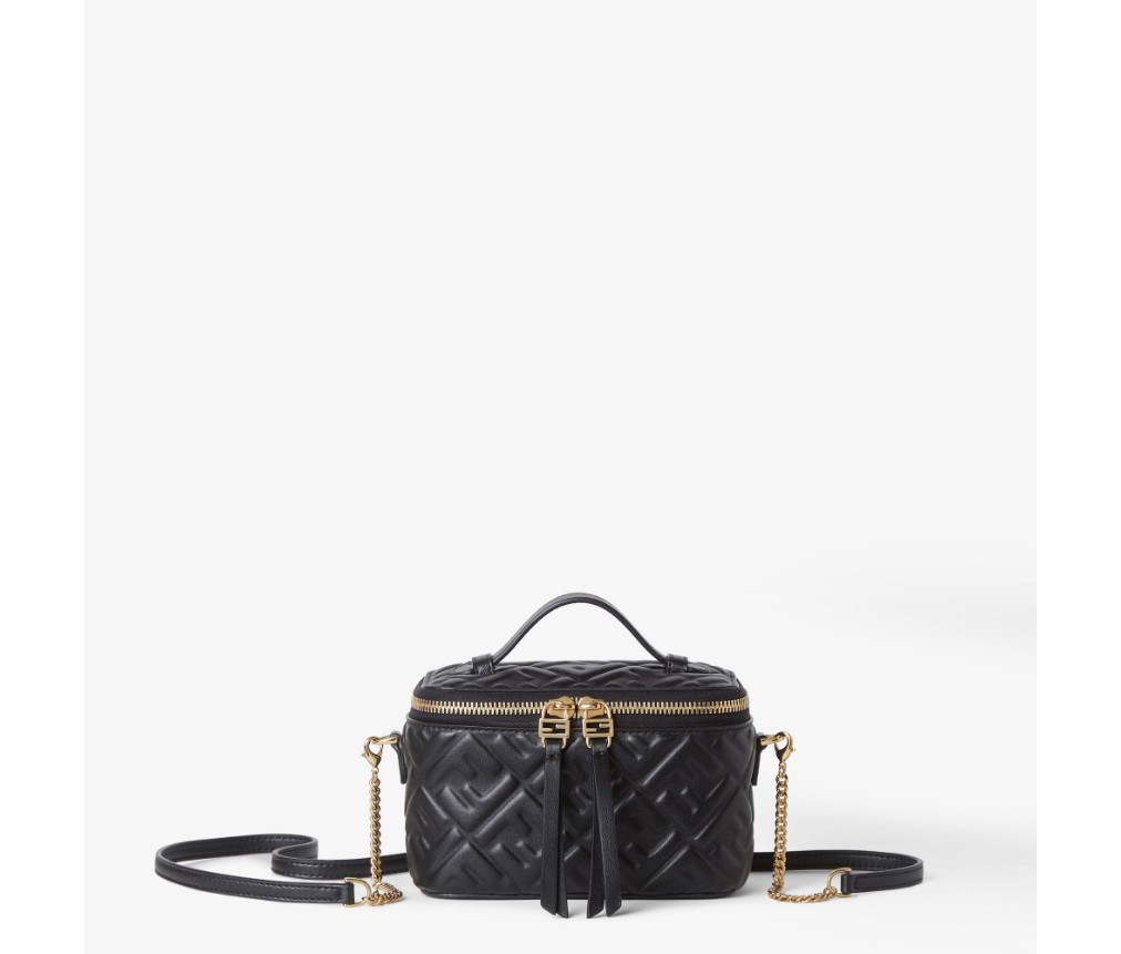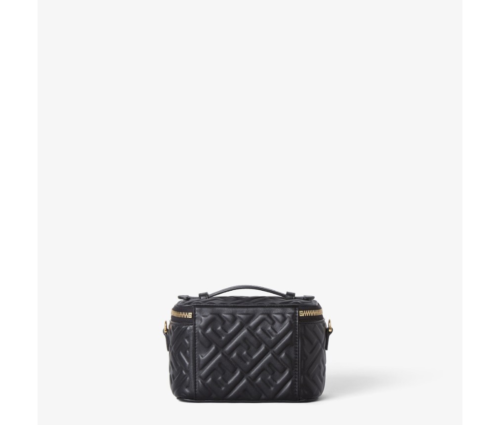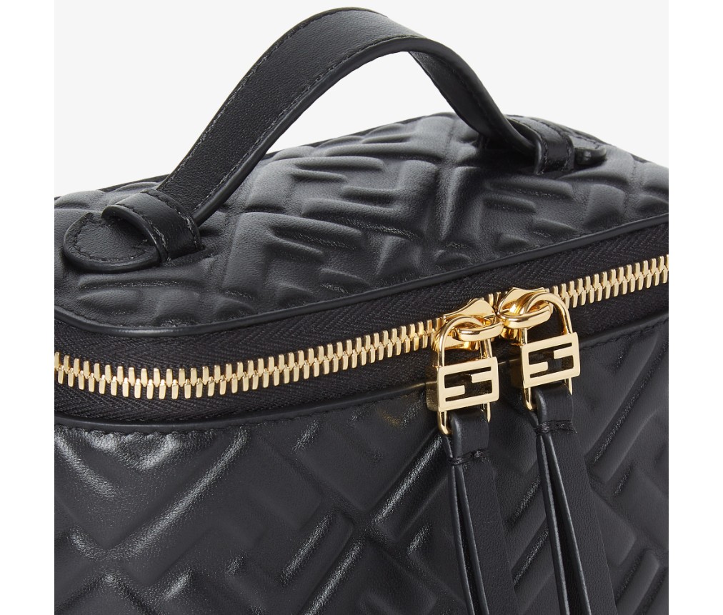 컴팩트하고 구조적인 펜디 화장대 가방. FF 디테일로 장식된 더블 슬라이더 지퍼 잠금 장치와 가죽 지퍼 당김 장치가 특징입니다.