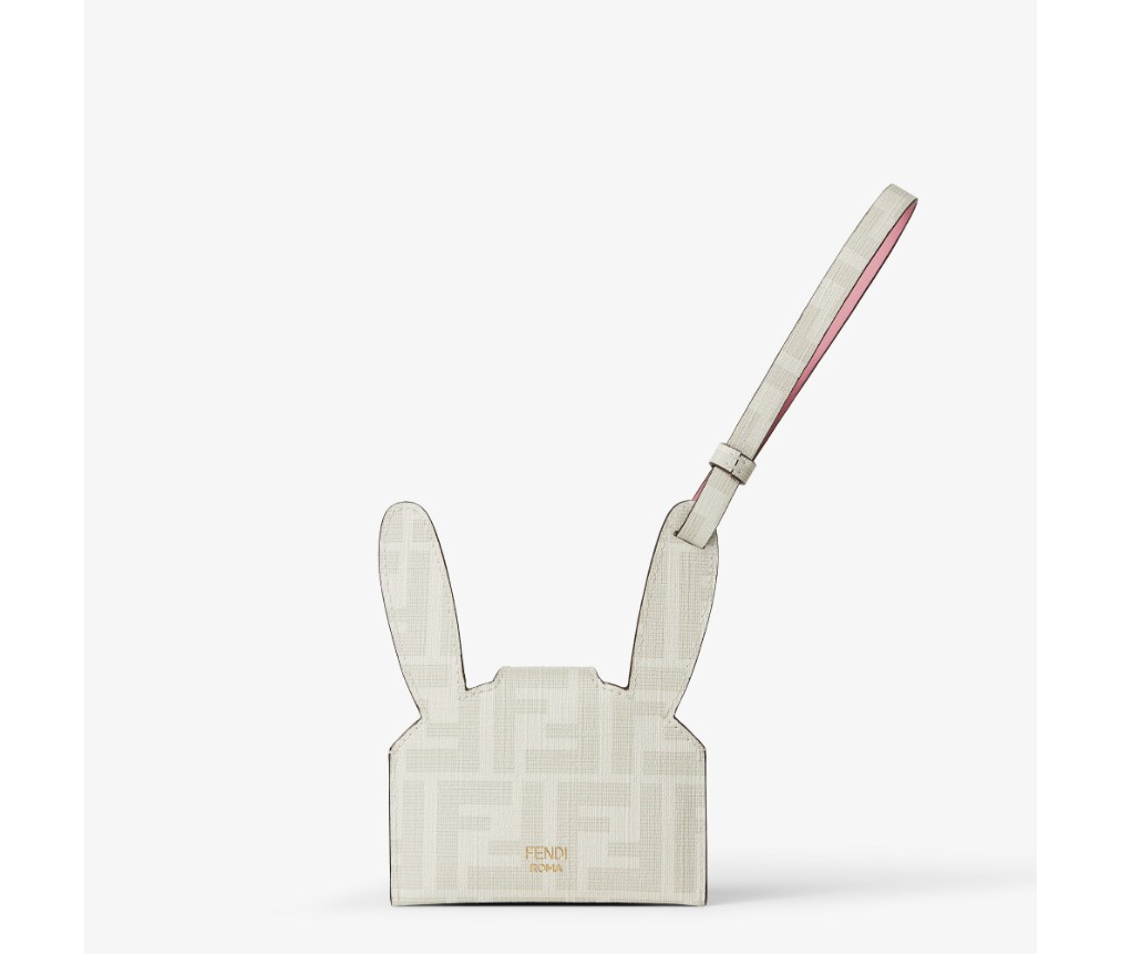 토끼 머리 디자인의 펜디 베스트 프렌즈 포에버 카드 홀더입니다. 내부 수납공간과 브리지, 히든 스냅 버튼이 있는 클래스프가 특징입니다. 가방이나 벨트에 고정할 수 있는 가죽 스트랩이 있습니다. 화이트와 핑크 색상의 아이코닉한 FF 모티프가 있는 패브릭 소재로 제작되었습니다. 골드 마감 메탈 장식이 돋보입니다.