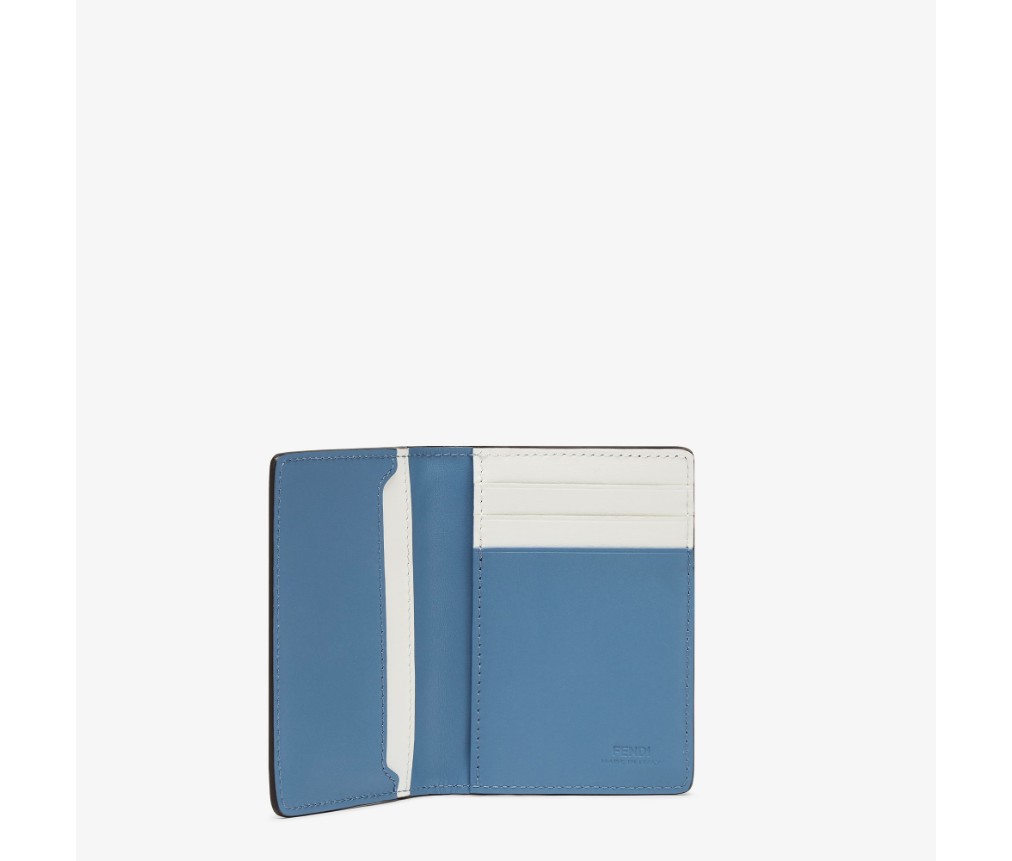 내부에 카드 슬롯 3개, 플랫 포켓 1개, 뒷면에 1개의 포켓이 있는 컴팩트한 접이식 카드 홀더입니다. 세룰리언 블루 색상의 펜디 섀도우 가죽 소재에 화이트 색상의 FF 모티프가 프린트되어 있습니다. 세룰리언 블루와 오프 화이트 색상의 가죽 안감. 팔라듐 마감의 메탈 펜디 로고.