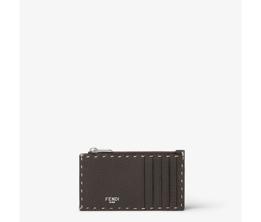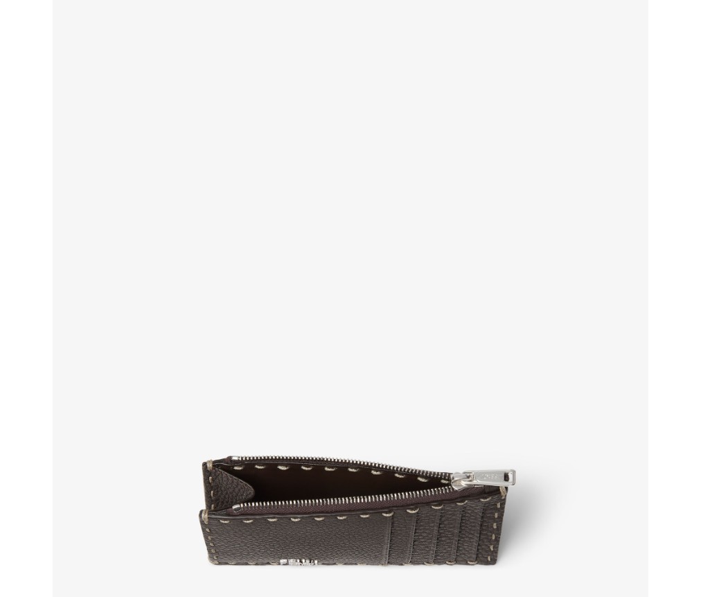 네 개의 카드 슬롯과 플랫 지퍼 포켓으로 구성된 카드 홀더입니다. 다크 브라운 쿠오이오 로마노 가죽 소재에 78개의 수작업 매크로 탑스티치로 마감되어 1925년부터 펜디 장인들이 여러 세대에 걸쳐 계승해 온 셀러리아 장인정신의 상징입니다. 팔라듐 마감 금속 소재가 사용되었습니다.