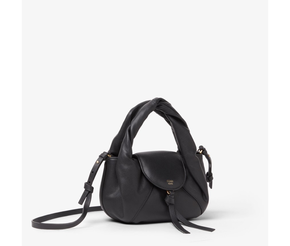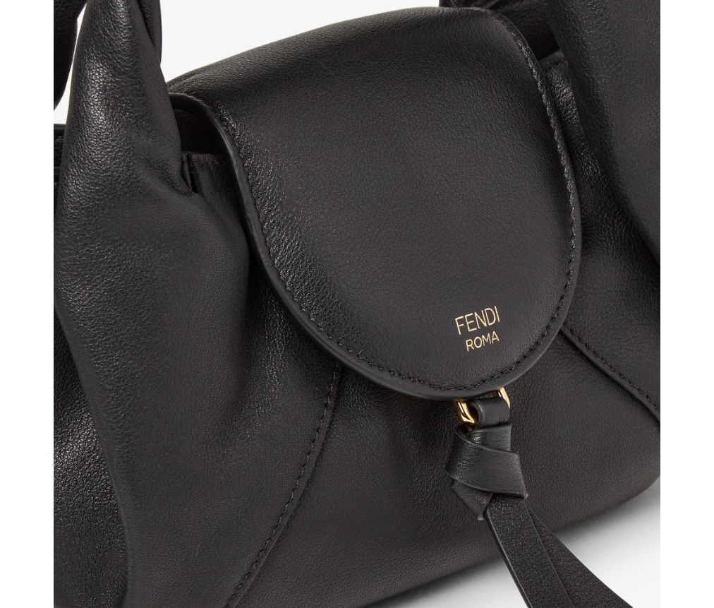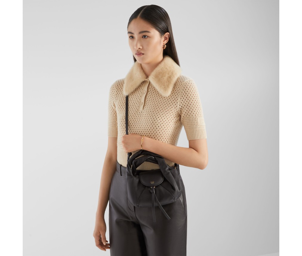 톤온톤 가죽 소재의 둥근 플랩, 클래스프와 매듭 장식. 골드 컬러 핫 스탬핑 FENDI Roma 로고.