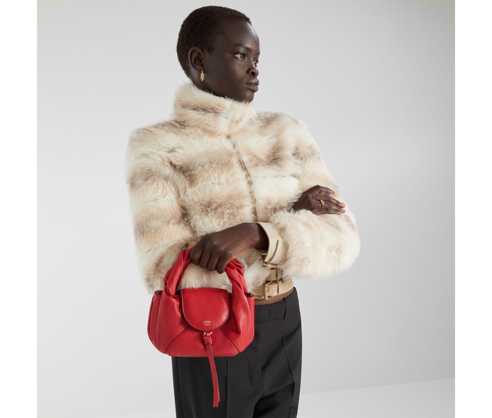 톤온톤 가죽 소재의 둥근 플랩, 클래스프와 매듭 장식. 골드 컬러 핫 스탬핑 FENDI Roma 로고.