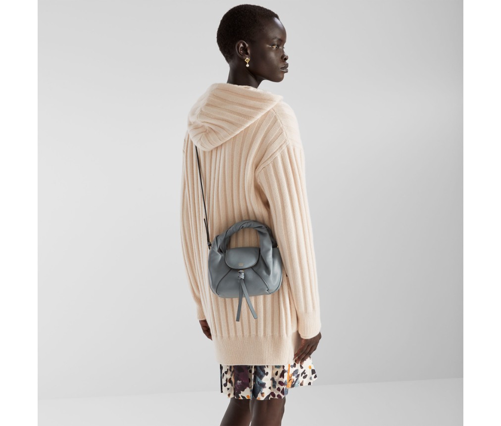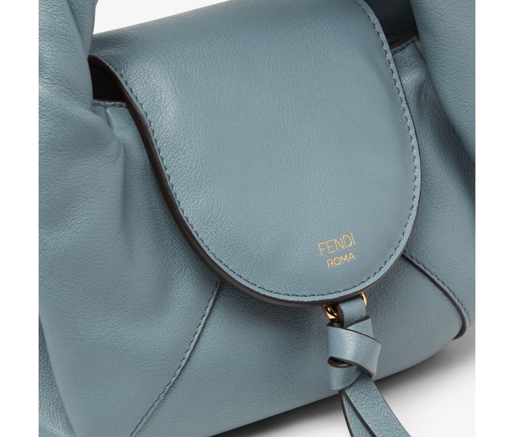 톤온톤 가죽 소재의 둥근 플랩, 클래스프와 매듭 장식. 골드 컬러 핫 스탬핑 FENDI Roma 로고.