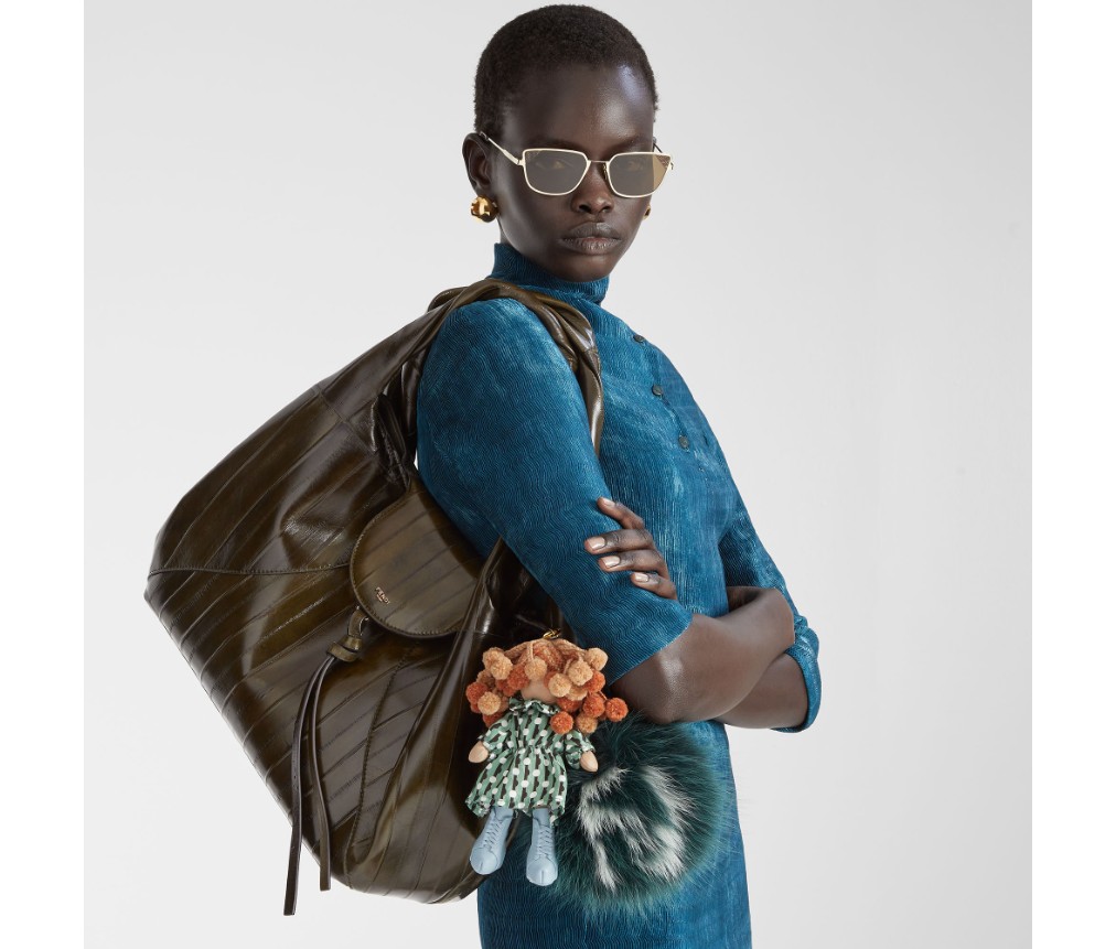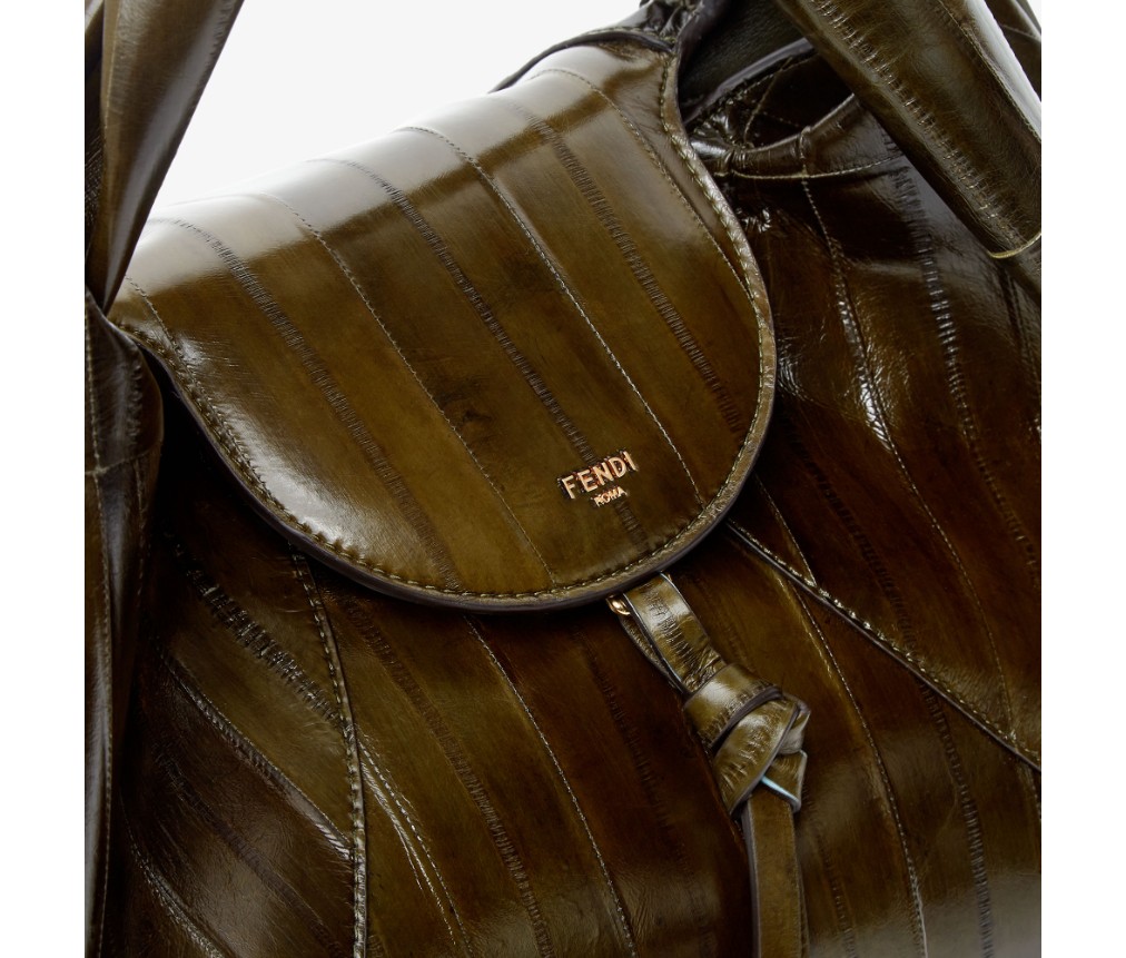 둥근 플랩 잠금장치 안에 동전 포켓이 숨겨져 있으며, 메탈 트리밍과 톤온톤 가죽 소재의 매듭 스트랩이 특징입니다. 골드 컬러 핫 스탬핑 FENDI Roma 로고가 새겨져 있습니다.
