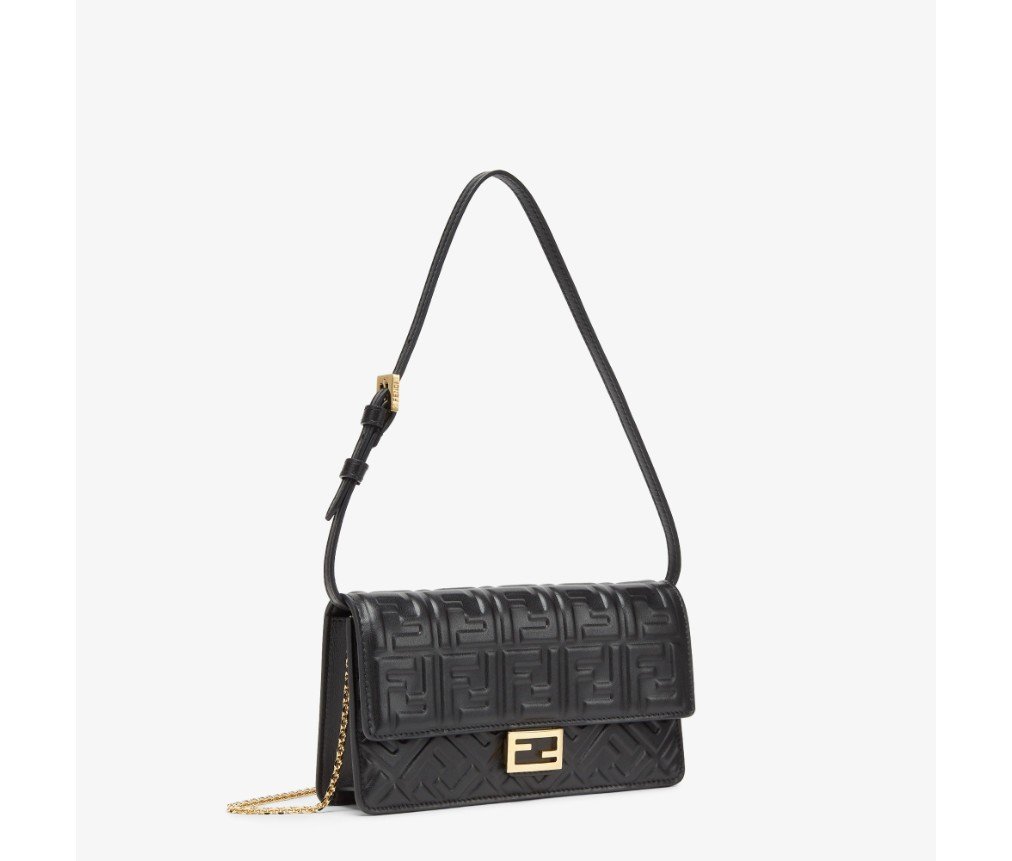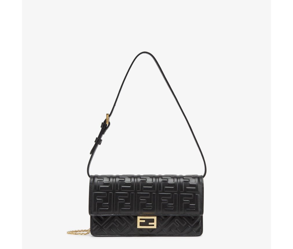 플랩과 FF 잠금장치가 있는 컴팩트한 바게트 지갑. 내부 수납공간 6개. 가죽 소재의 길이 조절 가능한 숄더 스트랩과 얇은 체인 스트랩으로 탈부착 가능한 숄더 스트랩이 있어 클러치처럼 들거나, 겨드랑이에 끼거나, 크로스백으로 착용할 수 있습니다. 블랙 나파 가죽 소재에 FF 모티프가 양각으로 새겨져 있습니다. 골드 마감 메탈웨어.