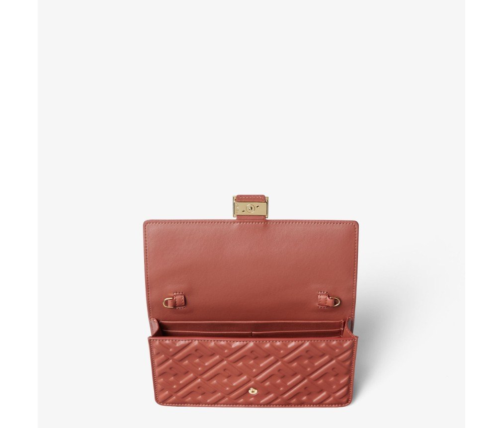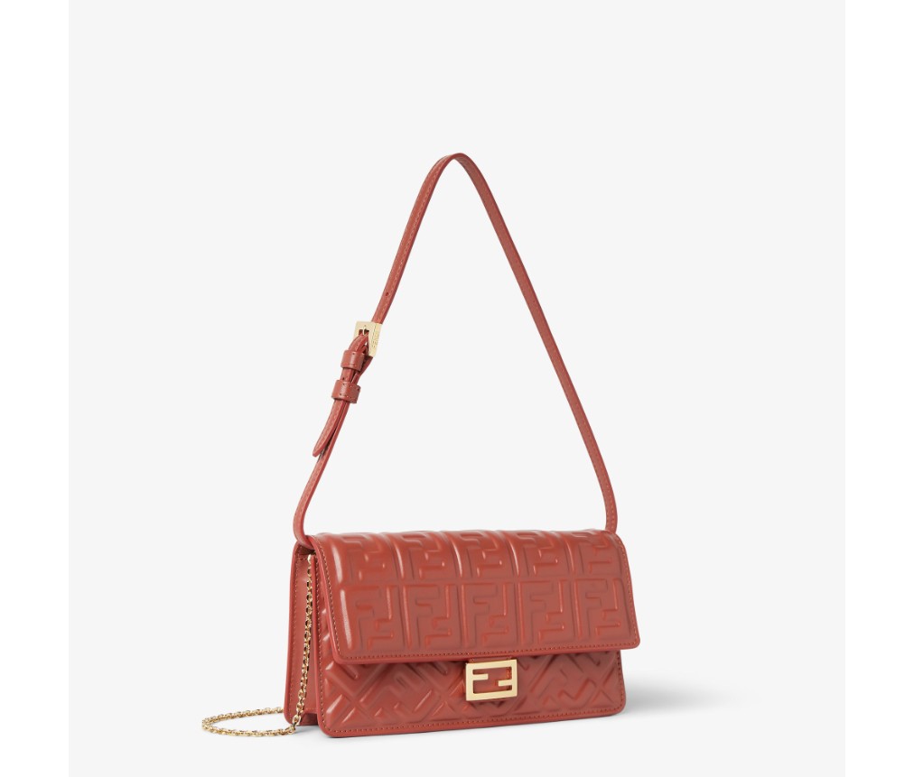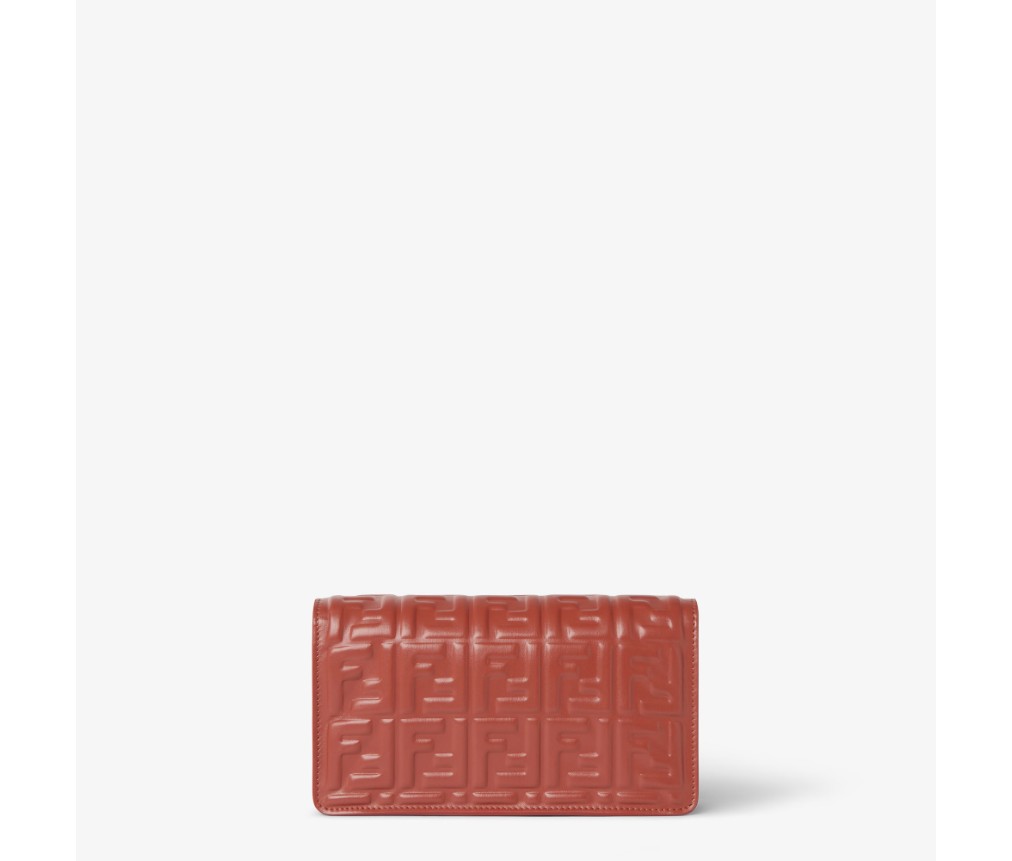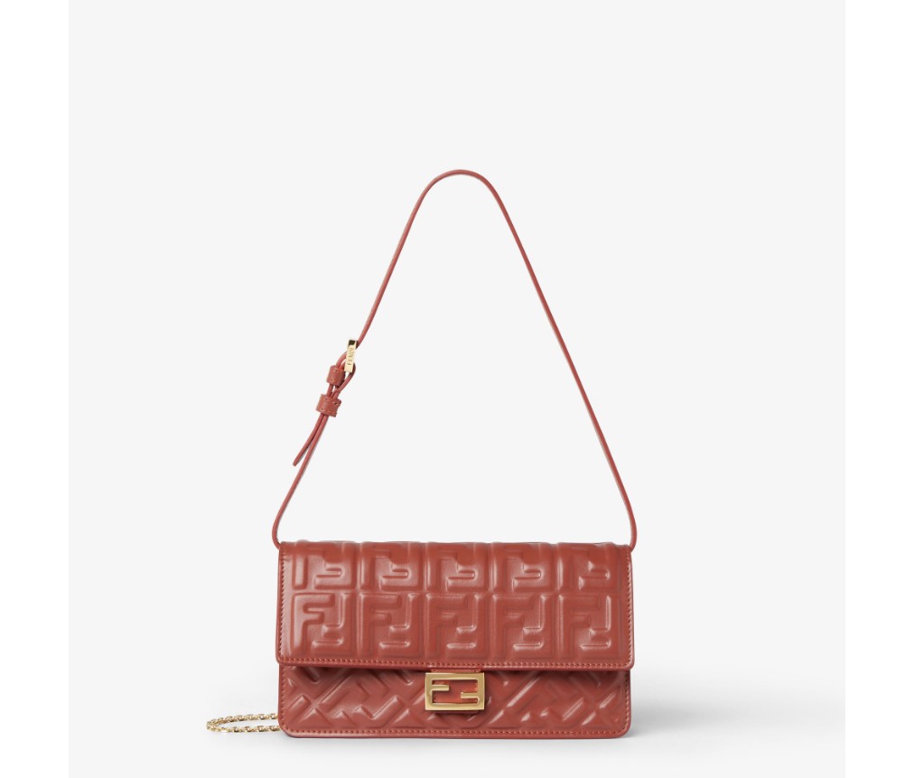 플랩과 FF 클래스프가 있는 컴팩트한 바게트 지갑입니다. 내부 수납공간에는 카드 슬롯 6개가 있습니다. 길이 조절이 가능한 가죽 숄더 스트랩과 탈부착 가능한 얇은 체인 숄더 스트랩이 있어 클러치처럼 들거나, 겨드랑이에 끼거나, 크로스백으로 연출할 수 있습니다. 부드러운 시에나 브라운 나파 가죽 소재에 3D 효과로 양각된 아이코닉한 FF 모티프가 새겨져 있습니다. 골드 마감 메탈 장식이 특징입니다.