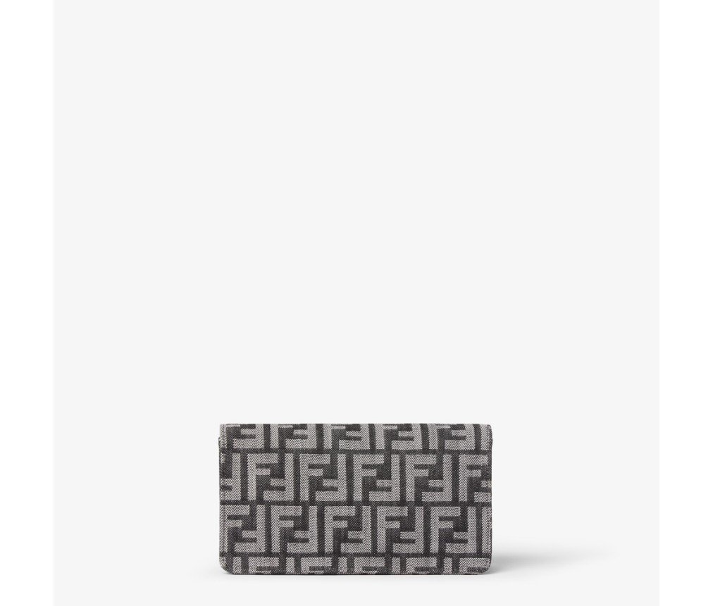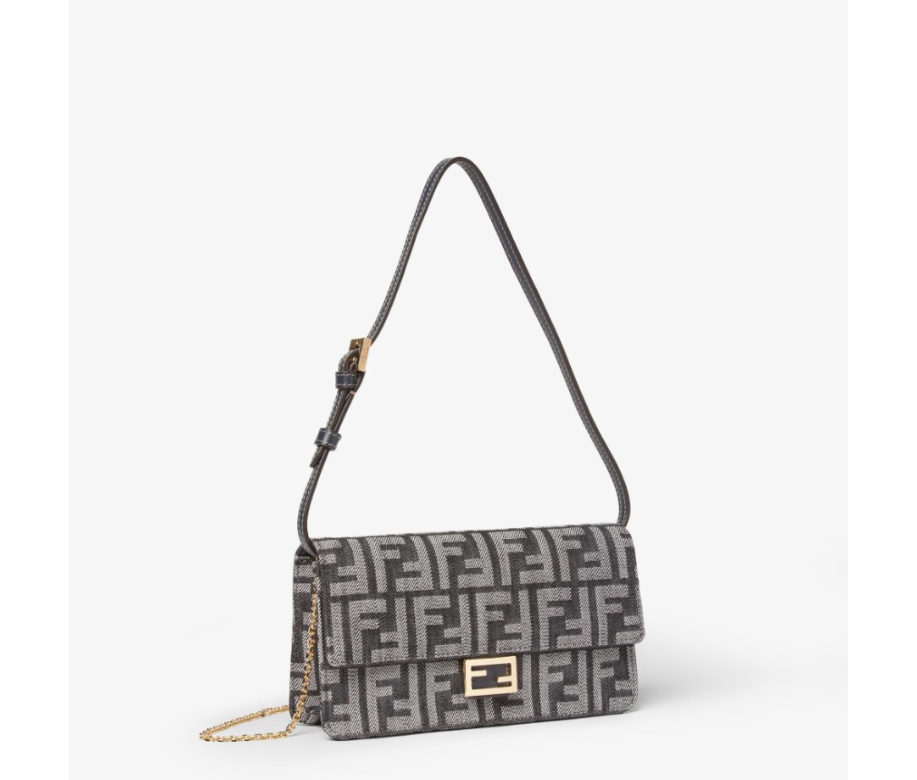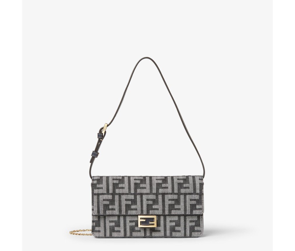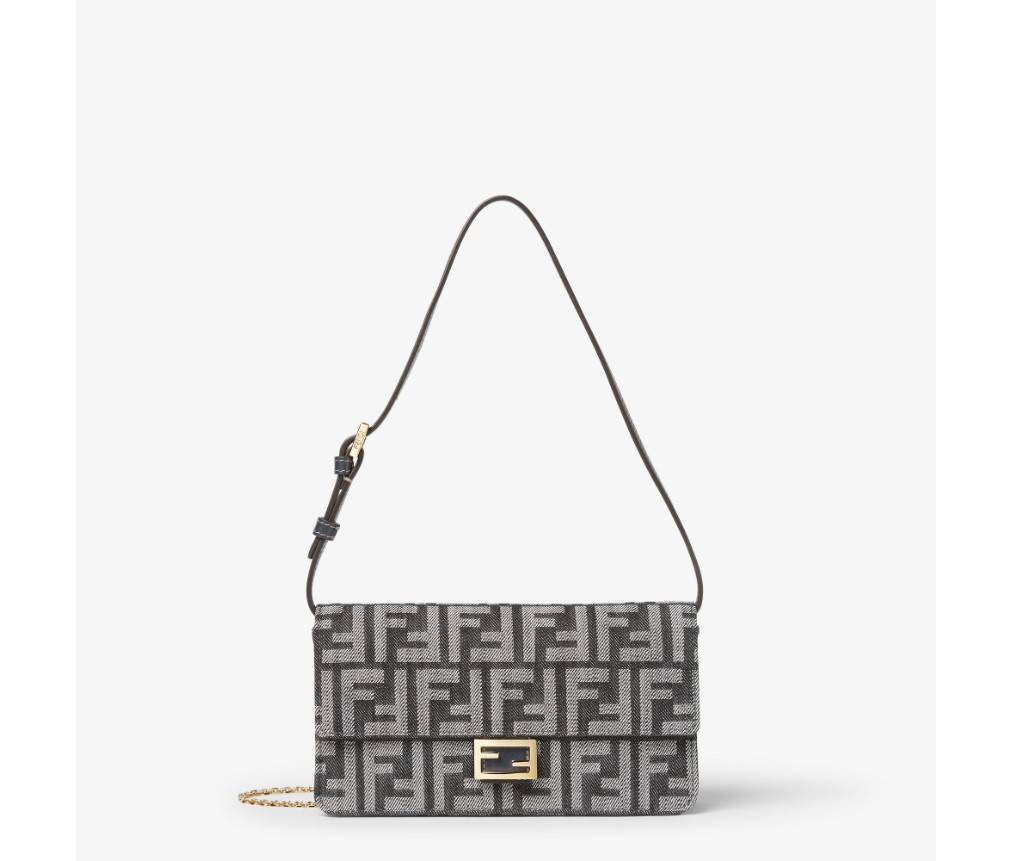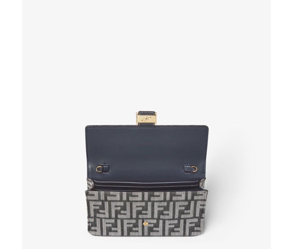 플랩과 FF 클래스프가 있는 컴팩트한 바게트 지갑입니다. 내부 수납공간에는 카드 슬롯 6개가 있습니다. 길이 조절이 가능한 가죽 숄더 스트랩과 탈부착 가능한 얇은 체인 숄더 스트랩이 있어 클러치처럼 들거나, 겨드랑이에 끼거나, 크로스백으로 연출할 수 있습니다. 다크 블루 톤의 데님 효과 FF 자카드 소재로 제작되었으며, 골드 마감 메탈 장식이 특징입니다.