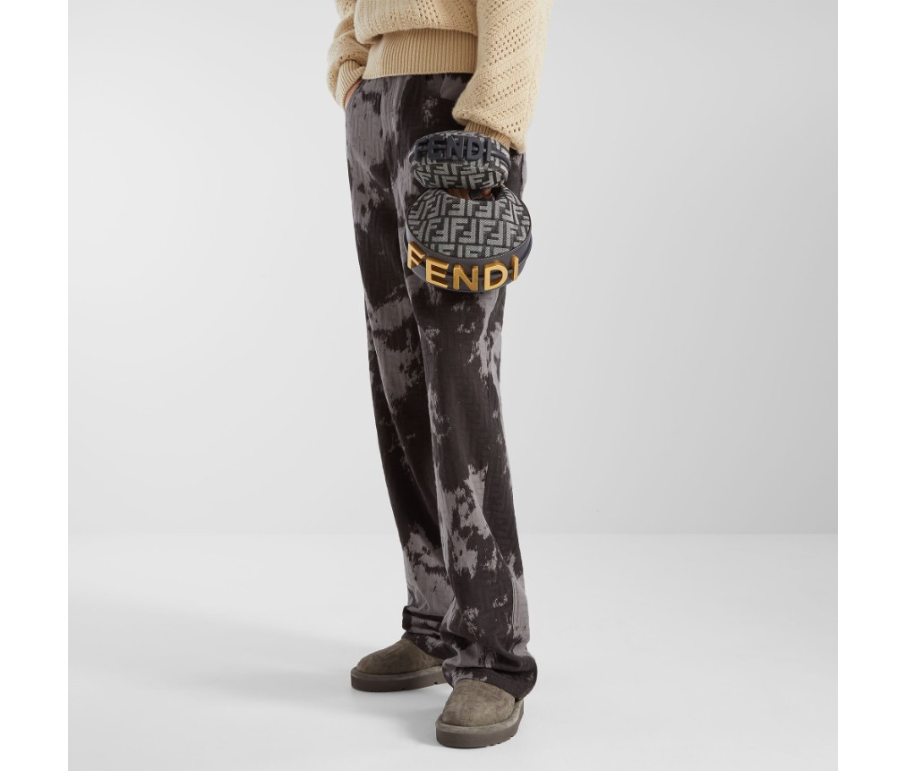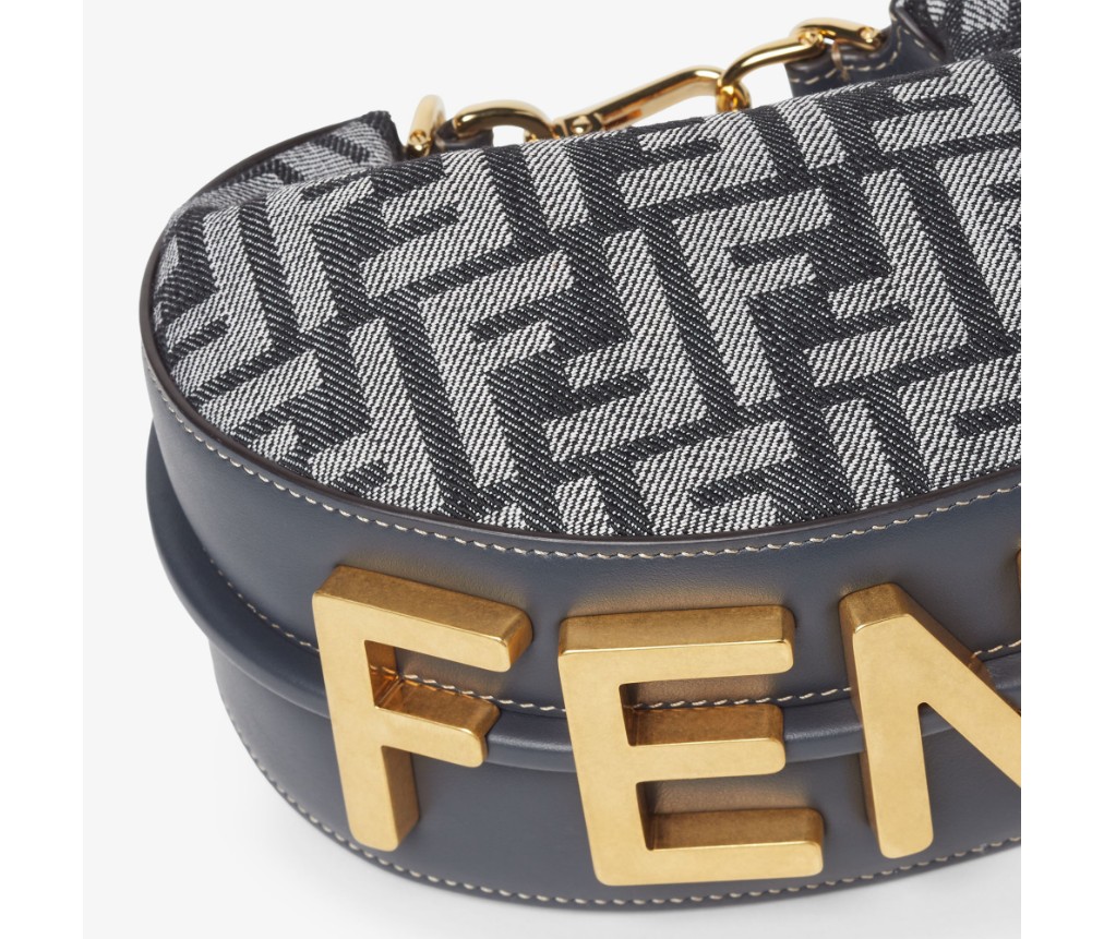 진한 파란색 톤의 데님 효과 FF 자카드로 제작되었으며, 바닥에는 빈티지 골드 메탈 펜디 레터링이 장식되어 있으며, 가방을 착용하면 볼 수 있습니다.