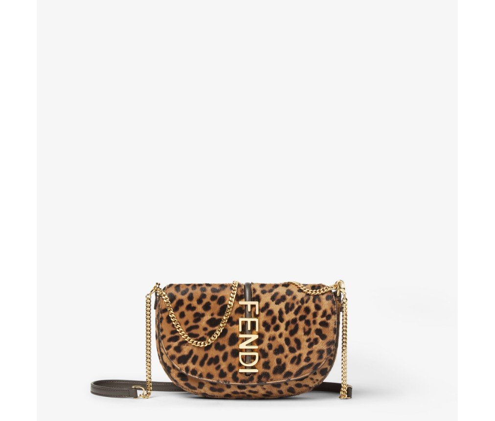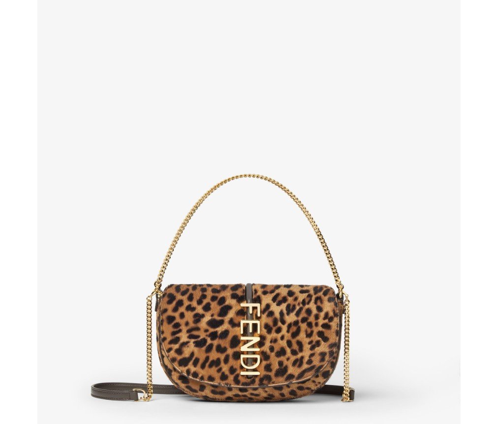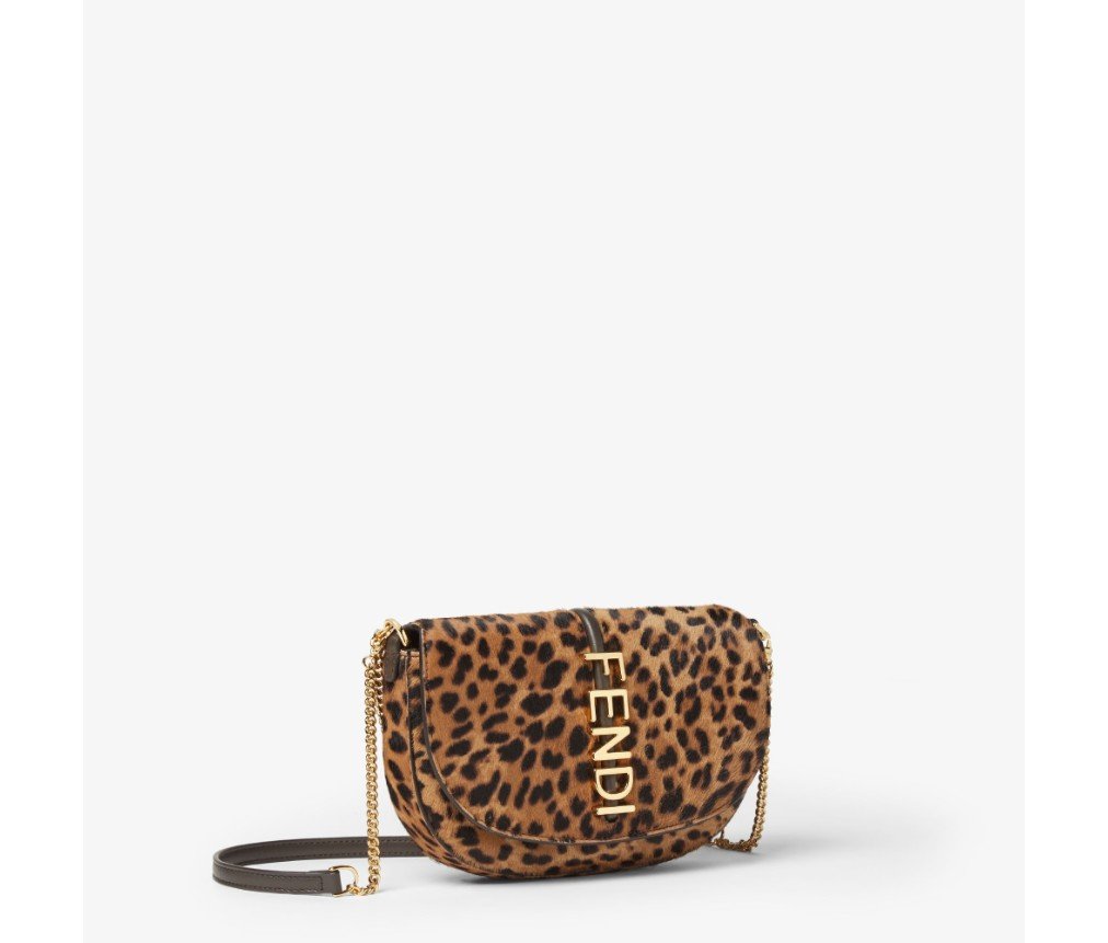 펜디그래피 플랩 지갑(펜디 레터링 메탈 장식). 안감 처리된 내부 수납공간과 네 개의 카드 슬롯이 특징입니다. 짧고 얇은 체인 숄더 스트랩과 가죽 및 체인 소재의 탈부착 가능한 두 번째 숄더 스트랩이 있습니다. 카발리노 송아지 가죽 소재에 브라운 펜디 레오 패턴이 더해졌습니다. 골드 마감 메탈 장식이 특징입니다.