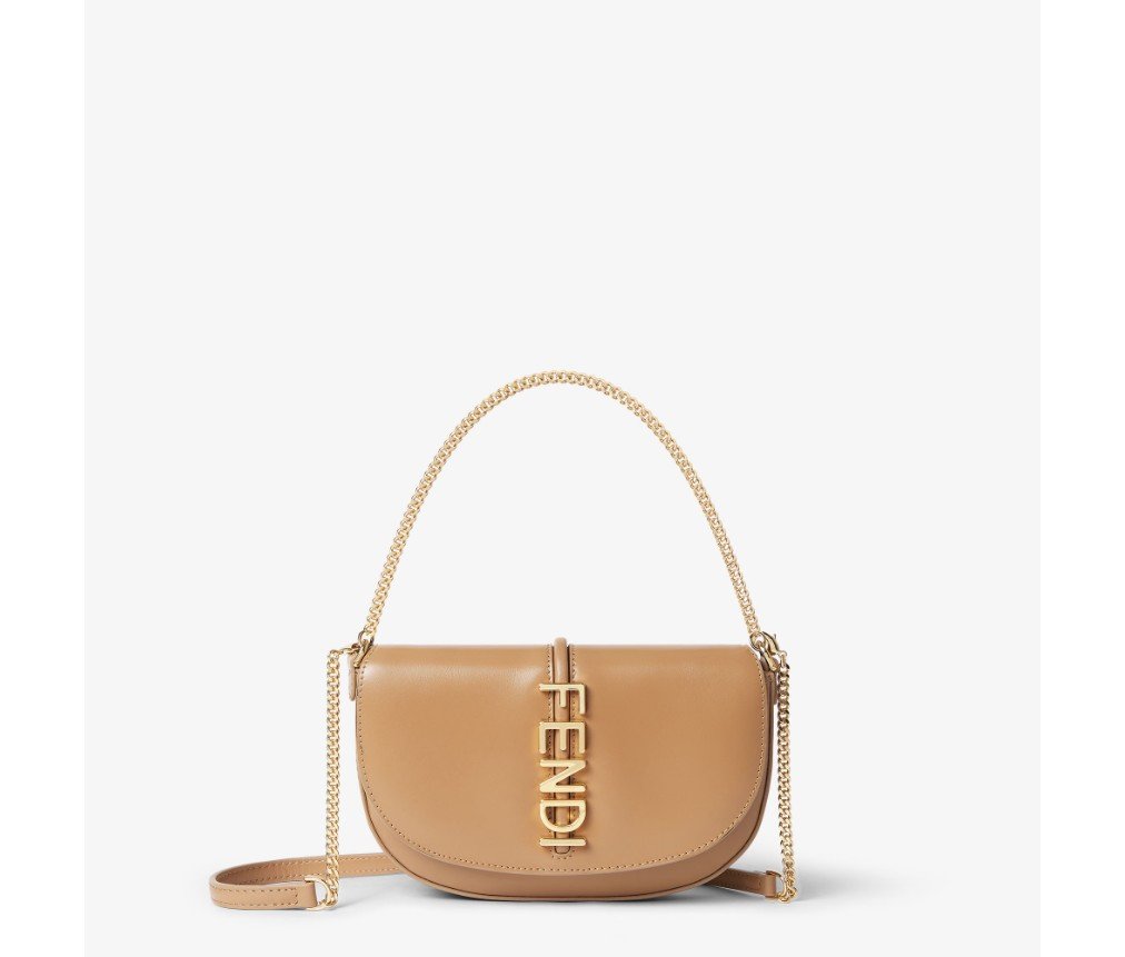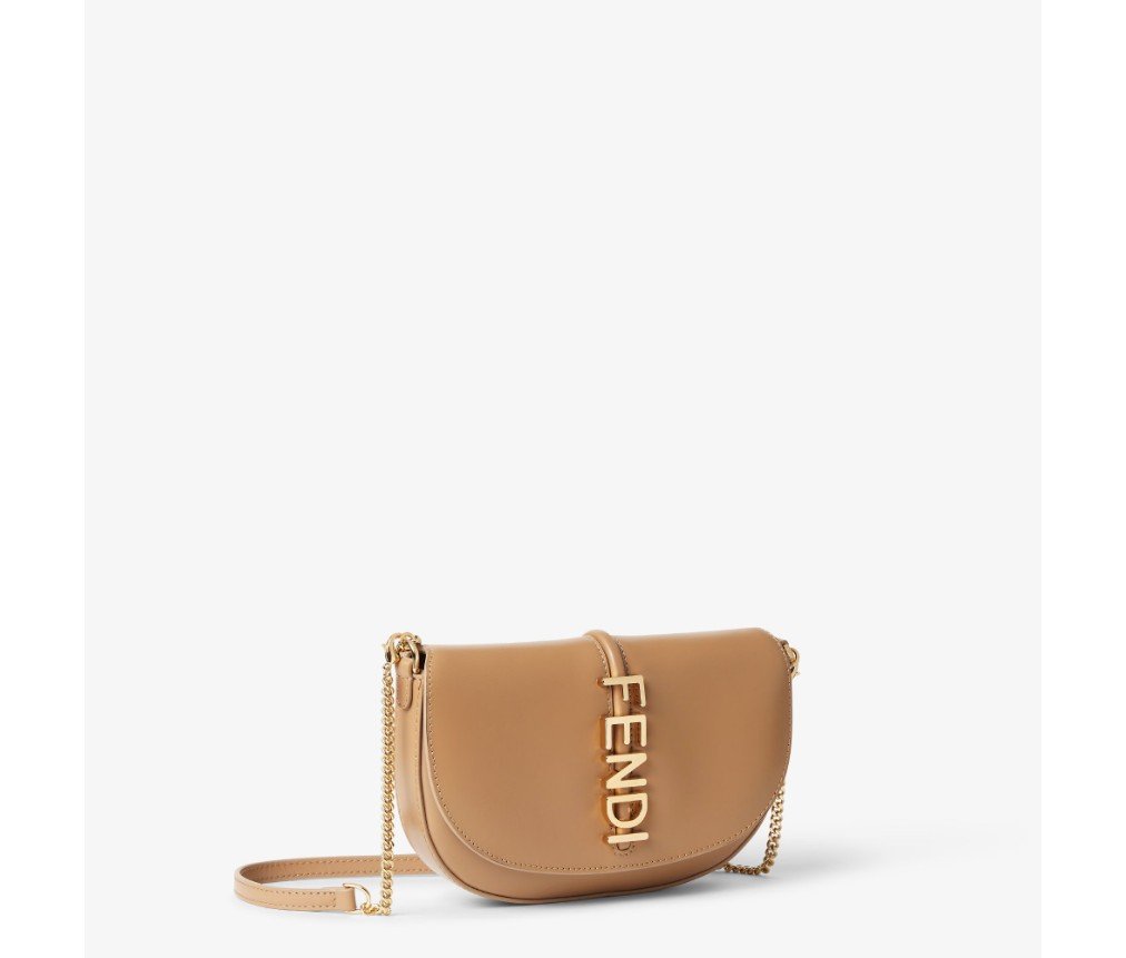 펜디그래피 플랩 지갑(펜디 레터링 메탈 장식). 안감 처리된 내부 수납공간과 네 개의 카드 슬롯이 특징입니다. 짧고 얇은 체인 숄더 스트랩과 가죽 및 체인 소재의 탈부착 가능한 두 번째 숄더 스트랩이 있습니다. 광택 있는 카푸치노 색상의 가죽 소재로 제작되었으며, 골드 마감 메탈 장식이 특징입니다.