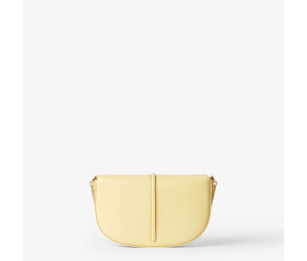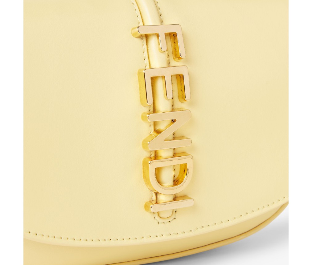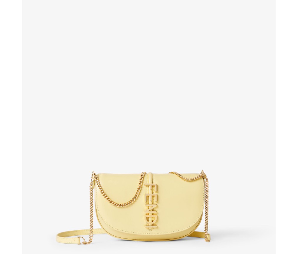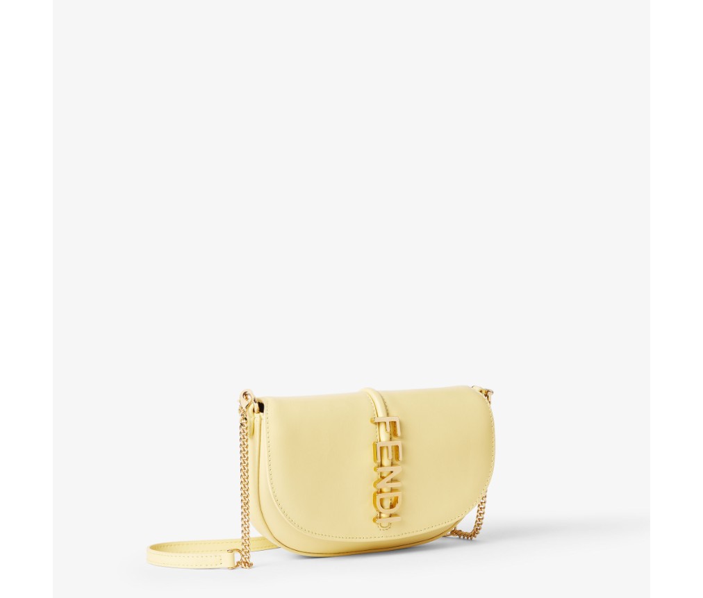 펜디그래피 플랩 지갑. 메탈 펜디 레터링으로 장식되어 있습니다. 안감 처리된 내부 수납공간과 카드 슬롯 4개가 특징입니다. 짧고 얇은 체인 숄더 스트랩과 가죽 및 체인 소재의 탈부착 가능한 두 번째 숄더 스트랩이 있습니다. 광택 있는 노란색 가죽 소재로 제작되었으며, 골드 마감 메탈 장식이 특징입니다.