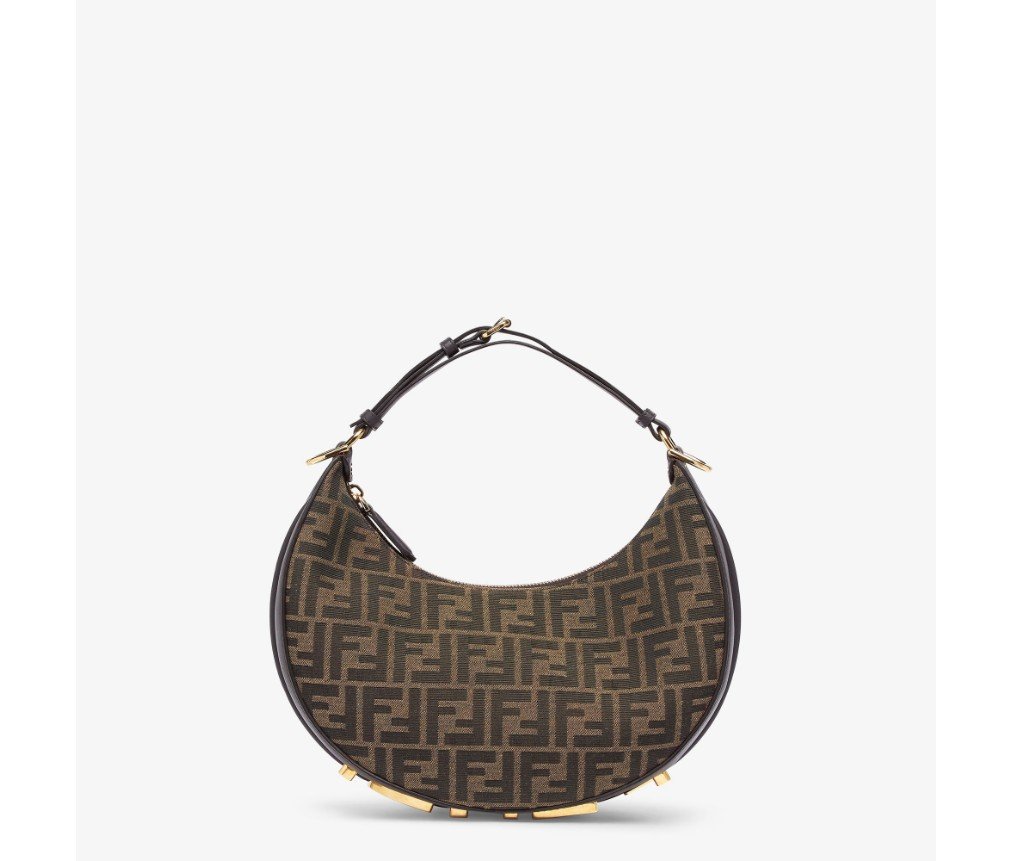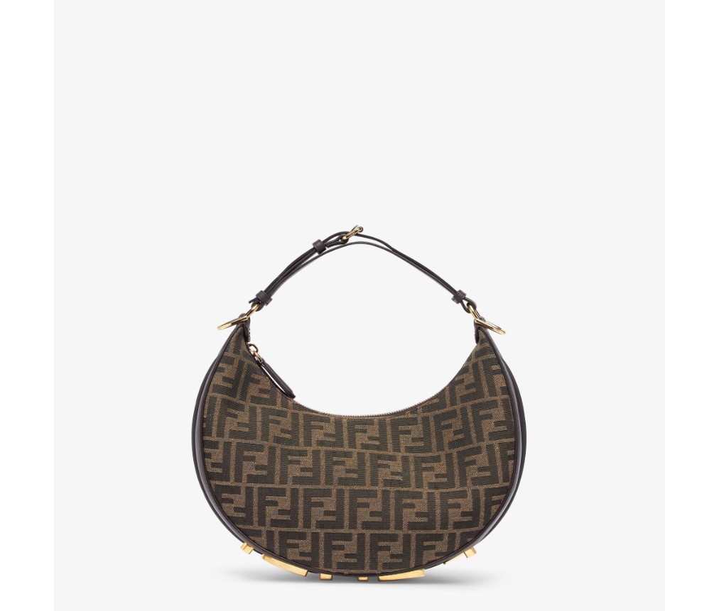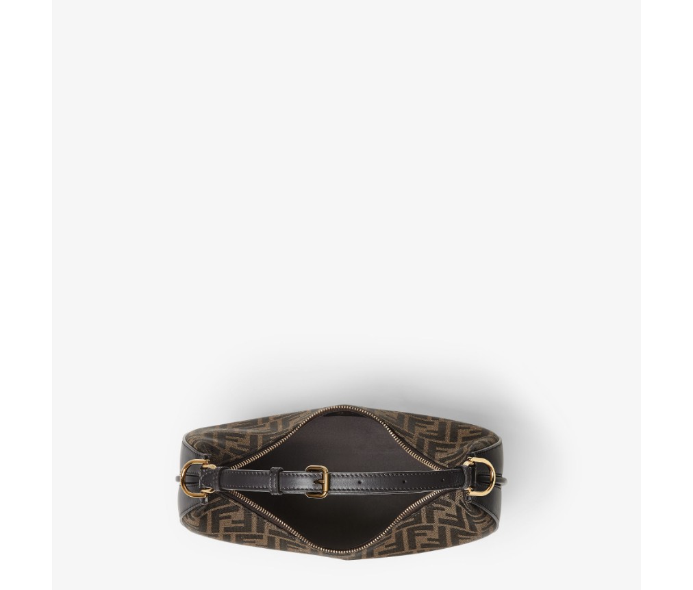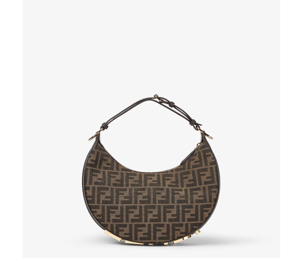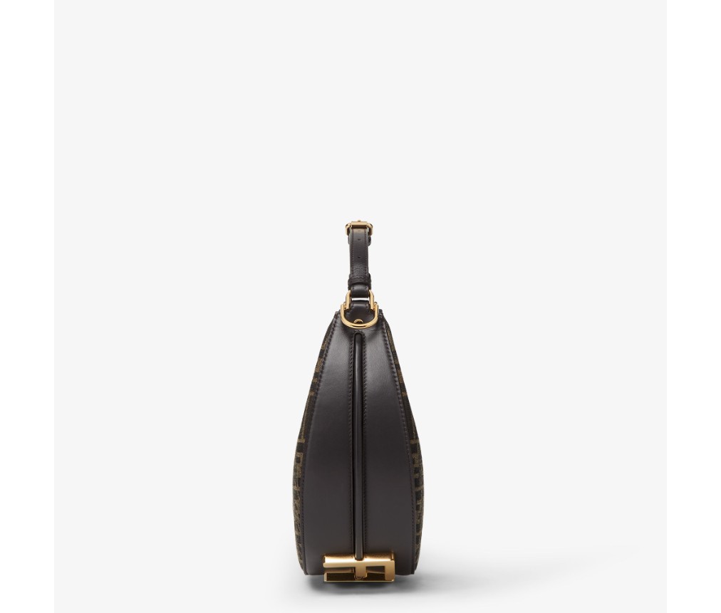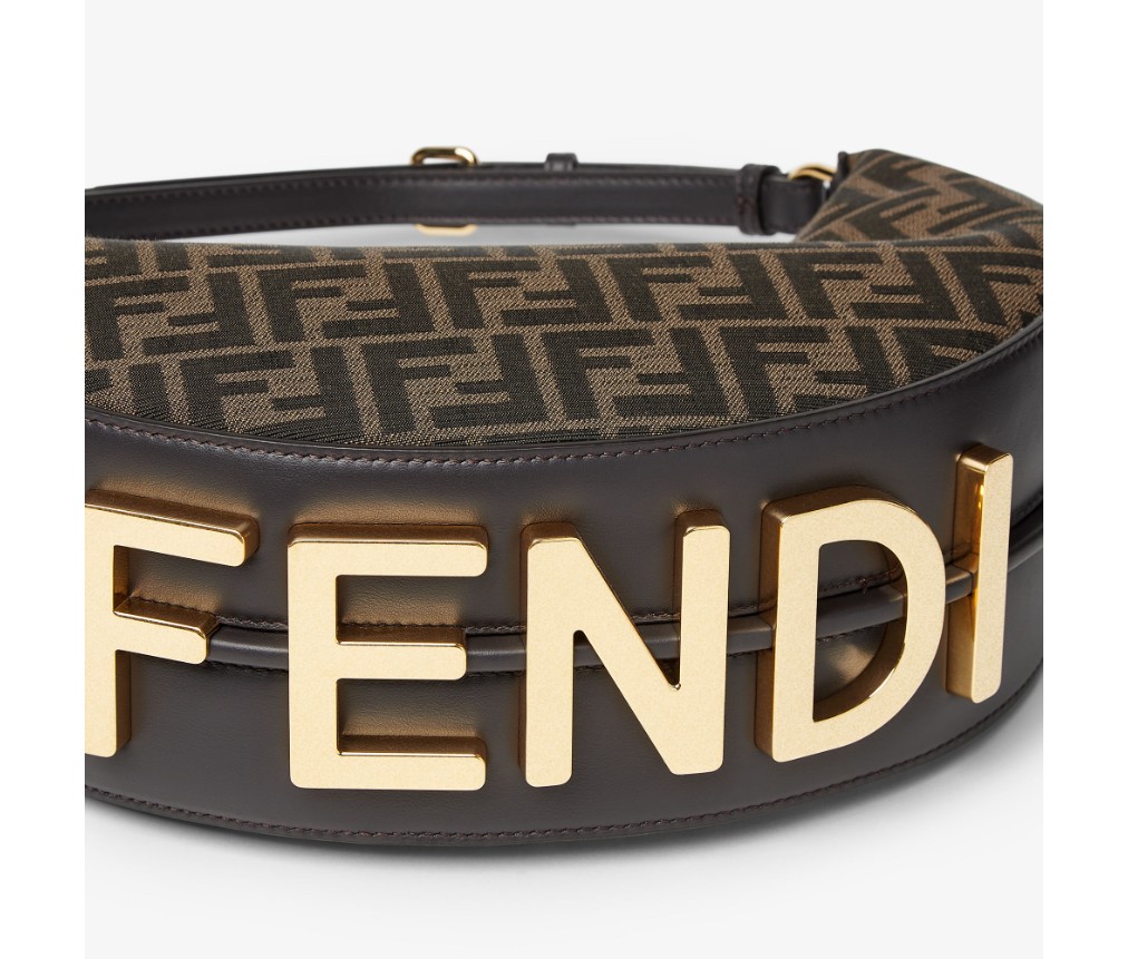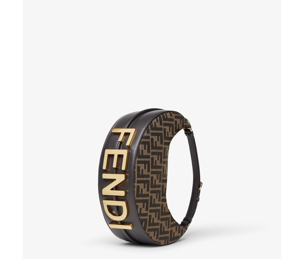 갈색의 상징적인 FF 모티프가 있는 자카드 원단으로 제작되었으며, 밑면에 빈티지 골드 마감 금속 펜디 문자가 장식되어 있으며, 팔 아래에 가방을 착용하면 보입니다.