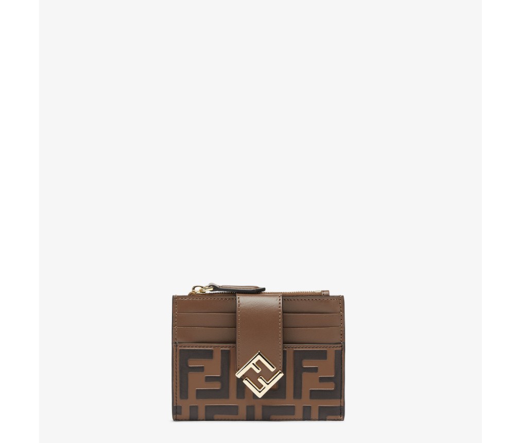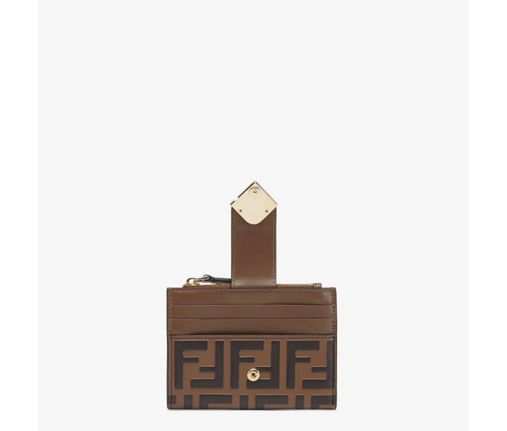 잠금장치에 대각선 FF 로고가 새겨진 FF 다이아몬드 카드 케이스. 플랫 지퍼 동전 지갑 수납공간과 네 개의 카드 슬롯. 브라운 송아지 가죽 소재에 블랙 FF 로고가 양각으로 새겨져 있습니다. 골드 마감 메탈 장식.