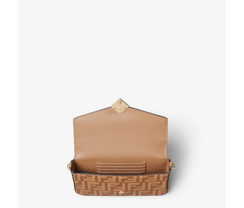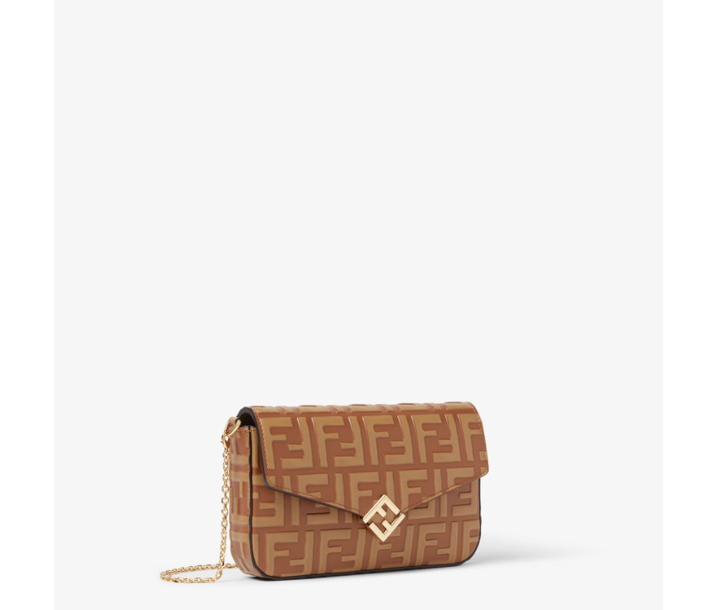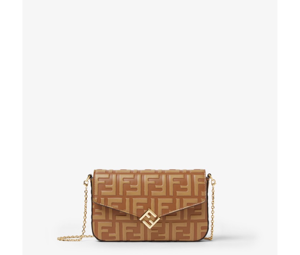 기하학적인 플랩과 대각선 FF 로고가 돋보이는 FF 다이아몬드 컴팩트 지갑입니다. 내부 수납공간에는 카드 슬롯 4개가 있습니다. 얇은 탈부착 가능한 체인 숄더 스트랩이 있습니다. 송아지 가죽 소재에 황갈색과 연갈색 FF 모티프가 양각으로 새겨져 있습니다. 골드 마감 메탈 장식이 특징입니다.