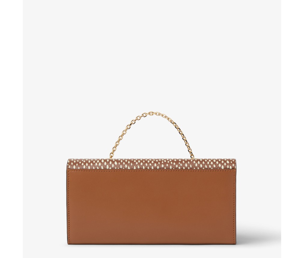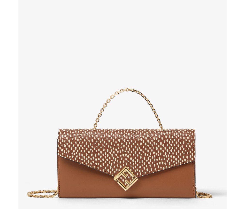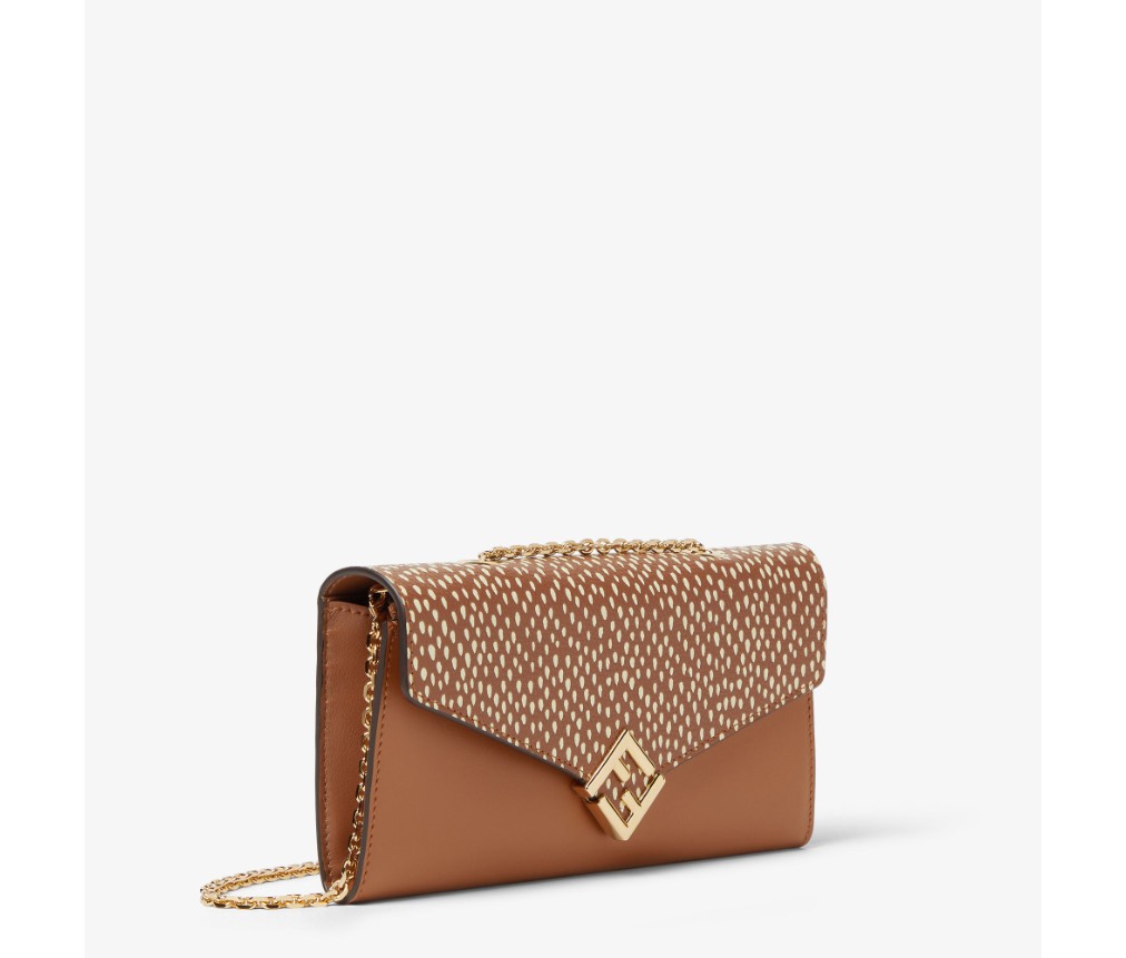 기하학적 플랩과 대각선 FF 로고가 돋보이는 FF 다이아몬드 지갑입니다. 내부에는 카드 슬롯 6개와 지퍼 포켓이 있는 거싯 수납공간이 있습니다. 손잡이와 탈착식 얇은 체인 숄더 스트랩이 있어 더욱 실용적입니다. 화이트 페퍼드 팔레나 모티프가 프린트된 브라운 송아지 가죽 소재로 제작되었습니다. 심플한 톤온톤 가죽 디테일과 골드 마감 메탈 장식이 특징입니다.