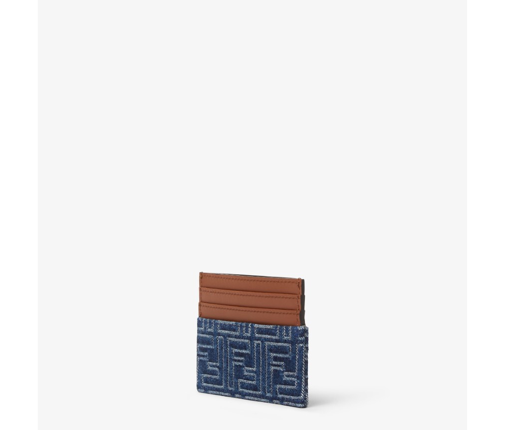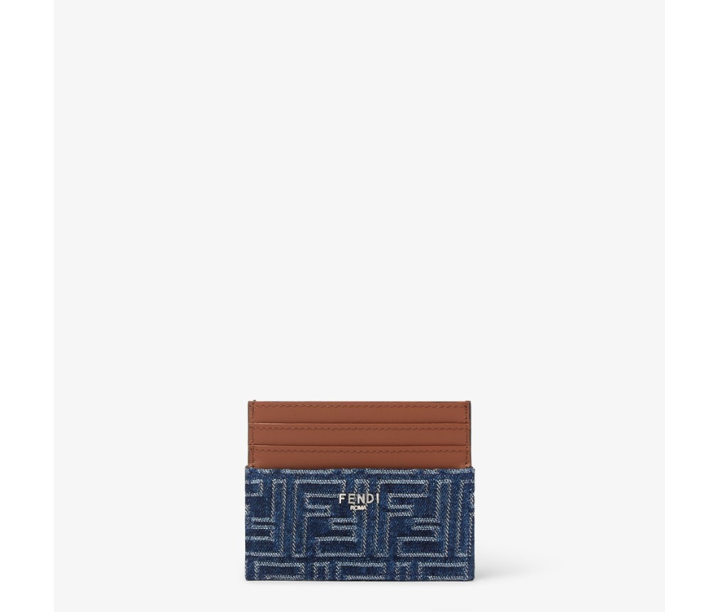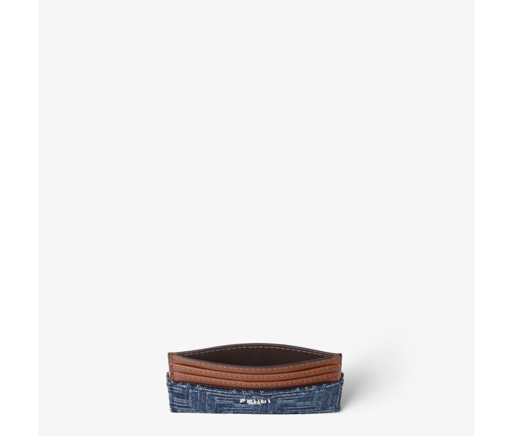 6개의 슬롯과 중앙 플랫 포켓이 있는 카드 홀더입니다. 블루 데님 효과의 FF 자카드 소재에 브라운 가죽 인서트가 더해졌습니다. 팔라듐 마감의 메탈 펜디 로마 로고가 특징입니다.