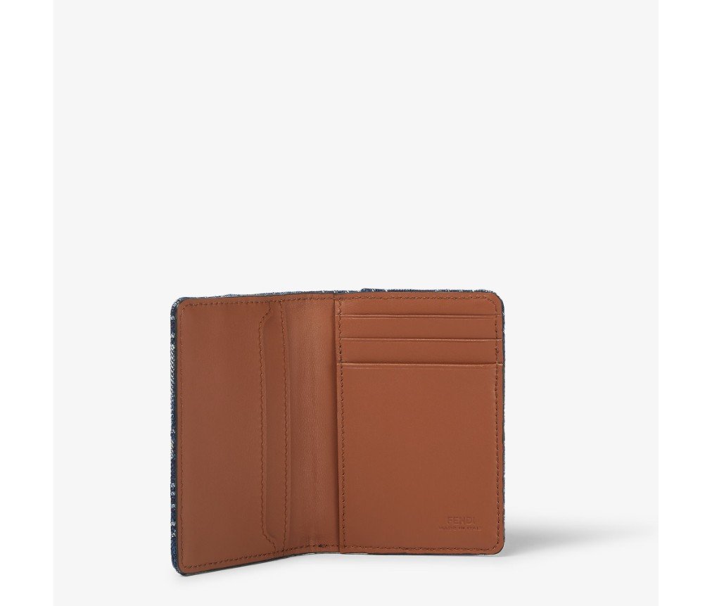 카드 슬롯 3개와 내부 플랫 포켓 3개, 뒷면 플랫 포켓 1개가 있는 컴팩트한 접이식 카드 홀더입니다. 블루 데님 효과의 FF 자카드 소재에 브라운 가죽 디테일이 더해졌습니다. 팔라듐 마감의 메탈 펜디 로마 로고가 특징입니다.