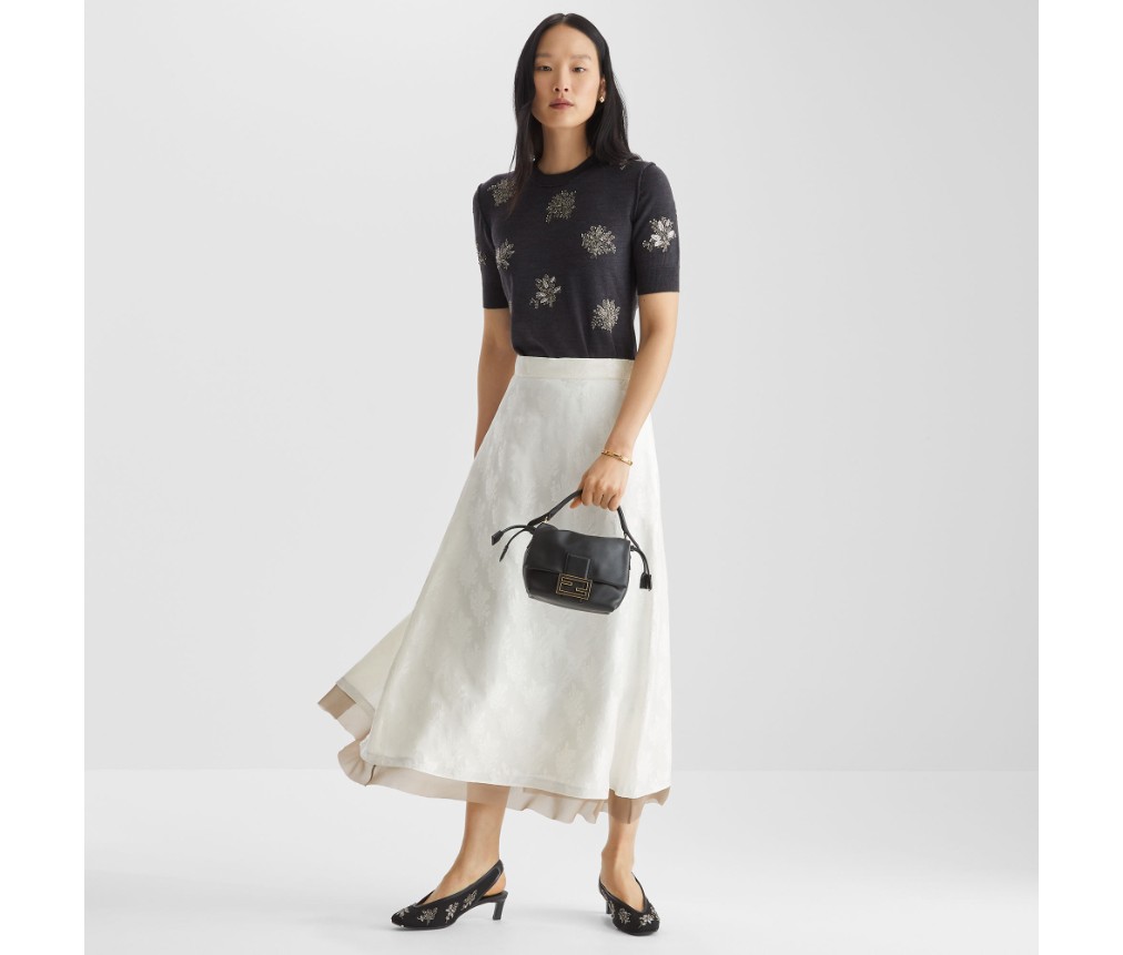 아이코닉 스몰 맘마 바게트 백은 1990년대 후반 아이코닉 바게트의 라지R 버전으로 디자인되어, 그 이름도 맘마 바게트입니다. 2025년 봄/여름 패션쇼를 위해 부드럽고 해체적인 룩으로 업데이트되었지만, 가방의 오리지널 요소는 그대로 유지했습니다.