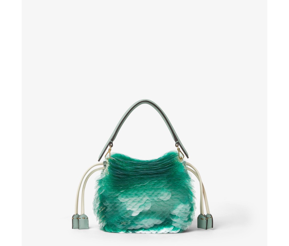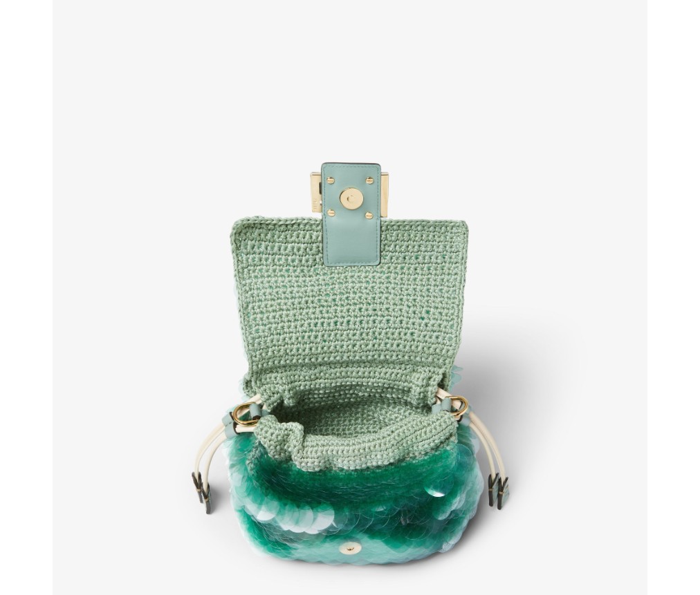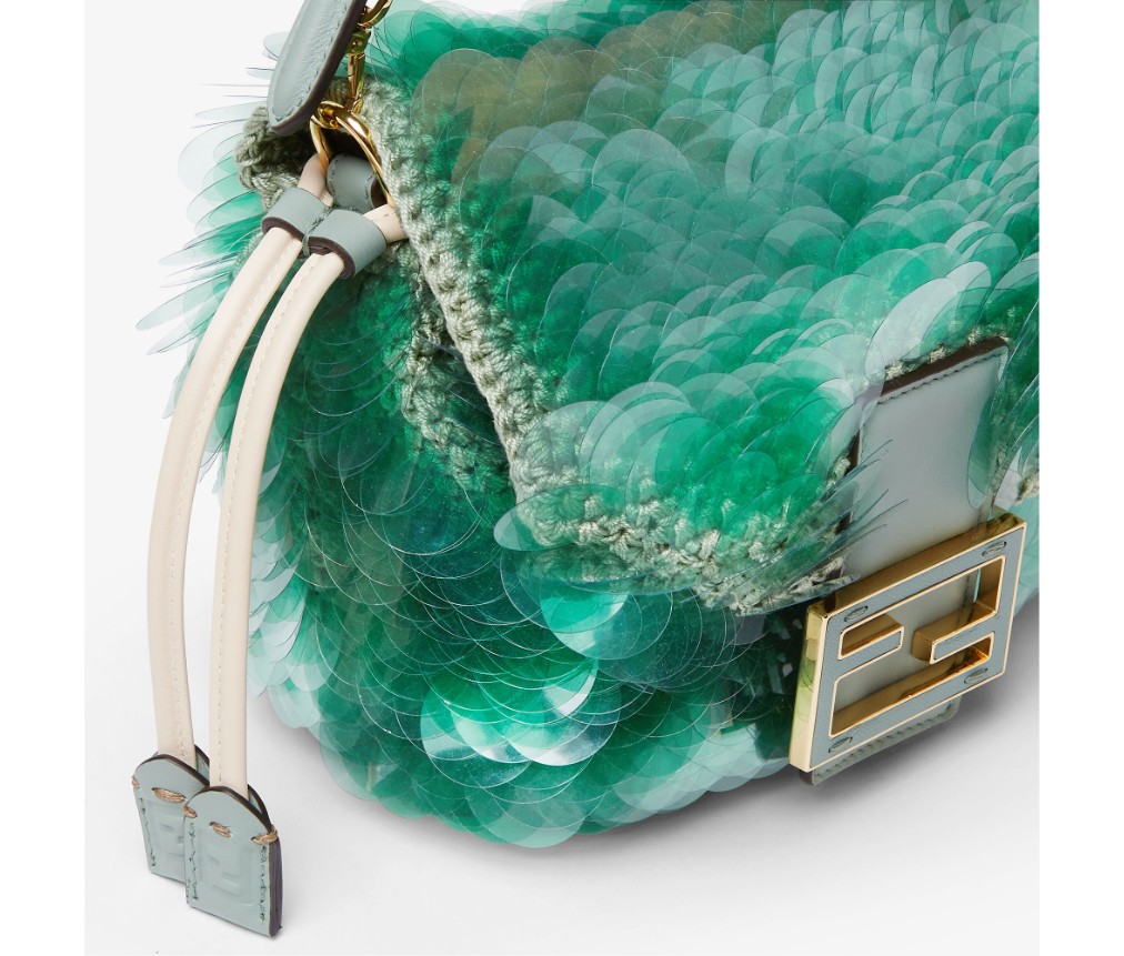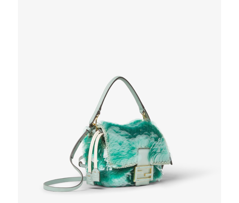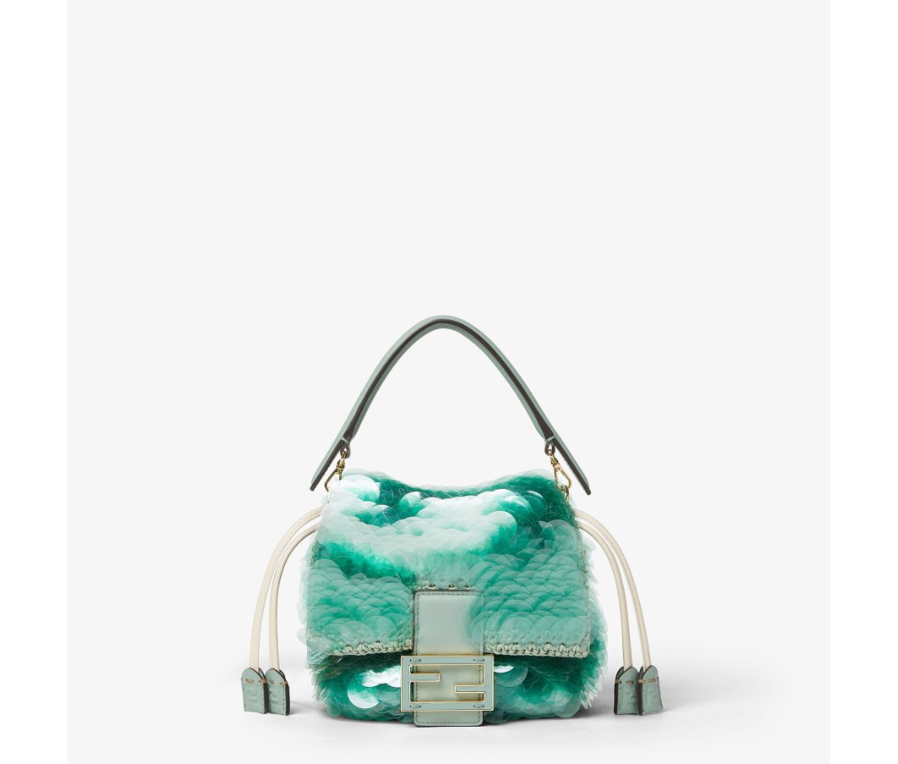 크로셰 모티브로 손수 놓은, 4000개 이상의 민트 그린 스팽글로 장식된, 톤온톤 송아지 가죽 인서트가 있는 FF 잠금장치로 장식된 제품입니다.