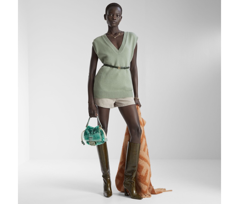 아이코닉 스몰 맘마 바게트 백은 1990년대 후반 아이코닉 바게트의 라지R 버전으로 디자인되어, 그 이름도 맘마 바게트입니다. 2025년 봄/여름 패션쇼를 위해 부드럽고 해체적인 룩으로 업데이트되었지만, 가방의 오리지널 요소는 그대로 유지했습니다.