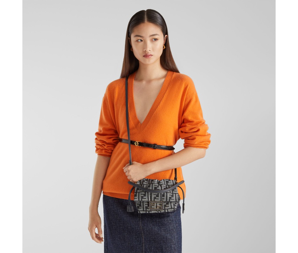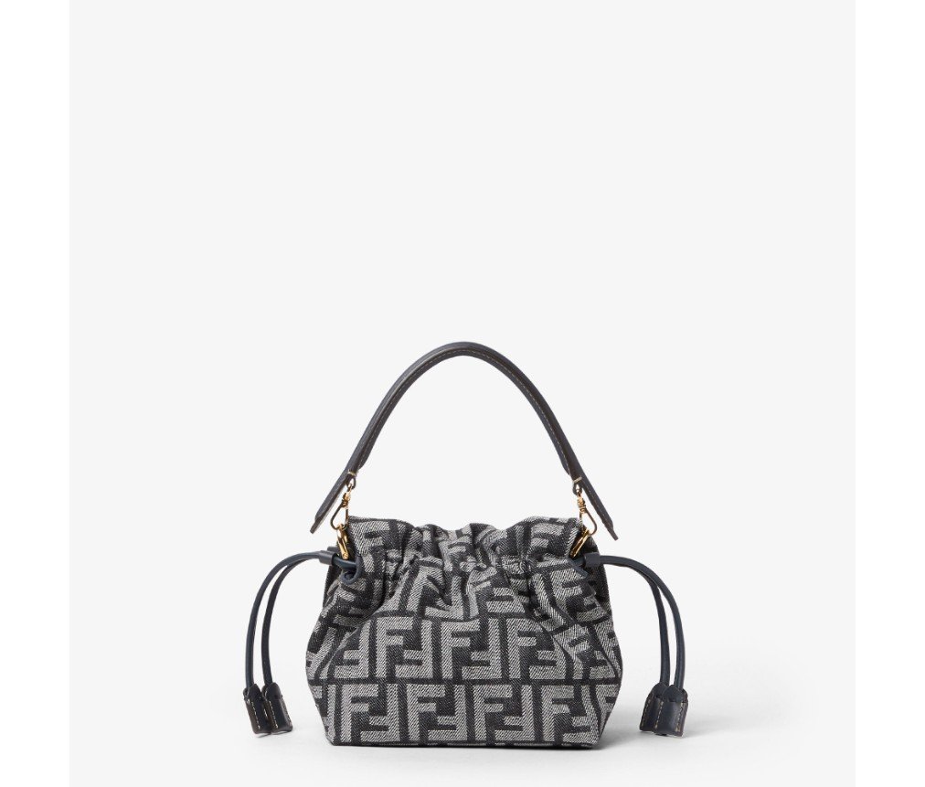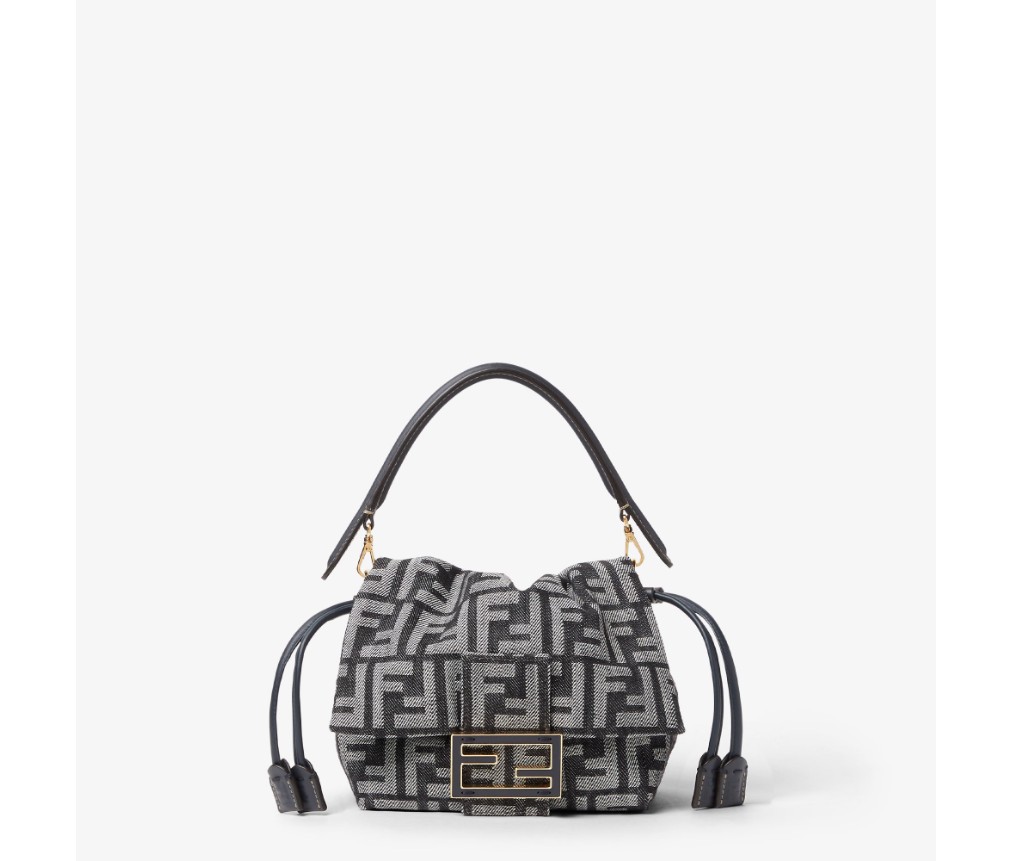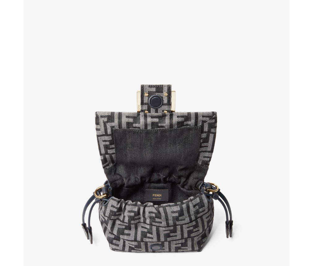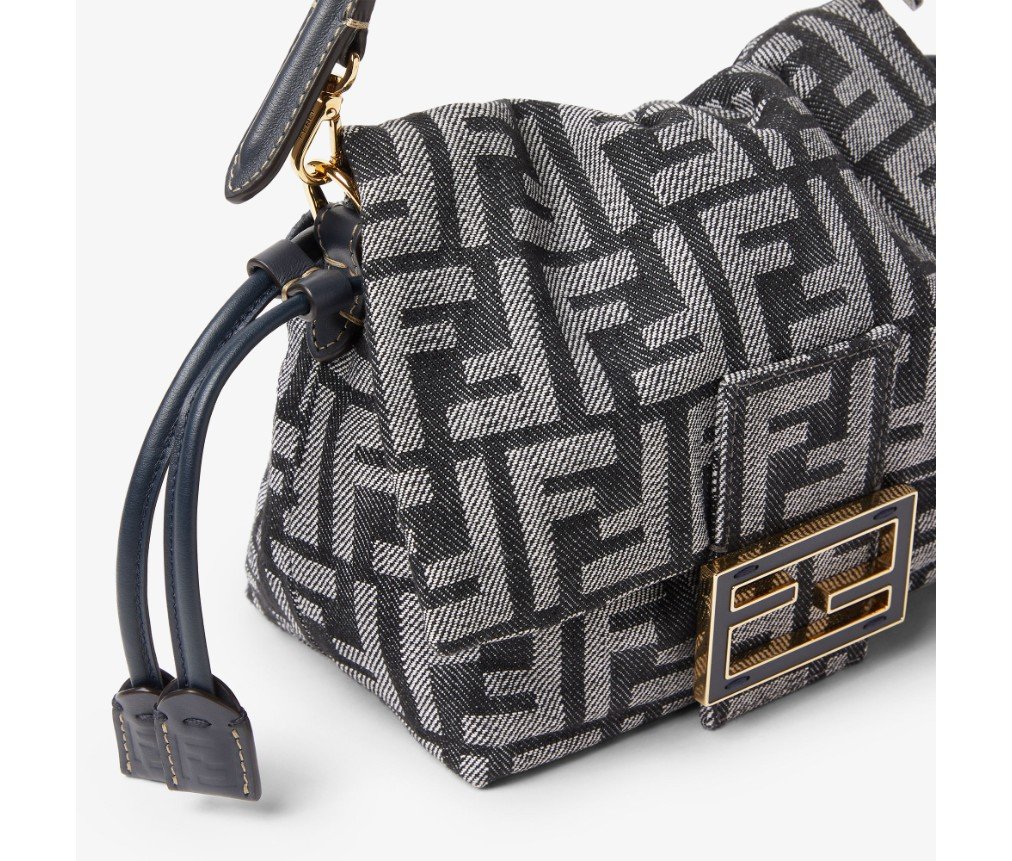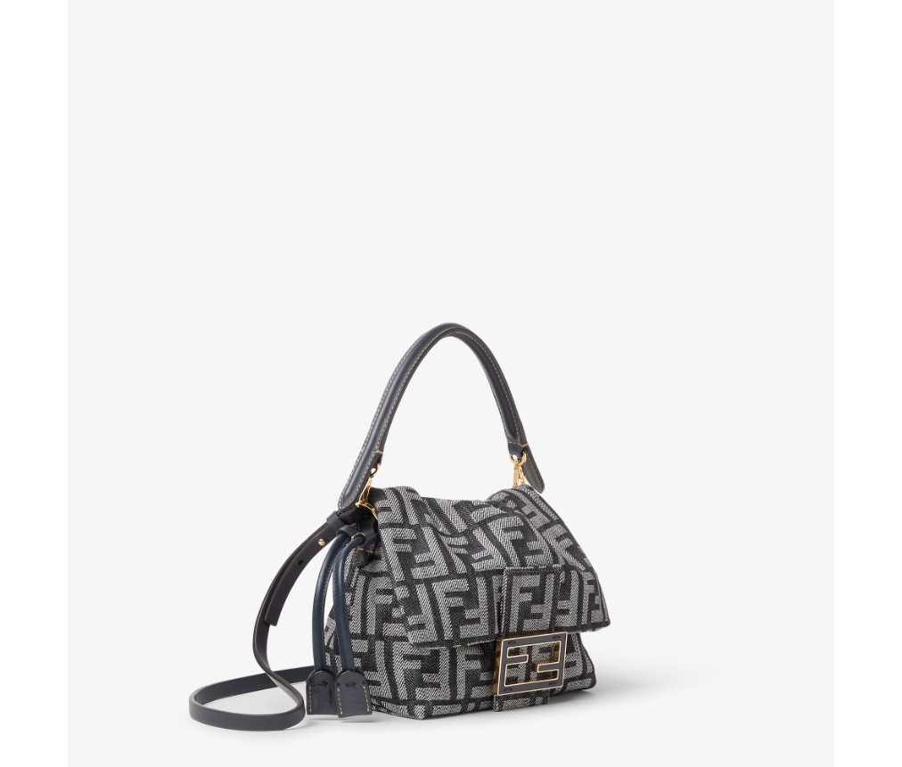 진한 파란색 데님 효과의 FF 자카드 소재로 제작되었으며, 검은색 가죽 인서트가 있는 FF 클래스프로 장식되었습니다.