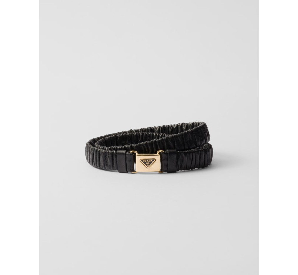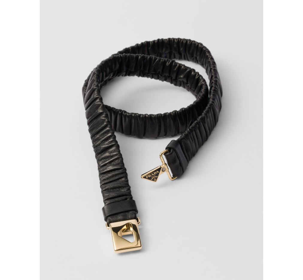 이 벨트의 세련된 디자인은 삼각형 로고로 장식된 우아한 버클과 드레이프 가죽의 부드러운 촉감이 결합되었습니다.