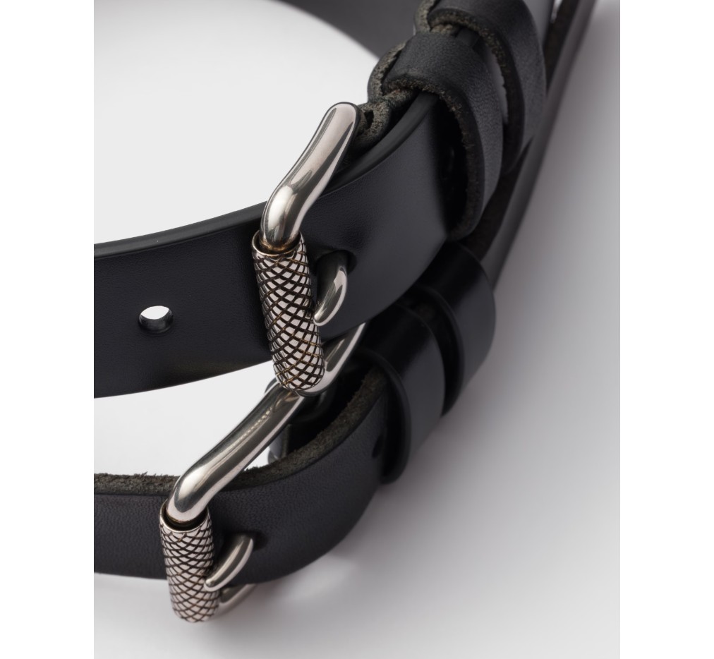 미니멀한 라인과 현대적인 디테일이 돋보이는 이 가죽 벨트는 독창적인 디자인을 자랑합니다. 더블 메탈 버클이 특징인 이 스타일은 액세서리에 독특하고 다재다능한 개성을 더합니다.