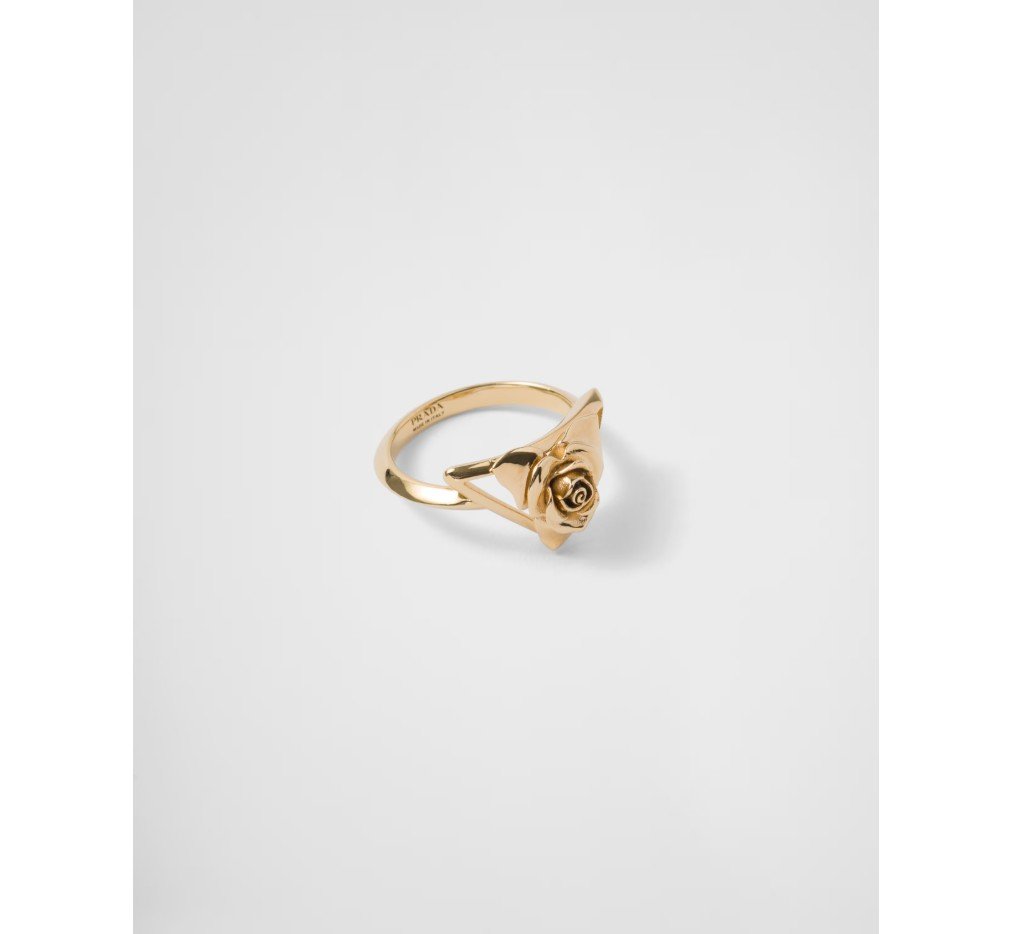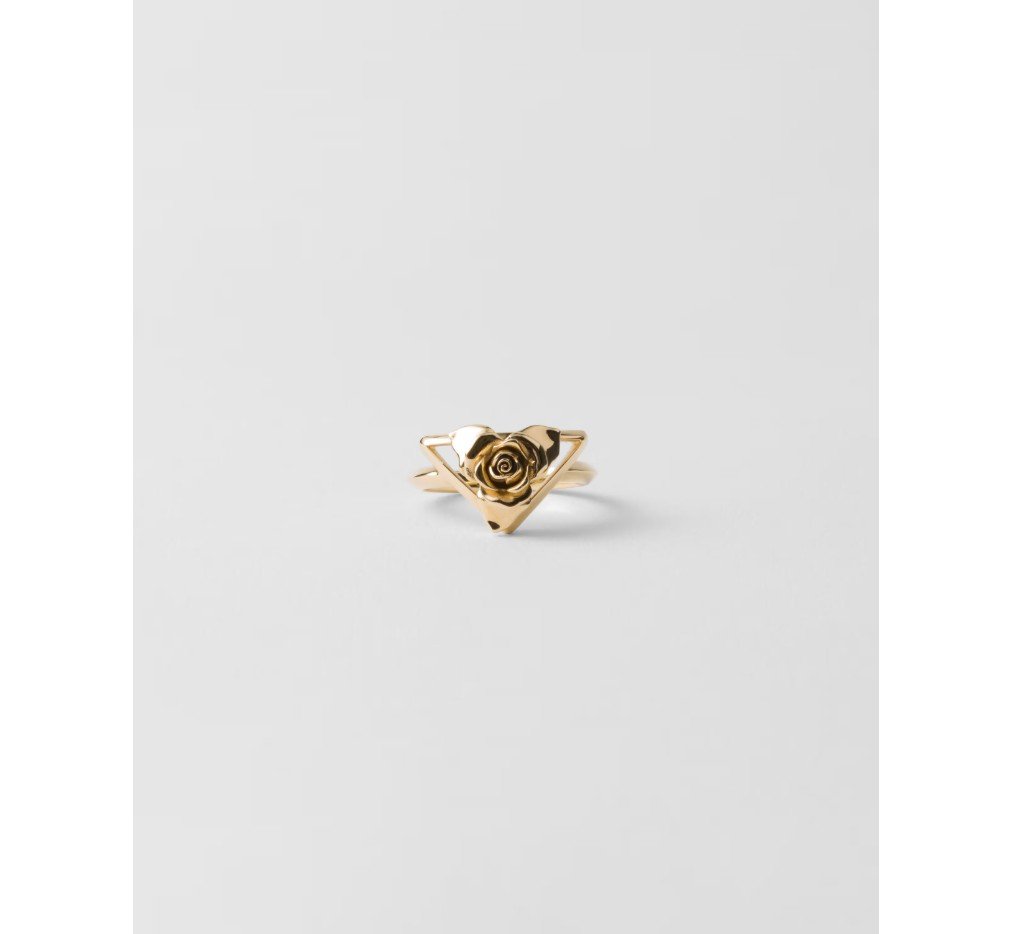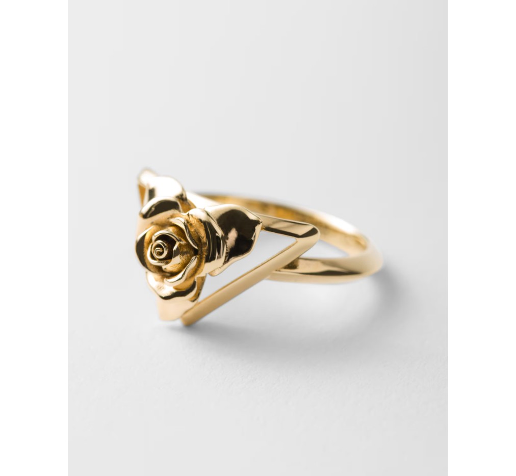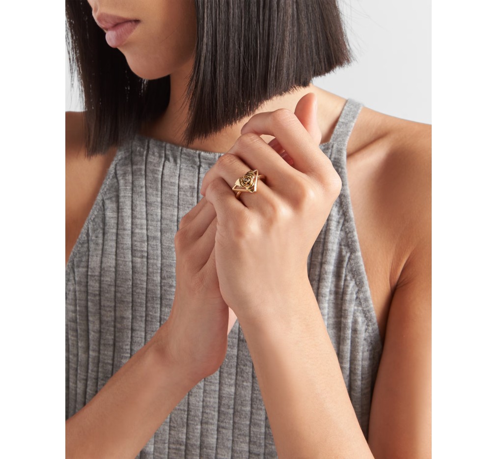 프라다 컬렉션의 상징적인 시그니처인 삼각형이 로맨틱하고 세련된 매력으로 재해석되어 이 메탈 링에 담겼습니다. 우아한 장미 실루엣으로 장식된 이 상징적인 기하학적 형태는 새로운 미적 감각을 표현합니다. – 제품 코드: 1IA010_2AR3_F0056